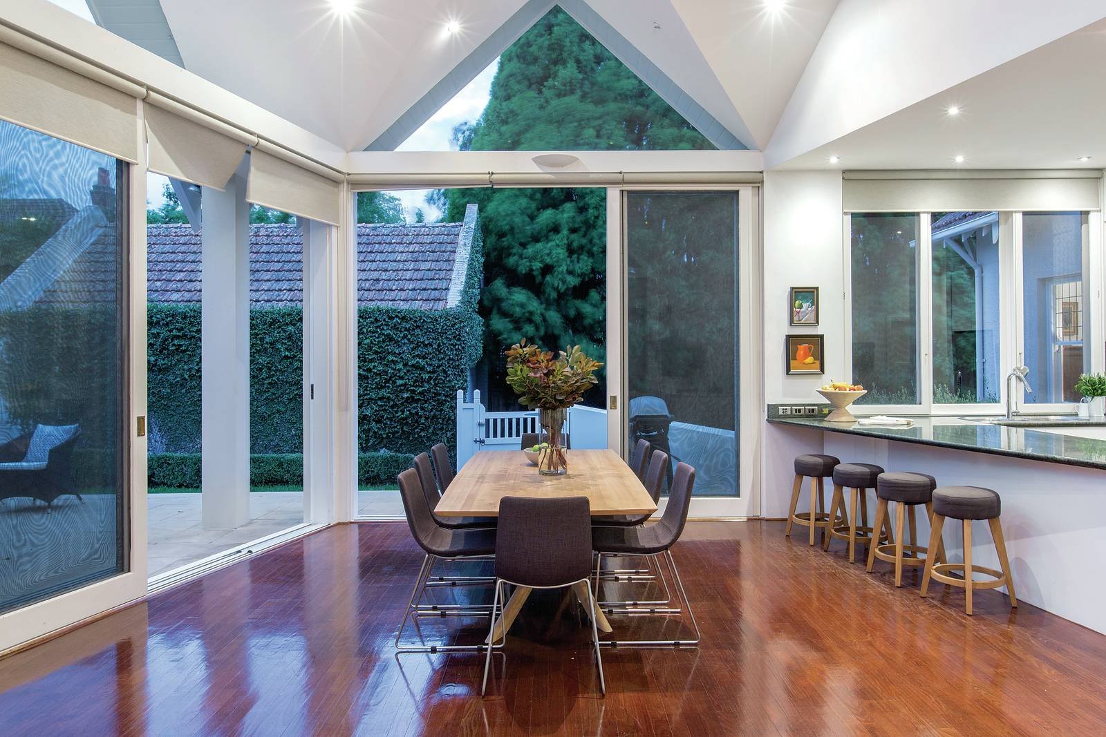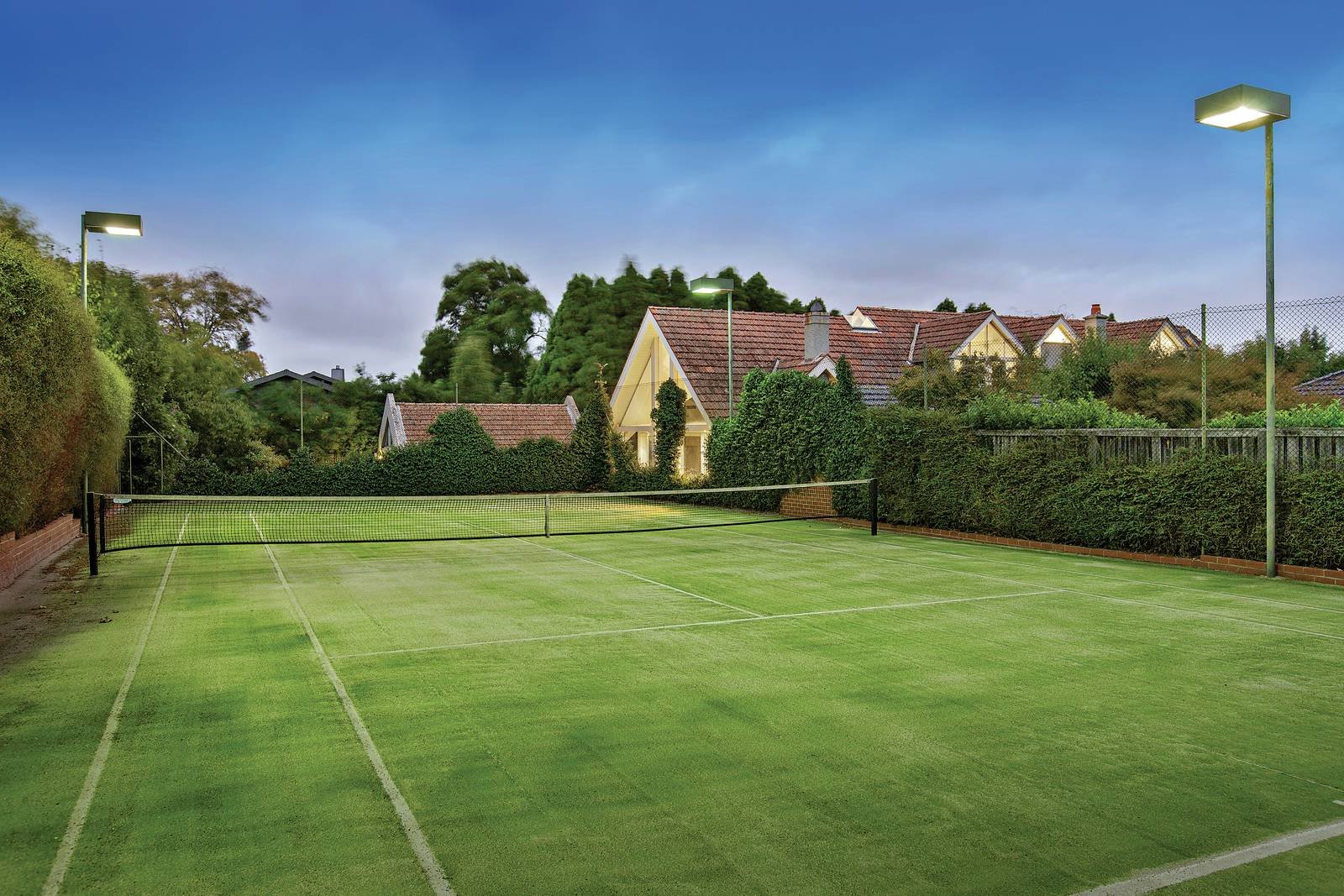 A wide welcoming verandah introduces a central reception hall, beautiful sitting room with open fireplace, a grand formal dining room and living/media room with open fireplace all boasting generous proportions and high ceilings. Soaring vaulted ceilings and vast expanses of glass allow northwestern light to stream through the expansive living and dining room with open fireplace and a spacious Bosch stone kitchen. Large glass sliders open the living areas to the deep private northwest facing garden and mod grass tennis court. The gorgeous main bedroom featuring a bay window, walk in robe and stylish en-suite and a fitted study are downstairs while a sensational children's zone upstairs comprises three additional double bedrooms with built in robes, a bright bathroom and large 5th bedroom or retreat.