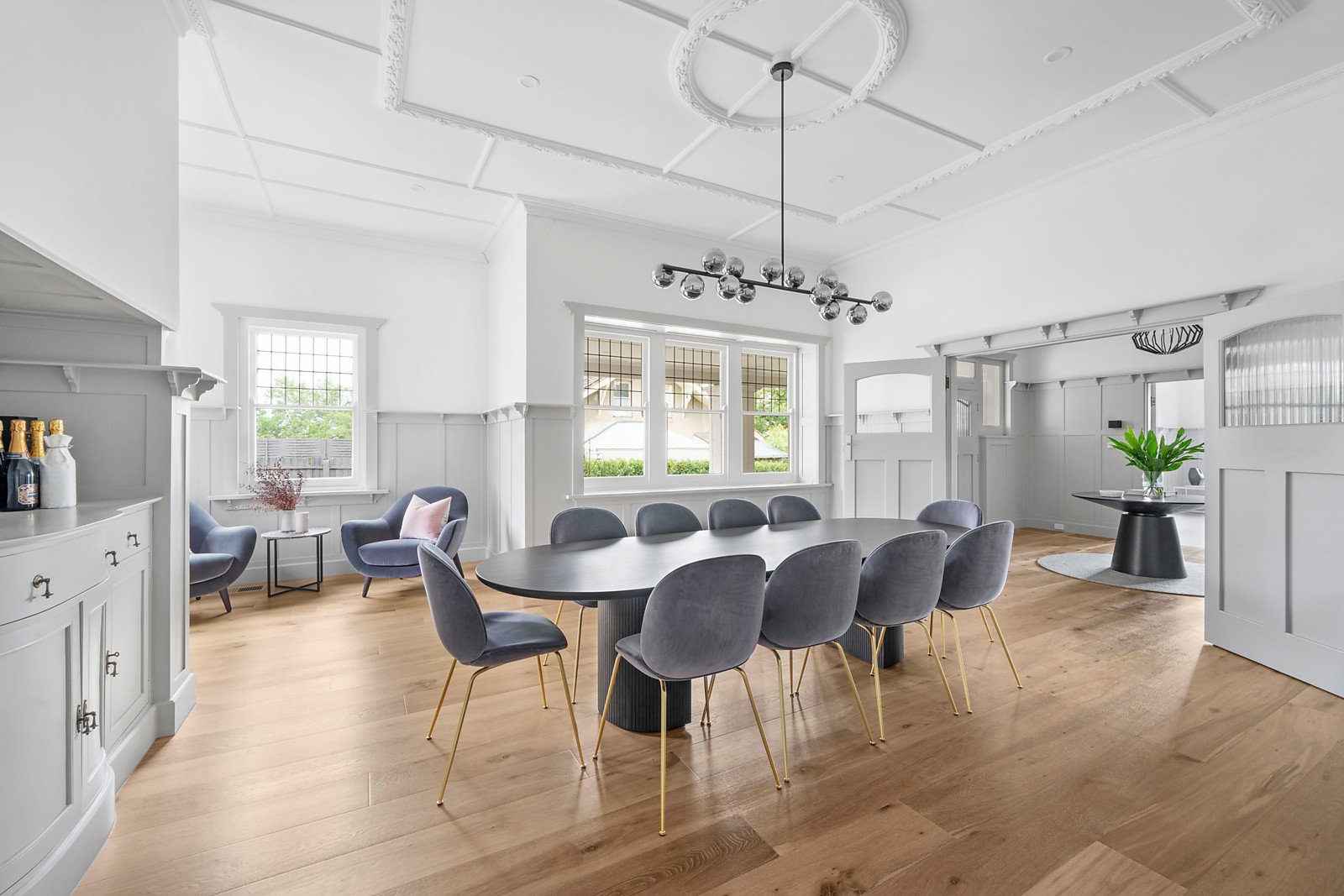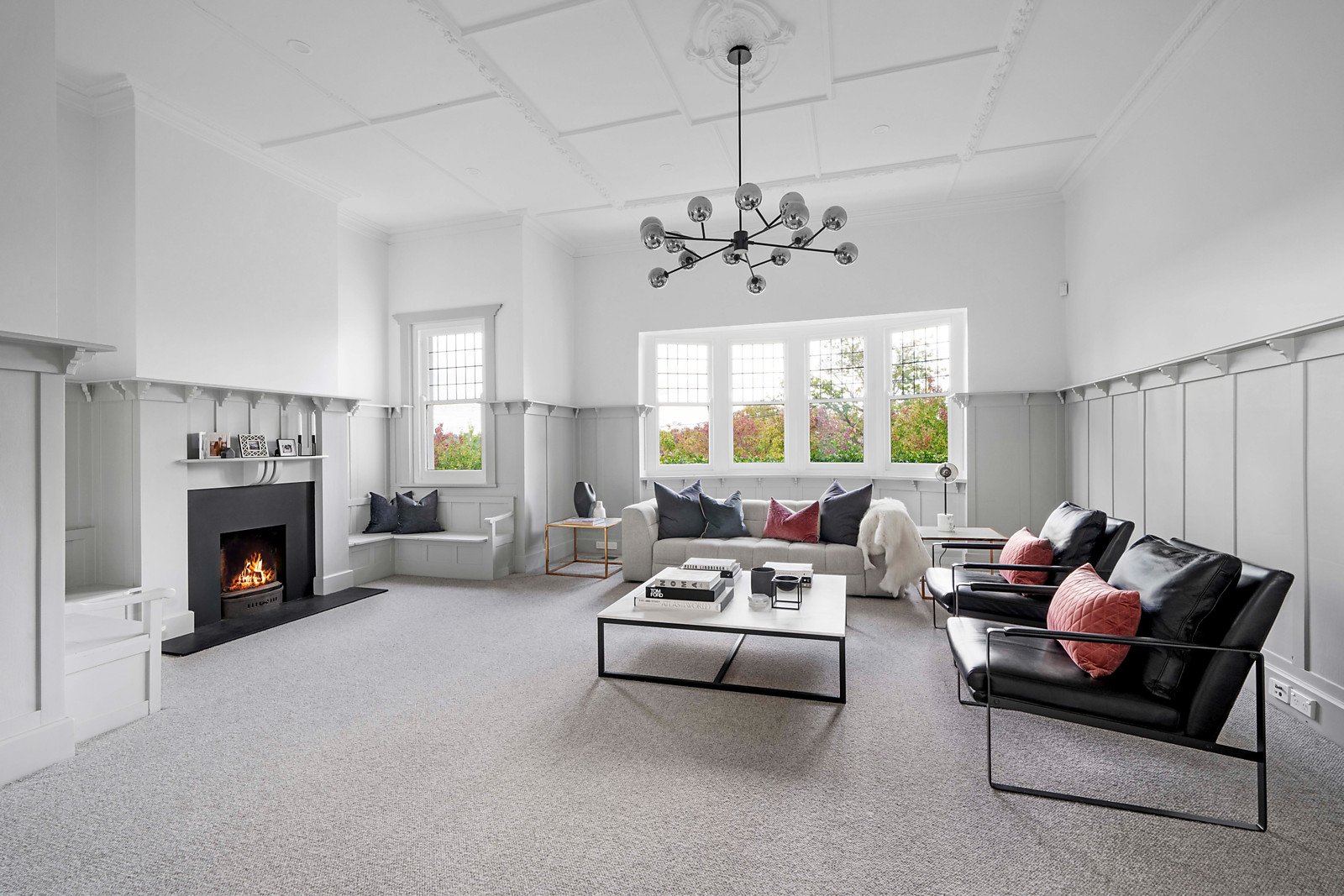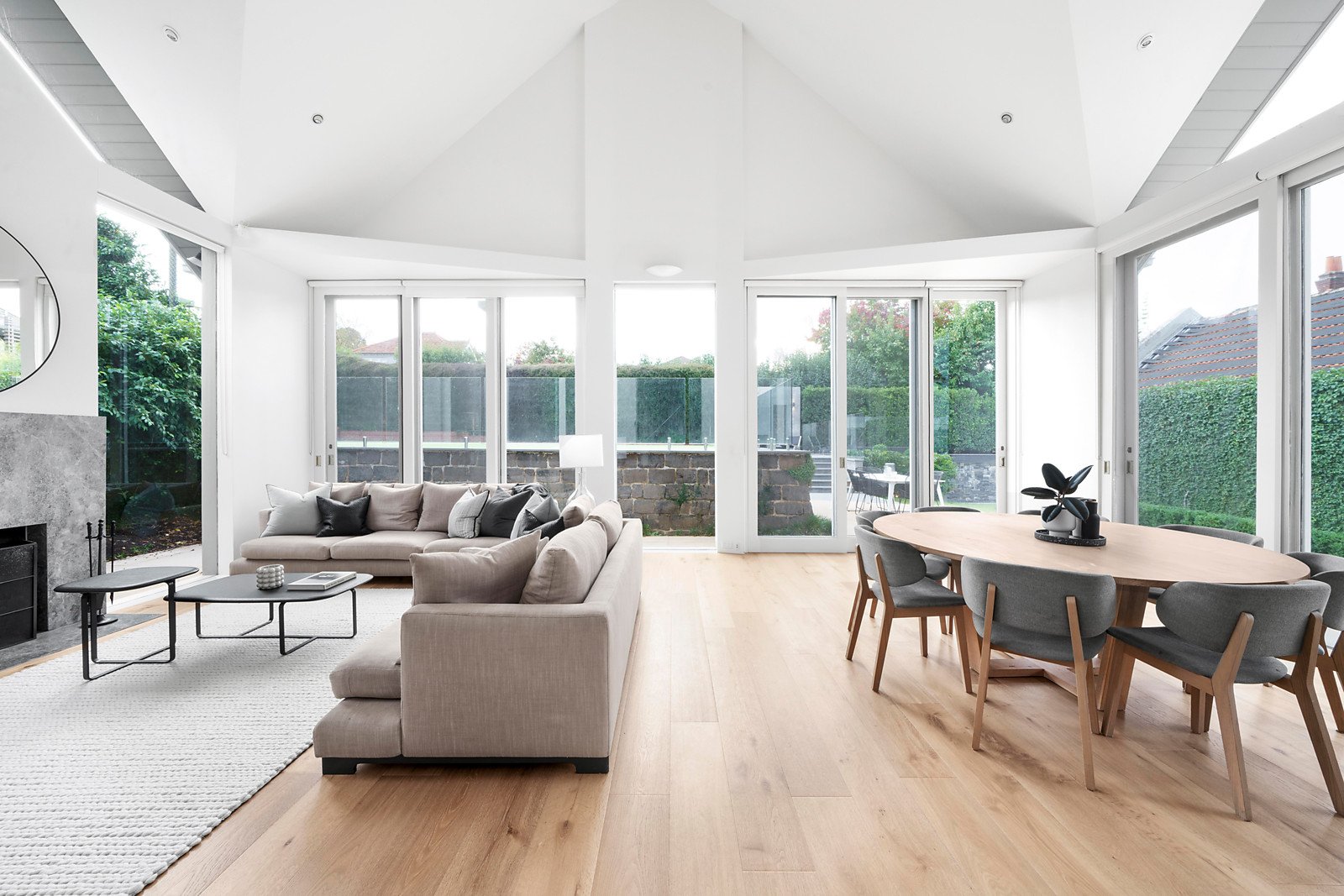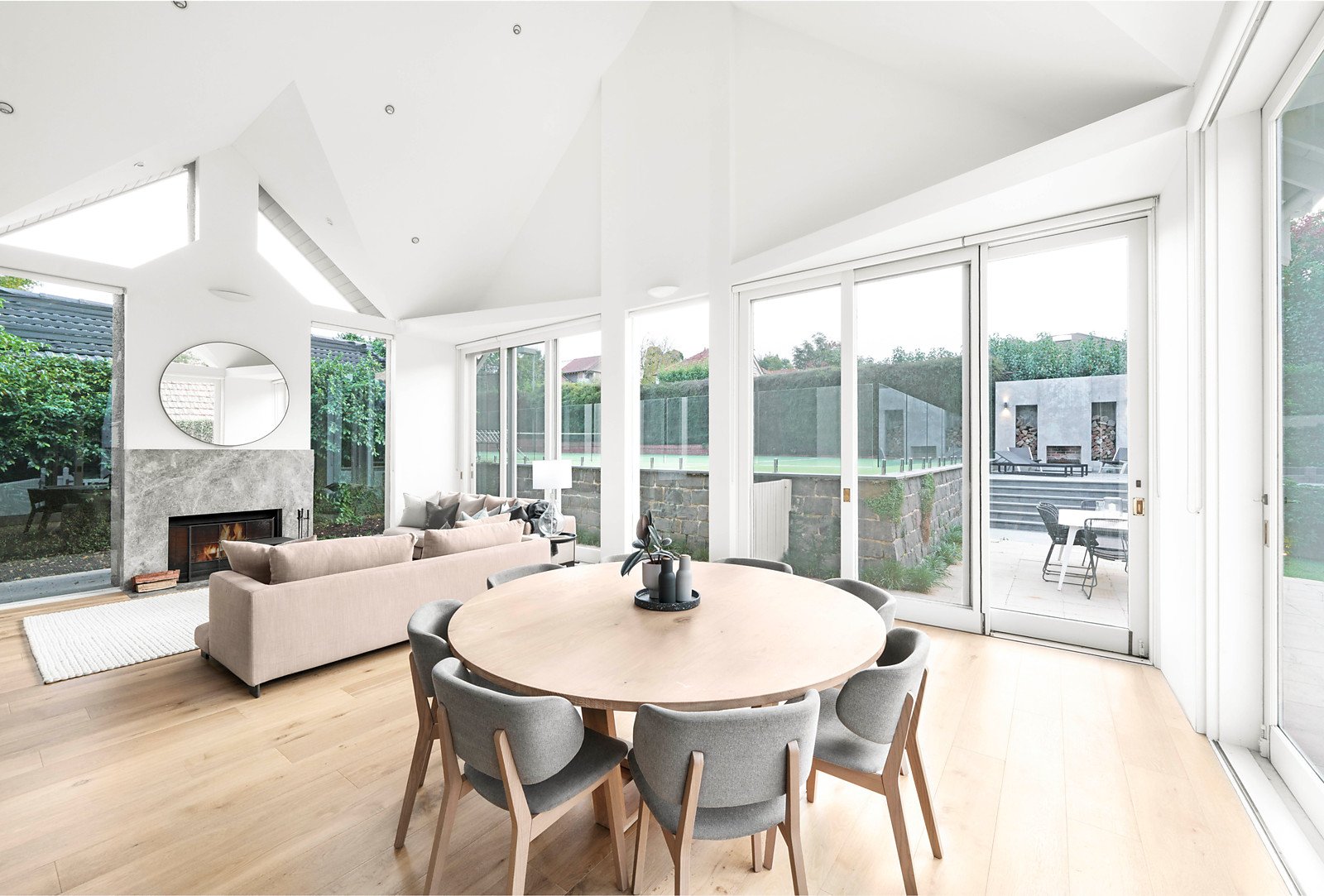 A wide welcoming verandah introduces a central reception hall, beautiful sitting room with open fireplace, a grand formal dining room and living/media room with open fireplace all boasting generous proportions and high ceilings. Soaring vaulted ceilings and vast expanses of glass allow north-western light to stream through the expansive living and dining room with open fireplace and a spacious open plan marble appointed kitchen.
