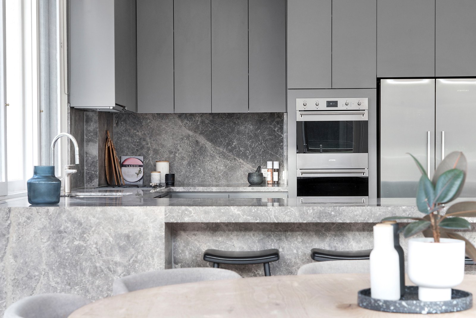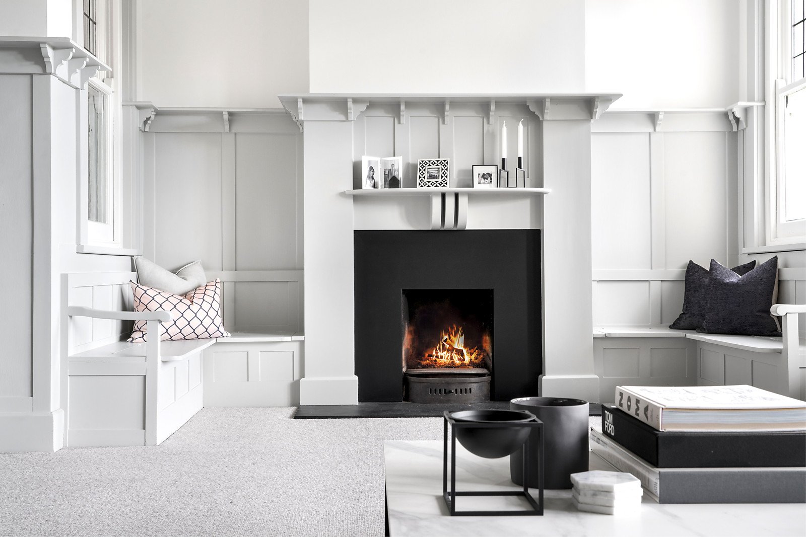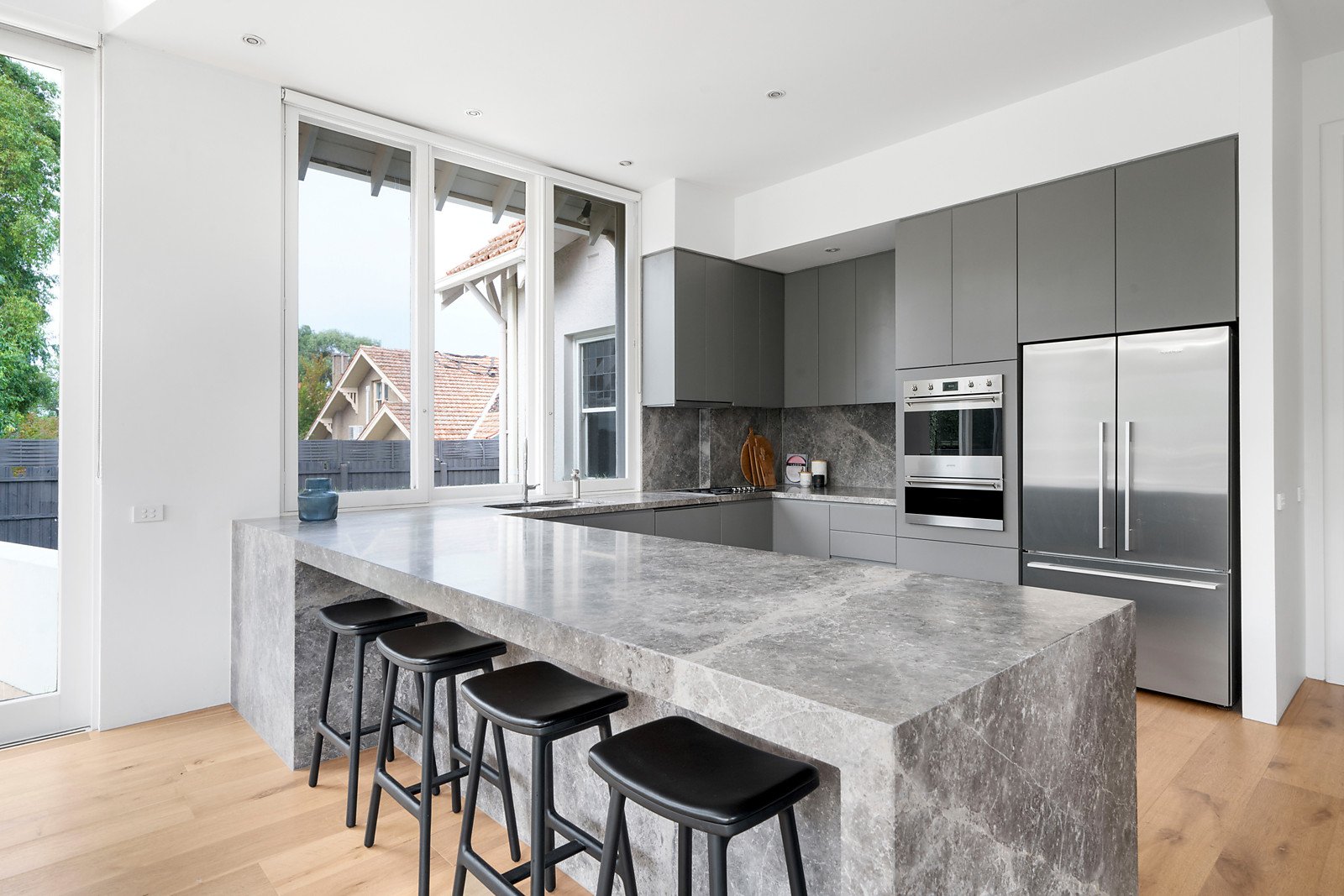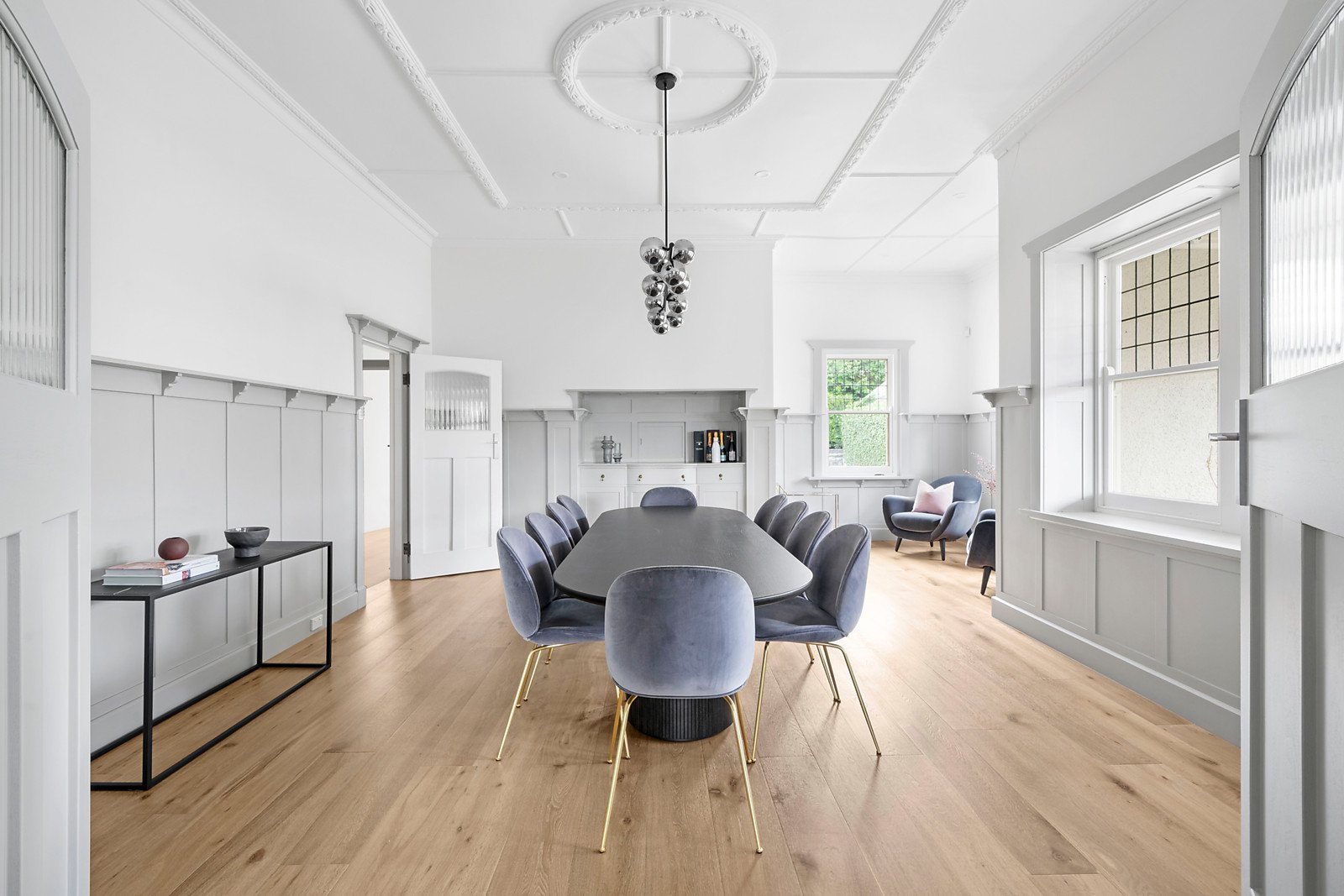 A wide welcoming verandah introduces a central reception hall, beautiful sitting room with open fireplace, a grand formal dining room and living/media room with open fireplace all boasting generous proportions and high ceilings. Soaring vaulted ceilings and vast expanses of glass allow north-western light to stream through the expansive living and dining room with open fireplace and a spacious open plan marble appointed kitchen.