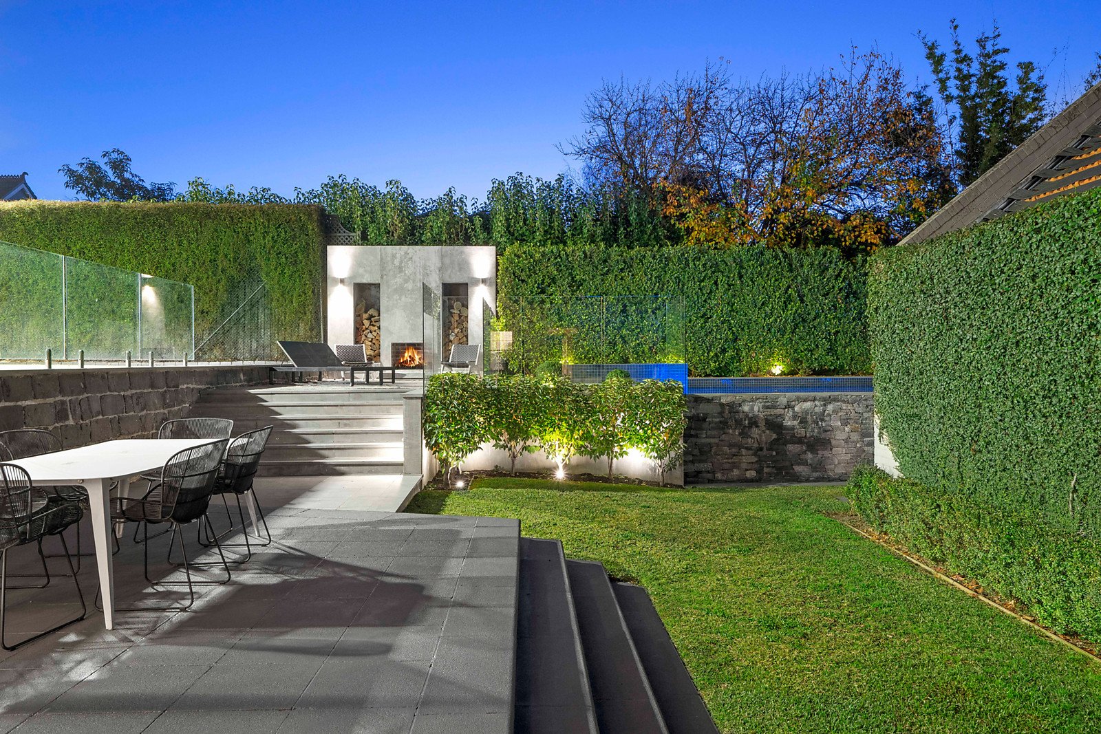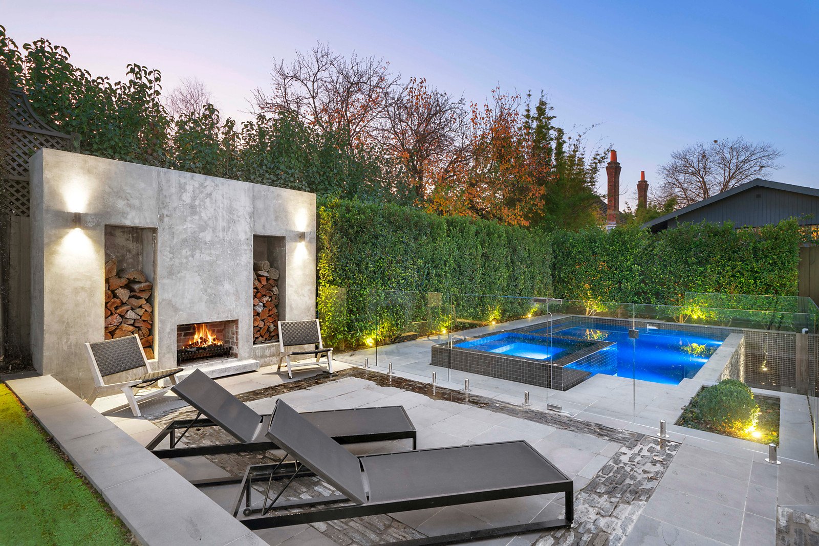 Large glass sliders open the living areas to the deep private northwest facing garden and mod grass tennis court, infinity edge pool, spa and outdoor entertainment area with fireplace.