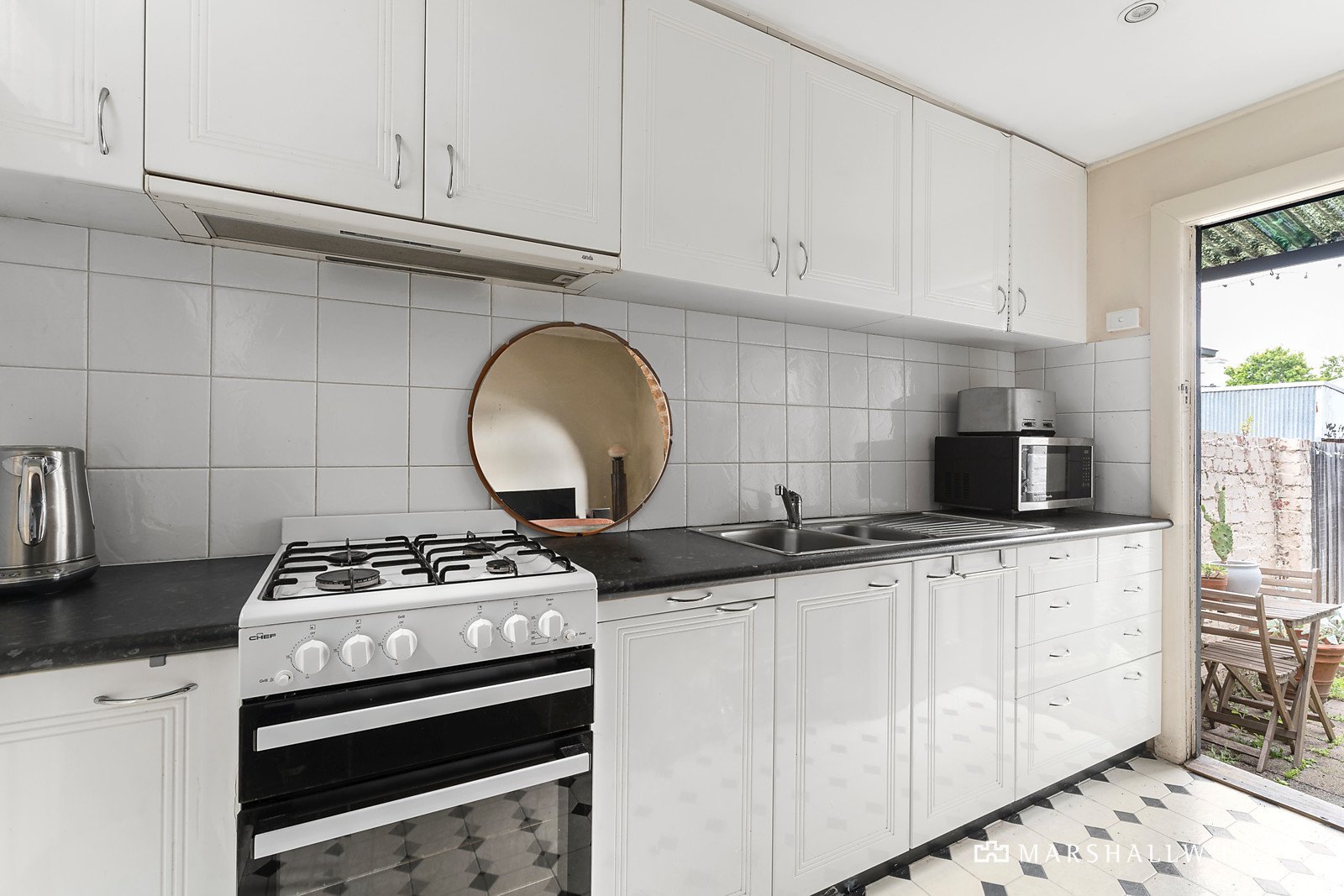All with polished timber flooring and a traditional arched hallway, the home culminates in a functional kitchen, welcoming living area and semi-attached dining, whilst at the rear of the home a paved courtyard - with secure parking - basks in afternoon sun and screams potential. One of the bedrooms features a large fireplace and the other has been appointed with a wall of built-in robes, plus there is a fully-tiled contemporary bathroom, a laundry, wall heater and split system air conditioning.