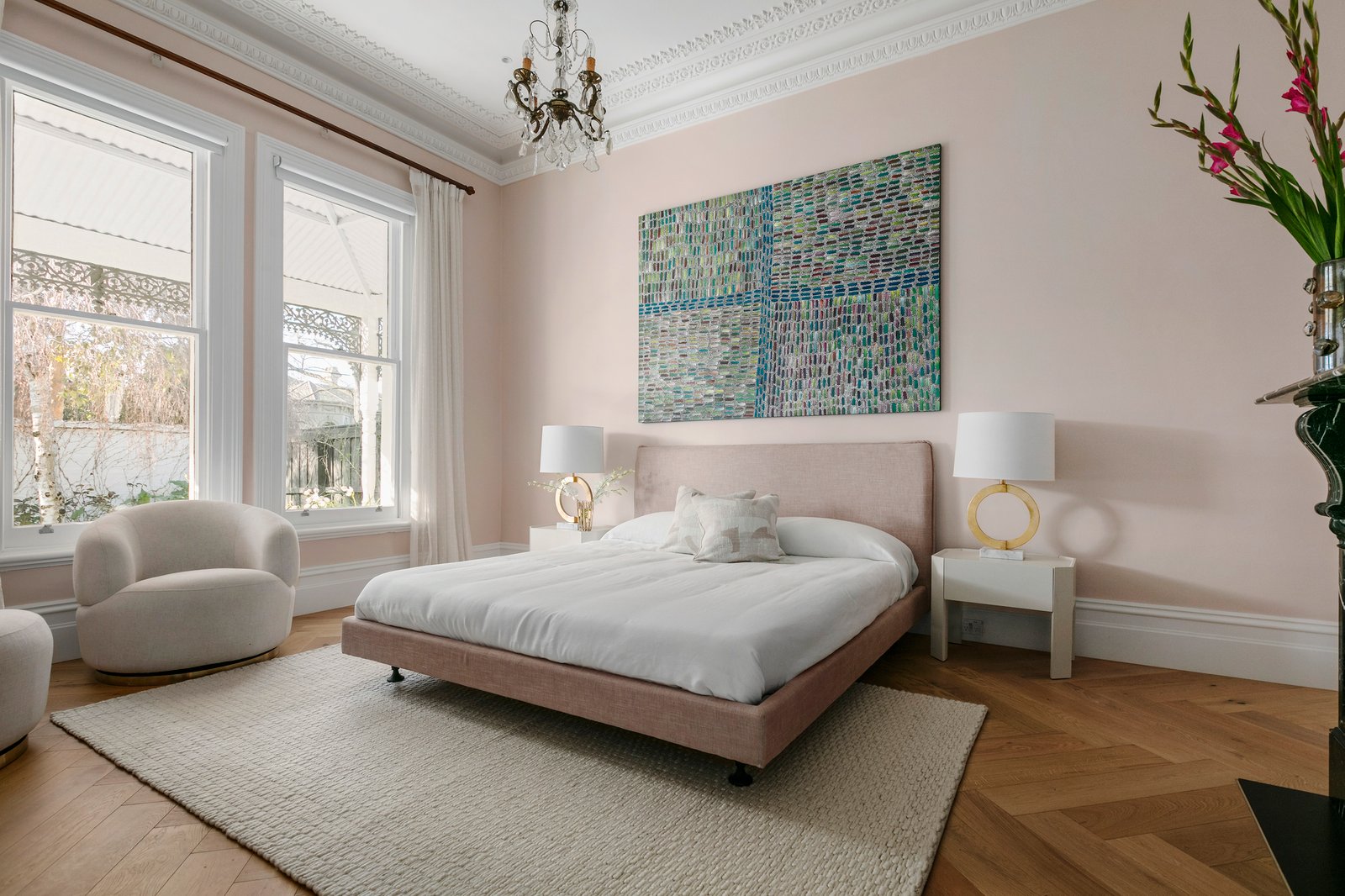Framed by captivating, landscaped gardens and a chequerboard verandah, the arched central hall featuring Royal Oak herringbone floors and original high ceilings introduces an elegant sitting room or possible 4th bedroom with marble fireplace and a serene home office overlooking the garden. The spectacular open plan living and dining room with a Jetmaster gas fireplace is set beneath soaring cathedral ceilings with rafters and clerestory windows, the result of a sensational extension in 1983 by celebrated architect Nicholas Day. The sublime gourmet kitchen is superbly appointed with Miele appliances, integrated fridge/freezer and a striking Concordia Italian marble island bench. Three sets of black steel framed French doors extend the living space out to the gorgeous landscaped private garden with picturesque solar/gas heated automatic pool, extensive crazy paved terraces and a premium built in BBQ and exhaust, cleverly concealed by a hydraulic tilt door. Drenched in year-round sunlight, a fabulous, versatile indoor-outdoor entertaining room with stone floors opens completely to the garden through stacking glass sliders. The stunning main bedroom with bespoke dressing room and lavish en suite with a rare Orazia Gold stone vanity is accompanied by two additional double bedrooms with built in robes and a designer bathroom also with an Orazia Gold stone vanity. Nothing has been left to compromise to create this absolutely beautiful family domain.