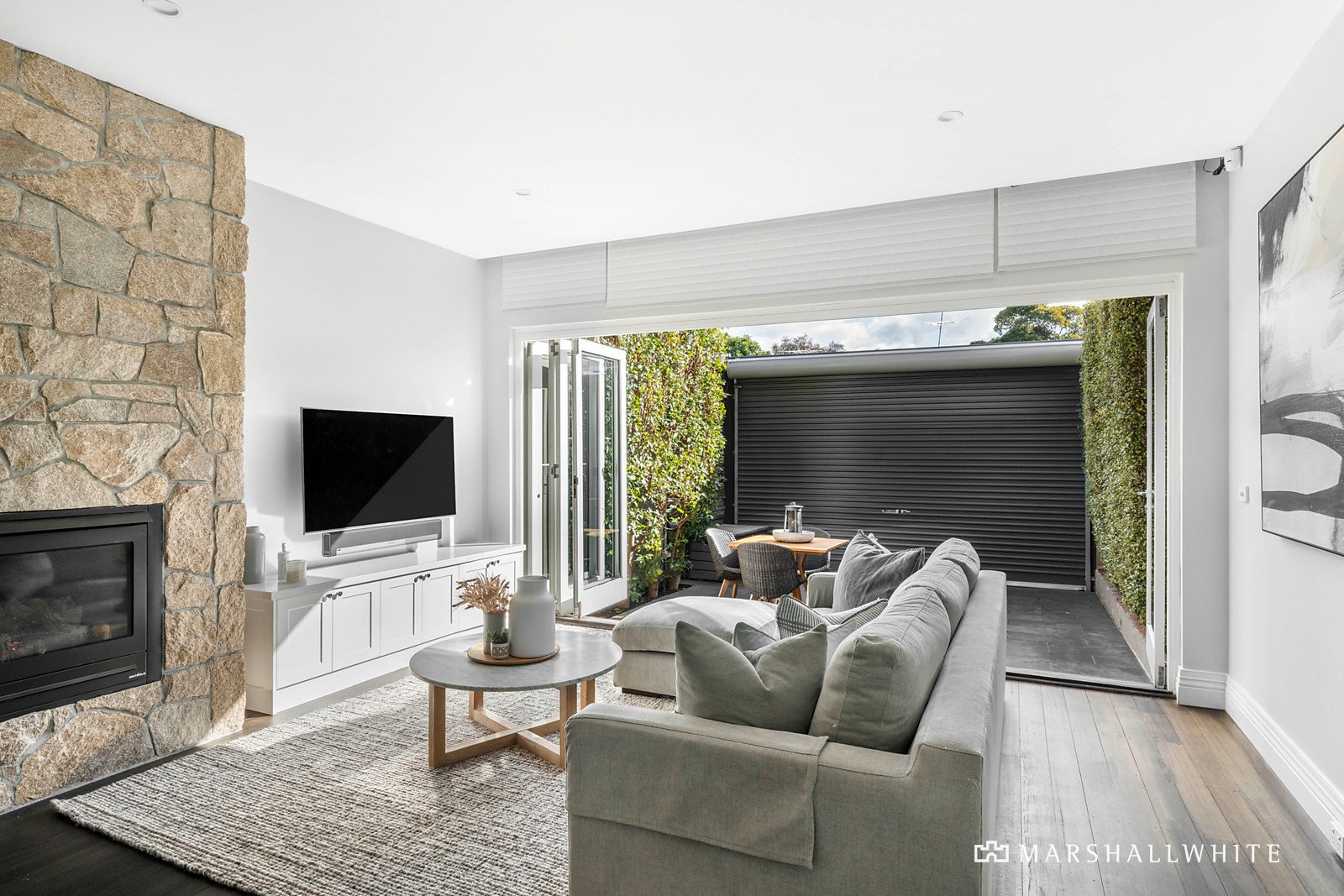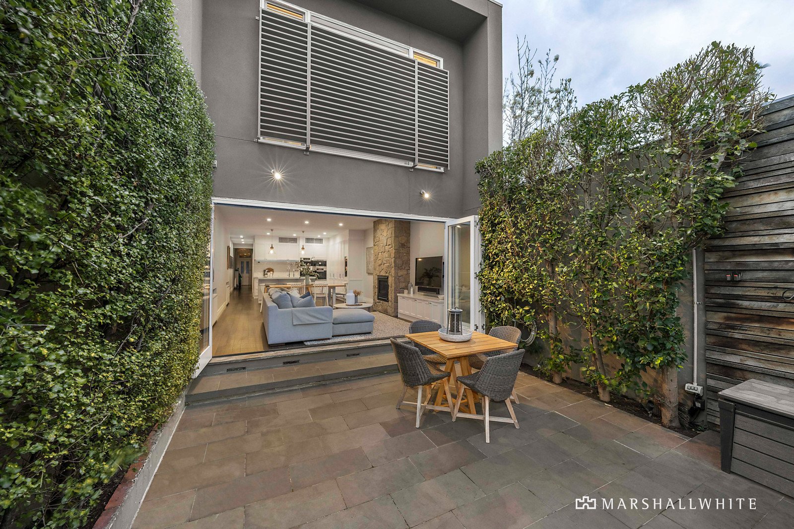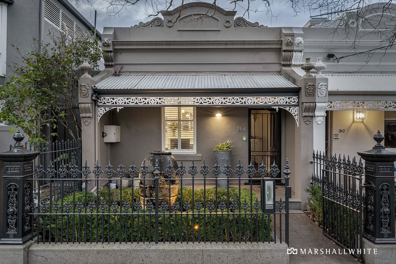Greeted by a handsome Boom-era facade, the exceptionally transformed interior expands through a corbelled arch hallway into a magnificent contemporary domain, where everyday living and entertaining are enhanced with floor-to-ceiling bi-fold doors to an entirely private courtyard terrace. Open-plan living and dining is enriched by a spectacular gourmet kitchen with sleek stone benchtops, hosting an integrated Miele appliance suite, an integrated Liebherr fridge/freezer and wine fridge, and a Zip Tap.