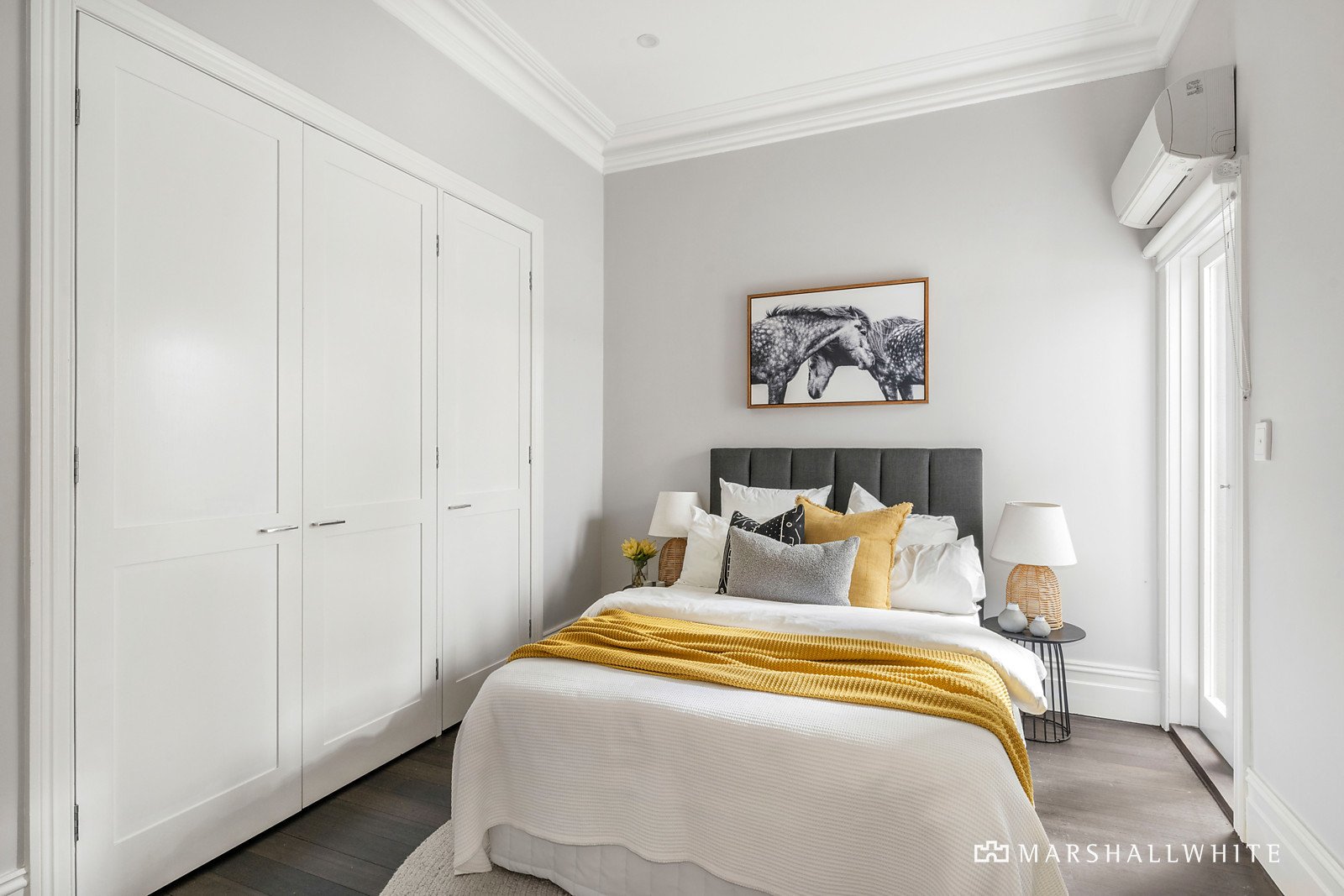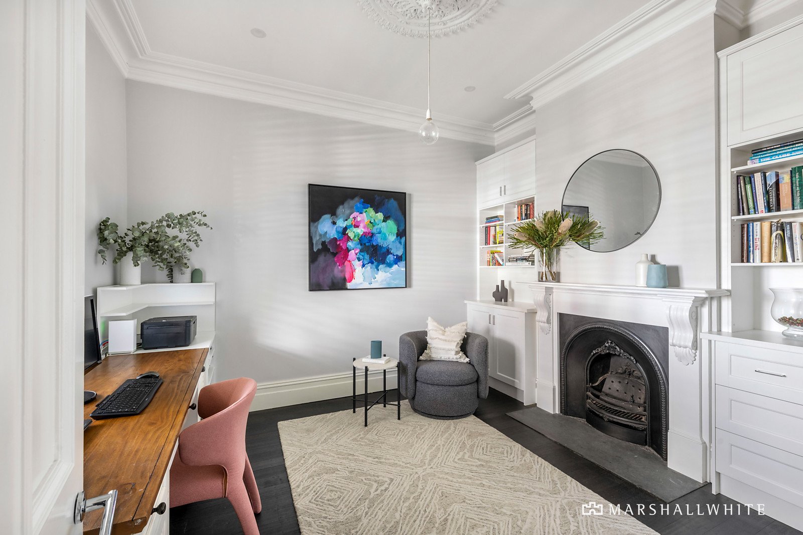 Bathed in north-western light, the palatial first-level main bedroom with a lavish ensuite and extensive fitted robes is accompanied by a second, robed bedroom with a reading nook and a large central living area with built-in custom storage. Downstairs, the additional two bedrooms showcase gorgeous period aesthetics with original open fireplaces and built-in storage and desks, positioned beautifully by the renovated bathroom with a freestanding bath and herringbone marble tiling.