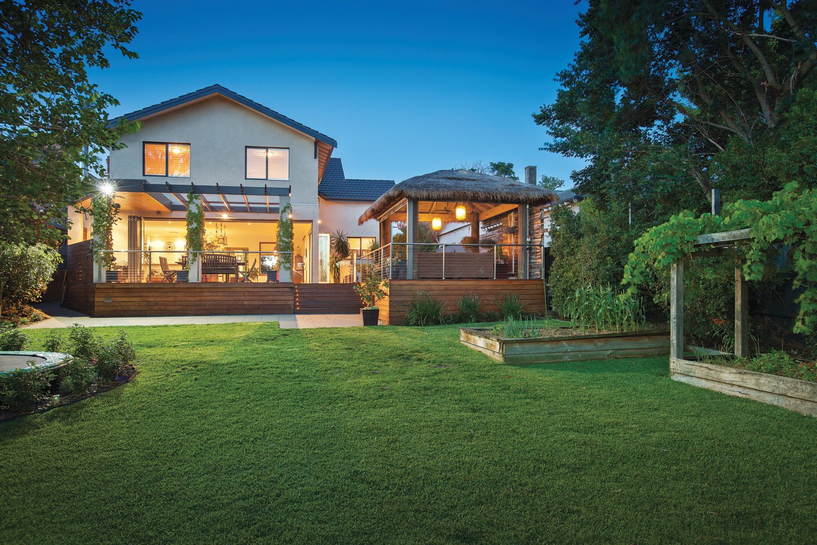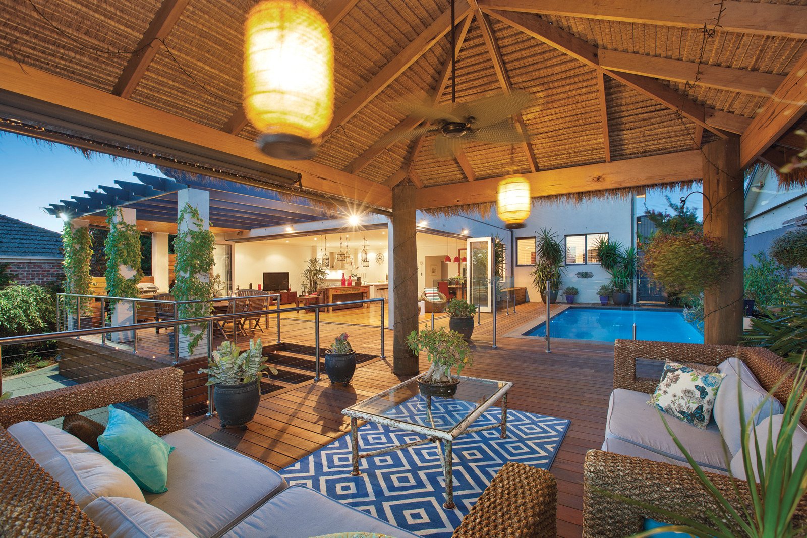 Set on a magnificent, lush garden allotment, maintained by a 25,000 litre underground water tank, the home features subtle cream interior, stunning travertine wet areas and beautiful silvertop ash floors, which flow between a sitting room, study, downstairs guest bedroom w ensuite, powder room, 5 locker boot room and a massive family room. The gourmet kitchen boasts Miele appliances, integrated refrigerator/freezer, WIP and a huge breakfast bar, looking out over an expansive deck and solar/gas heated pool. A balinese pool hut provides a backdrop to the lush gardens, pool and BBQ area, and electric/all-weather clear blinds, allow use in rain or wind. Wrap around bi-fold doors seamlessly blend indoor/outdoor space, allowing for entertaining on any scale. Upstairs the parents' retreat has separate his/hers dressing areas, and a spacious bathroom with oversized open shower, overflows with natural light. In the kids' zone, three more bedrooms with built-in wardrobes, open onto shared teen retreat/entertainment area, and a unique 3-basin bathroom. Features include video intercom, automatic blinds in family room, ducted vacuum, hydronic heating, OFP, ducted a/c, rem-gate+OSP for 3-4.