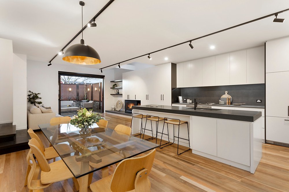 A brand new house in an historic locale could not have been done any better than this compelling residence from Melbourne’s in-demand innovators, Nixon Tulloch Fortey Architecture. The benchmark has been reset and the results are stunning! A designer sanctuary integrating multiple alfresco areas and rear remote-control garage; space and light weave their way in stylish unison throughout this brilliantly appointed, two-level home featuring three beautiful bedrooms (both down/up with ensuites; main includes freestanding bath plus balcony views) and lounge/study (or 4th). Enjoying village convenience near vast parklands/trails, cafés, shops, schools and train station, this superbly constructed home includes living room (gas log fireplace) with vanishing stack-slide door to secluded entertainment oasis, dining area with studio lighting, streamlined Smeg stone kitchen (clever storage, fridge/freezer), three smart bathrooms, powder room, laundry, double-glazed windows, heating/cooling, security/data systems hub, Spotted Gum floorboards, copious custom storage and landscaped courtyards.