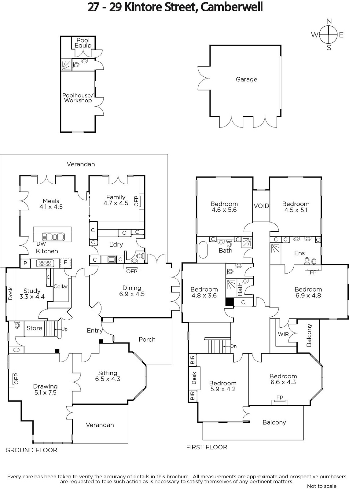 Grandly proportioned reception rooms include an elegant sitting room, adjoining drawing room opening to private verandah and separate formal dining room capable of seating twenty, whilst a sympathetically designed and skilfully executed extension incorporates a well appointed modern kitchen with an adjacent informal dining area opening to a broad three-sided verandah and a separate family room. Six very generously proportioned double bedrooms (main with ensuite) and a large study, two further bathrooms, three powder rooms and a spacious, fitted laundry complete the comprehensive accommodation.