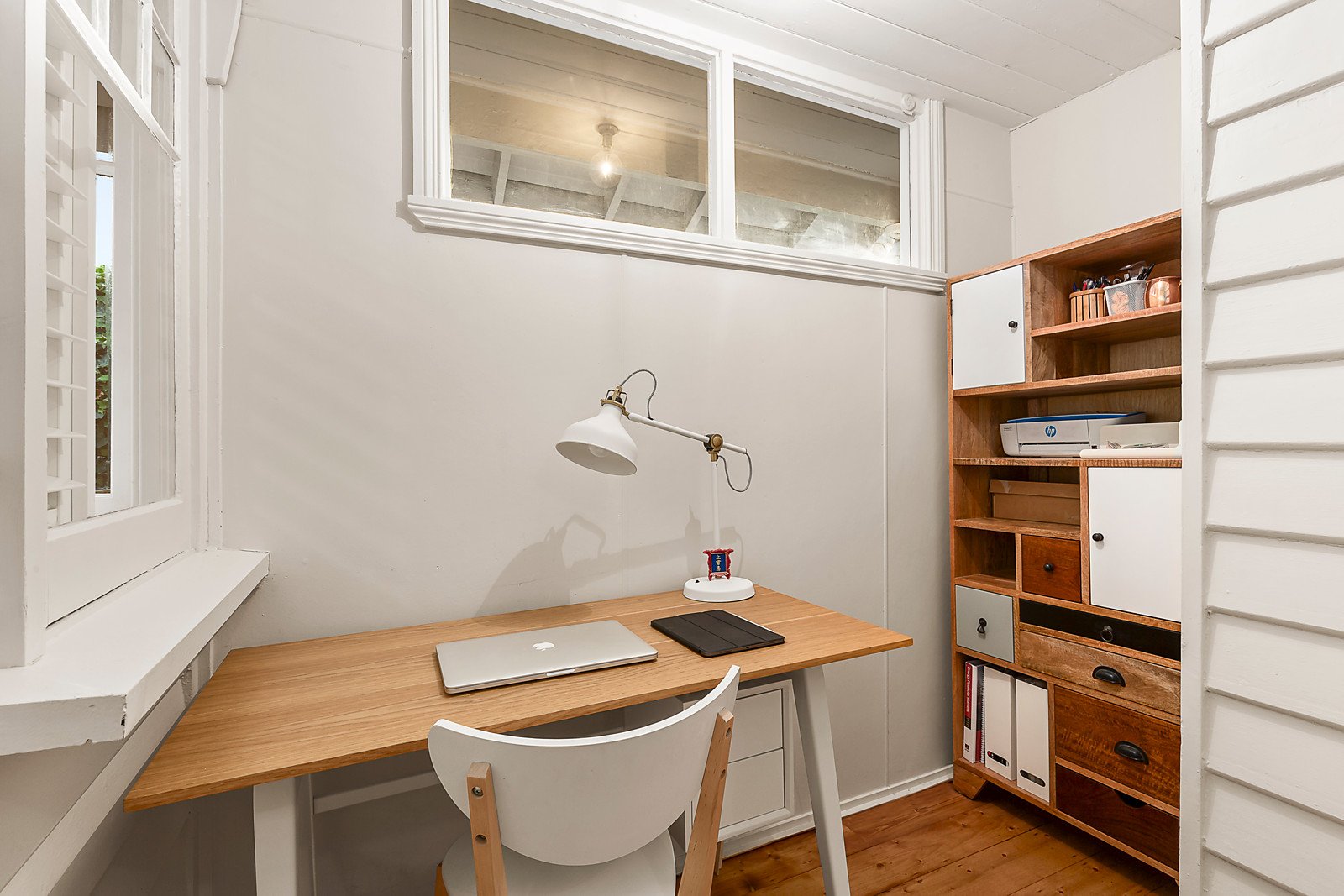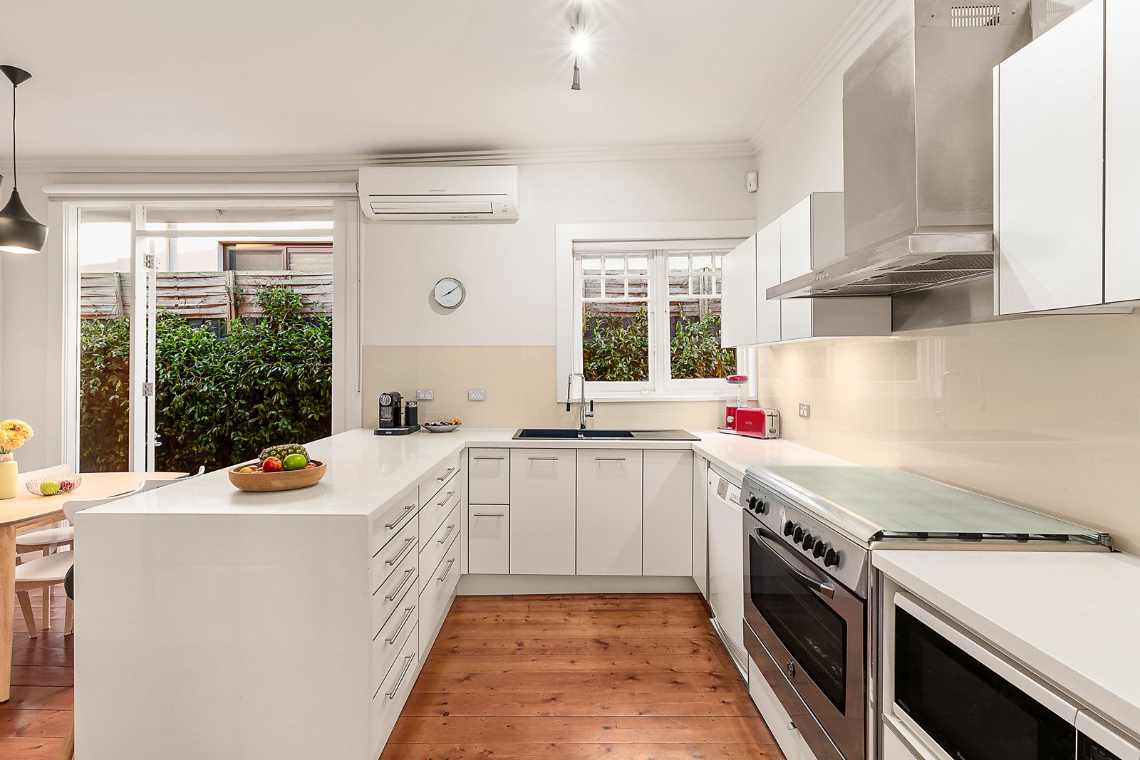 High ceilings and surrounding clerestory windows accentuate the wonderful sense of space and light in the inviting living room with a gas fire. Bi-fold doors open fully to reveal a private leafy northeast garden with a large entertaining terrace shaded by a remote sun-awning and an assortment of fruit trees. Baltic pine floors flow through the sleek gourmet kitchen appointed with stone benches and a La Germania oven and the light-filled dining room opening through French doors to the north-facing side garden. The three gorgeous bedrooms are accompanied by a study and two stylish bathrooms.