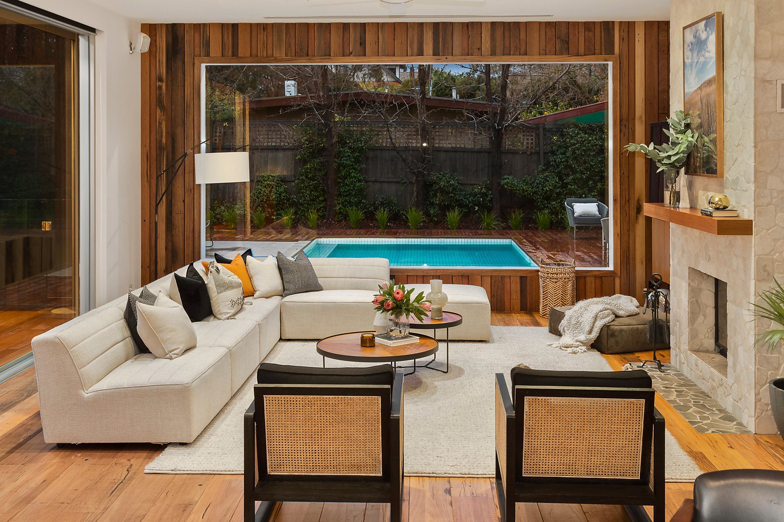 Combining classic California Bungalow origins with an exquisite high-end renovation, the many highlights include a welcoming entry hall, a heavenly master suite with walk-in robe and ensuite, a sweeping living and dining domain with reclaimed vintage Blackbutt timber floors and floor-to-ceiling garden and pool views, a stylish European kitchen and a charming formal lounge (or fourth bedroom) with open fireplace.