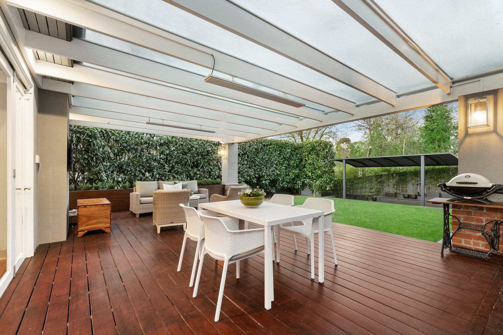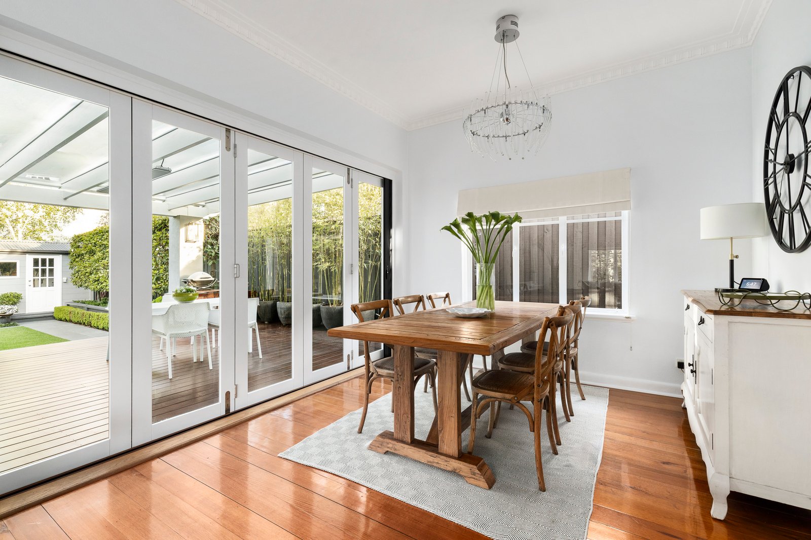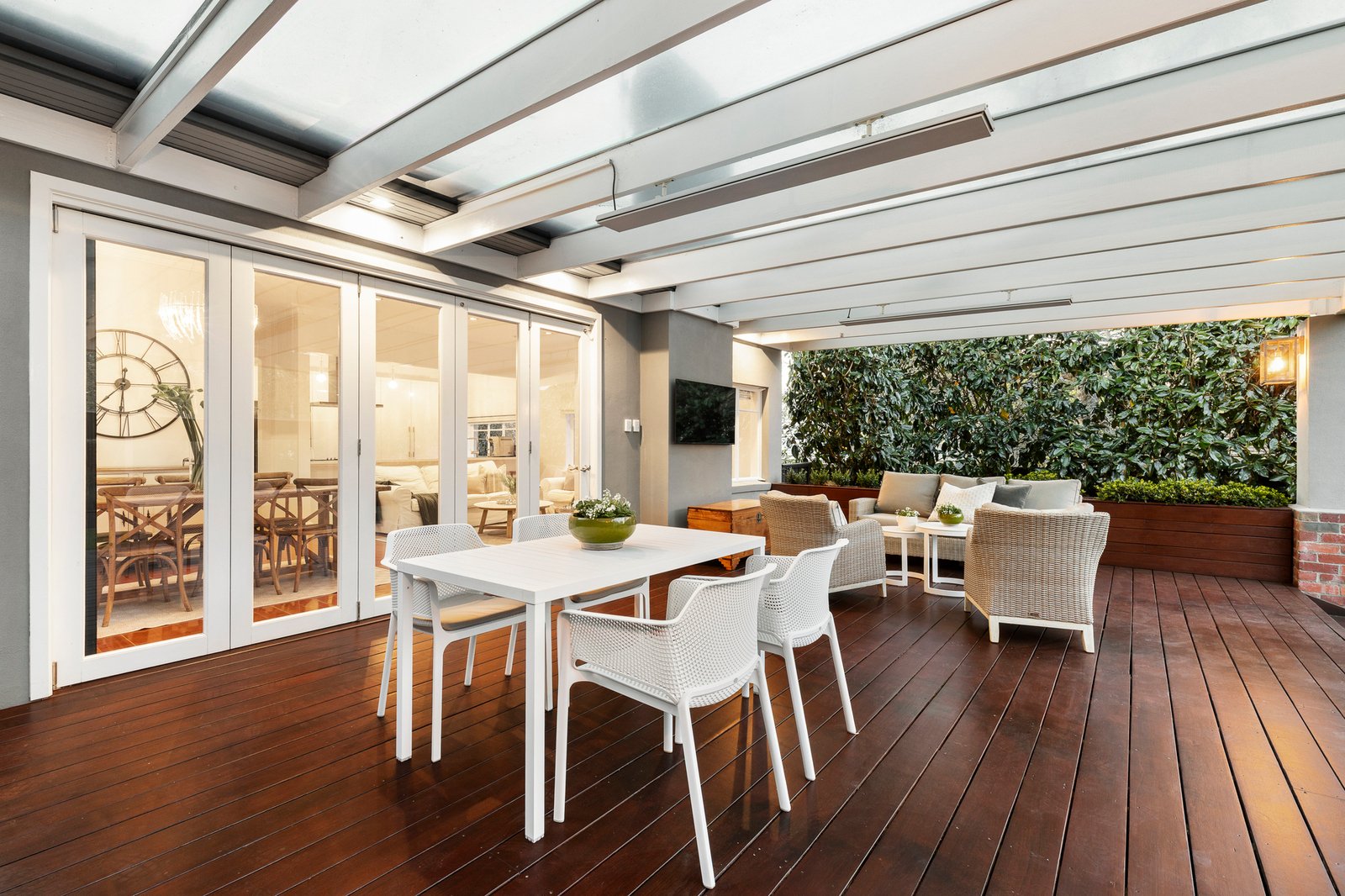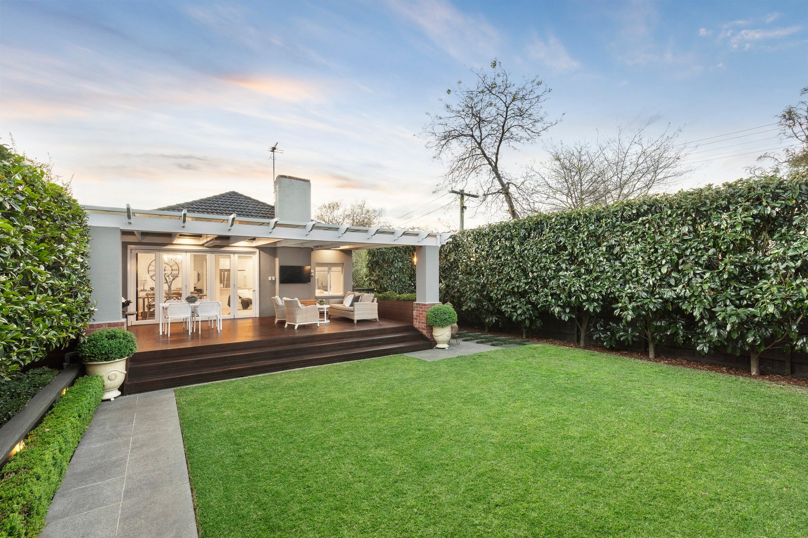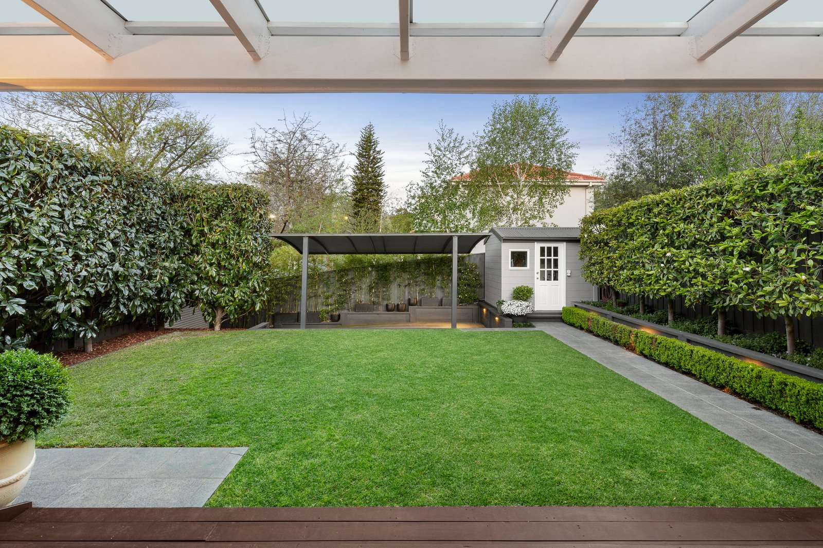 Framed by lush, leafy gardens, the entrance hall featuring timber floors flows through to a generous formal sitting room with an open fire, high ceiling and original metal windows. The superb gourmet kitchen appointed with stone benches and Miele/Smeg appliances and the expansive open plan living and dining room open through bi-fold doors to an exceptionally spacious undercover al fresco deck with heaters providing year-round comfort. Capturing wonderful northern light, the captivating private garden is bordered by magnificent Magnolia hedges. The three double bedrooms with built in robes and a home office are accompanied by two stylish bathrooms.