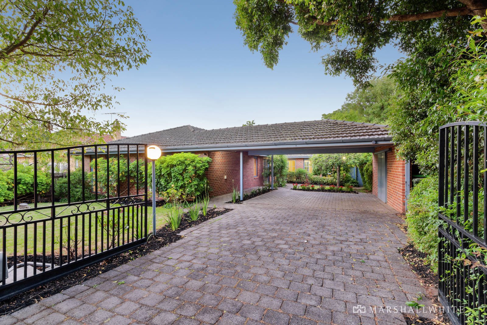 Privately and securely positioned behind a high front fence and leafy walled garden this classic clinker brick family home offers charm and enduring appeal in a lovely setting. With its generous family accommodation including the living and entertaining areas capitalising on its preferred northern rear aspect. Providing loads of room and ideal spaces for indoor/outdoor entertaining in small or large numbers. An inviting interior features high gloss polished hardwood floors in the hallway leading to an expansive living and dining room with cosy open fireplace, through to stylish timber kitchen and a meals area with parquetry flooring and equipped with prestige Smeg stainless steel cooktop, Miele oven and integrated dishwasher; opening to a sun-drenched deck, vine clad pergola and private rear garden gently shaded by mature trees. Complemented by four bedrooms, main with a WIR and ensuite, a family bathroom, powder room and laundry. Other features include alarm, ducted heating and cooling, solar HWS, 8,100ltr rain water tanks, auto gates and a double carport.