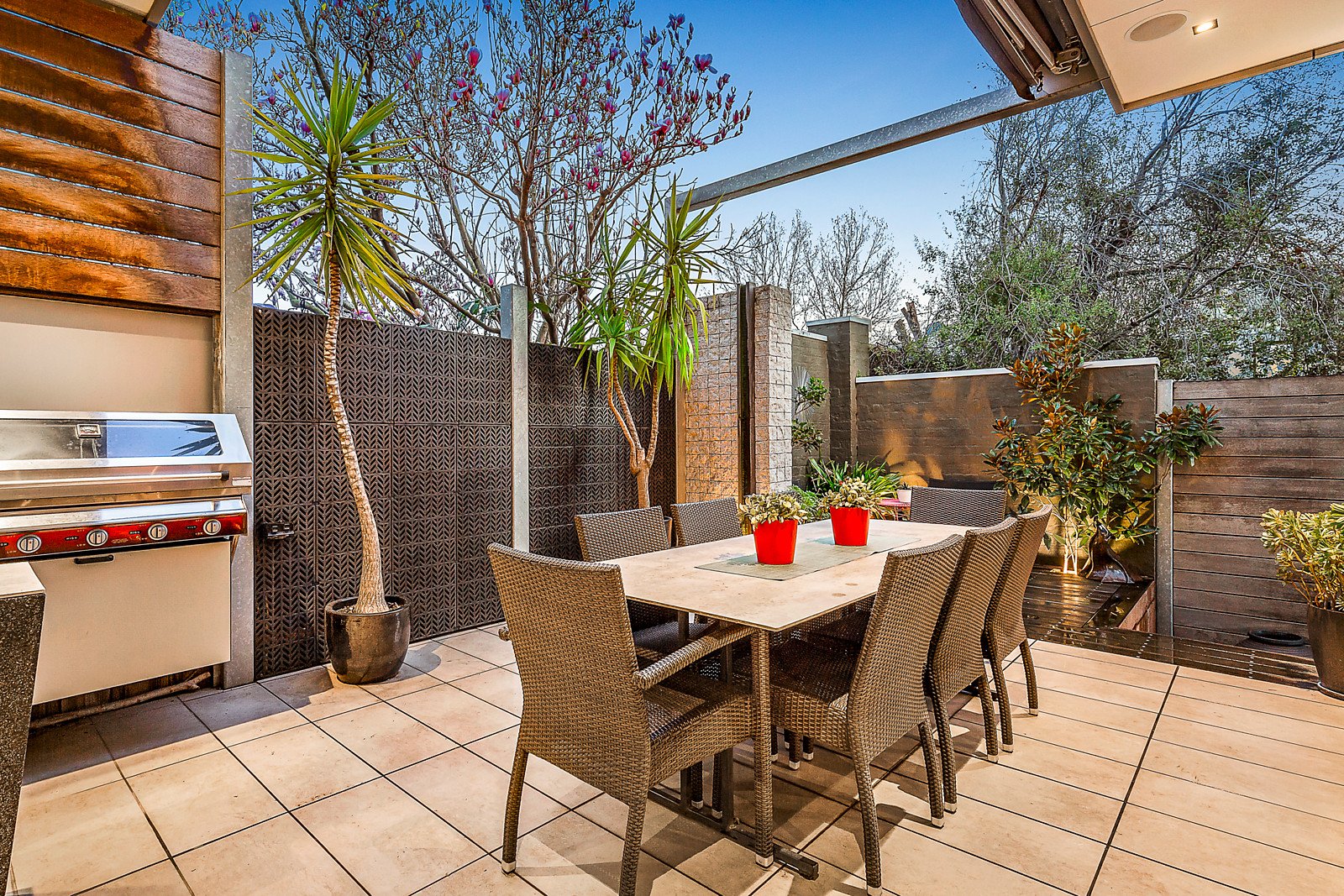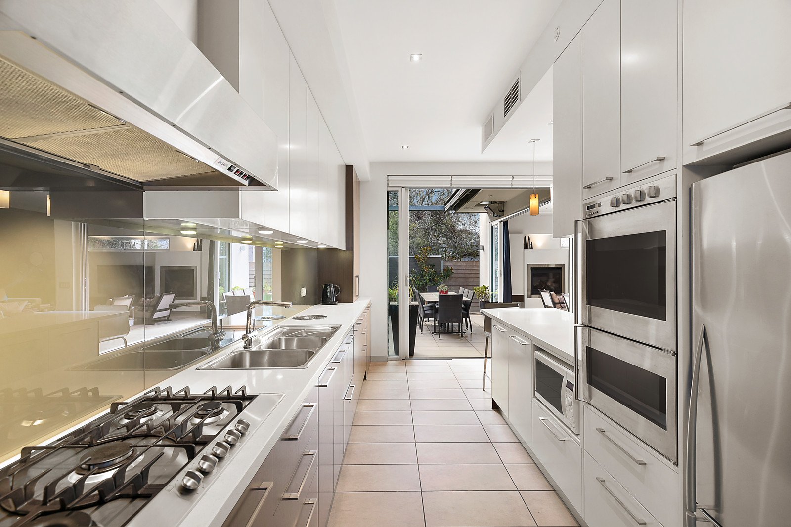 Bathed in northwestern light, the expansive living room with gas fireplace and adjacent dining area are well served by a generous gourmet kitchen appointed with stone benches and Miele appliances. Fully recessed stacking glass doors seamlessly extend the living area into the perfect north-facing, landscaped outdoor precinct featuring a built in BBQ, retractable shade awning and ceiling-mounted heaters, a wonderfully secluded entertaining oasis to enjoy all year round. Other ground floor features include a versatile home office/retreat or 4th bedroom and a stylish bathroom.