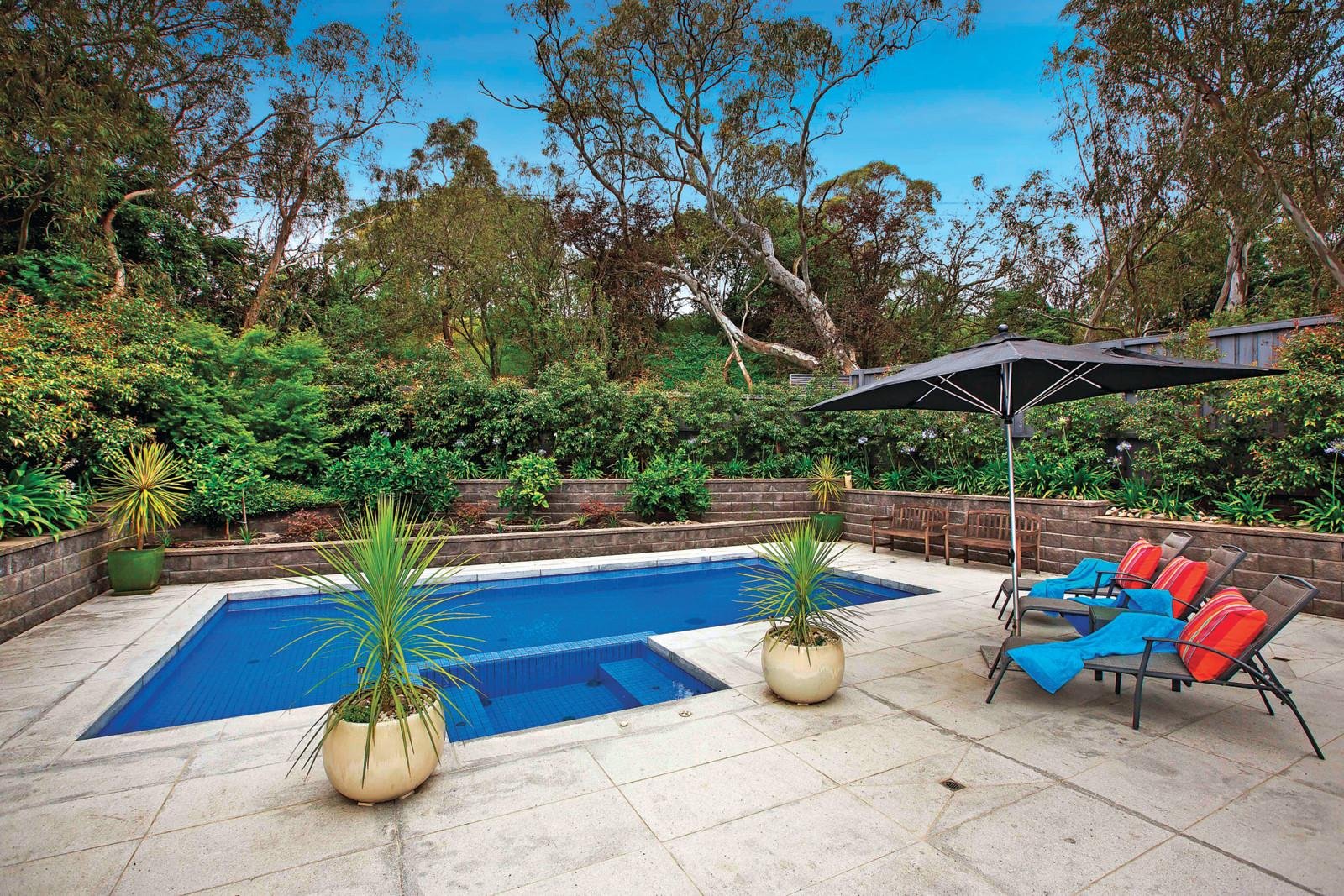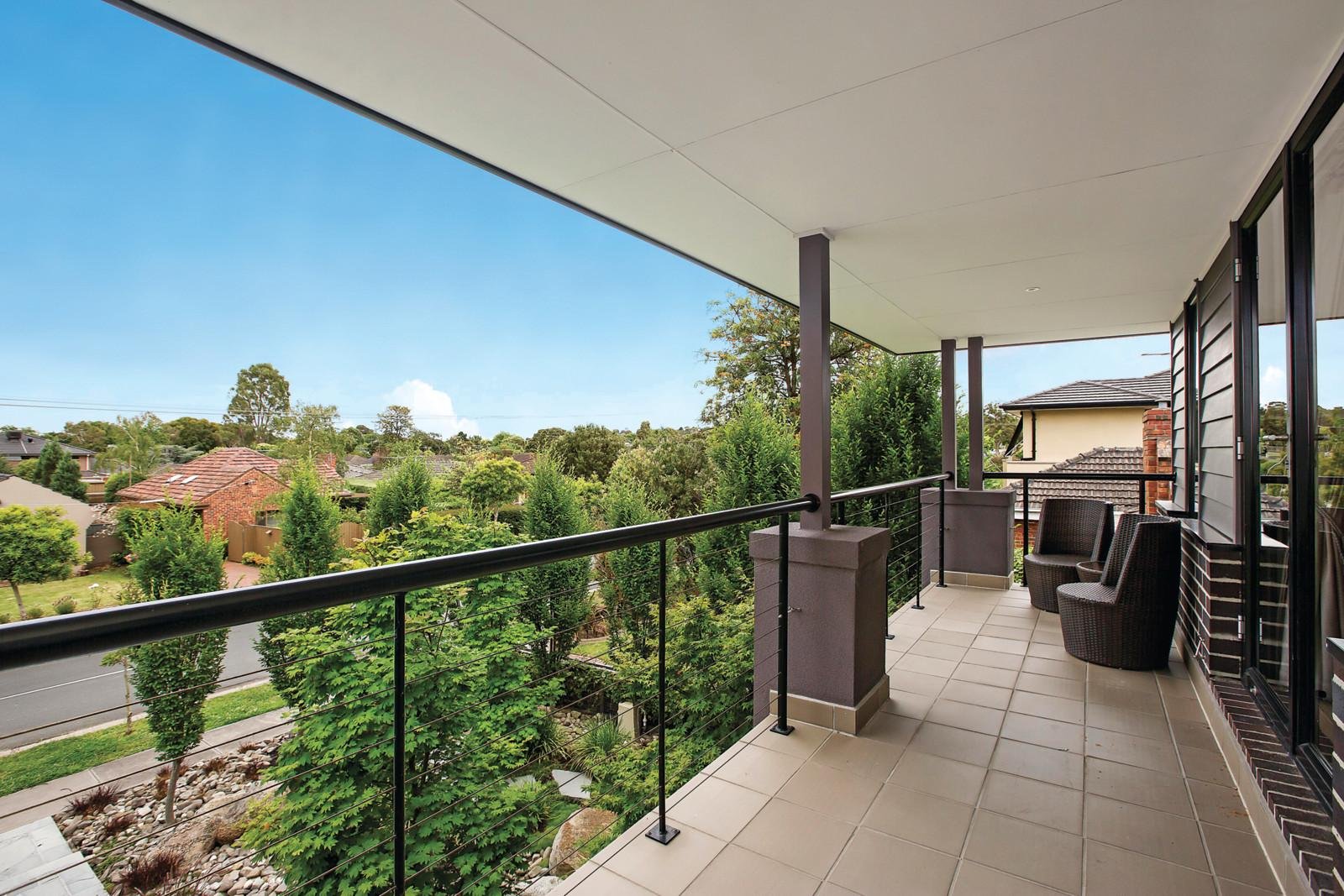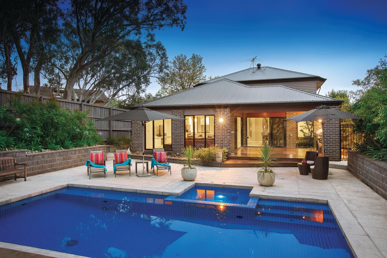 Idyllically situated within a spectacular landscaped garden and pool setting, this impressive 51/2 year old contemporary residence's exceptional dimensions brilliantly respond to every family living and entertaining requirement. A tranquil location directly abutting the Anniversary Trail and only moments from Ashburton Village and station, good schools and freeway access further illustrates the inestimable family appeal. Designed with a focus on versatility and family zoning, the wide entrance hall introduces an inviting sitting or home theatre room and beautiful main bedroom with walk in robes and lavish en-suite while a fabulous children's zone upstairs comprises a second bedroom with en-suite, WIR and balcony, two further bedrooms (WIRs), third bathroom and a huge retreat. The expansive living and dining area on the ground level with a sublime gourmet Smeg kitchen featuring stone benches and butler's pantry opens to a sensational covered entertaining deck with BBQ overlooking the picturesque northeast facing garden with stunning heated, self cleaning pool and spa set against a peaceful leafy parkland backdrop. Fully appointed with every conceivable luxury including hydronic heating, zoned RC/air-conditioning, alarm, ducted vacuum, 30,000L water tank, drip irrigation, study/mud-room, powder-room, laundry, ample storage and internally accessed double garage, it is a remarkable family domain. Land size 815sqm approx.