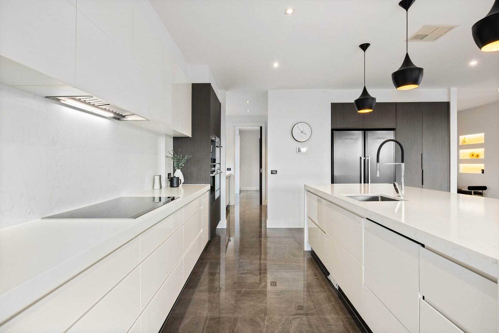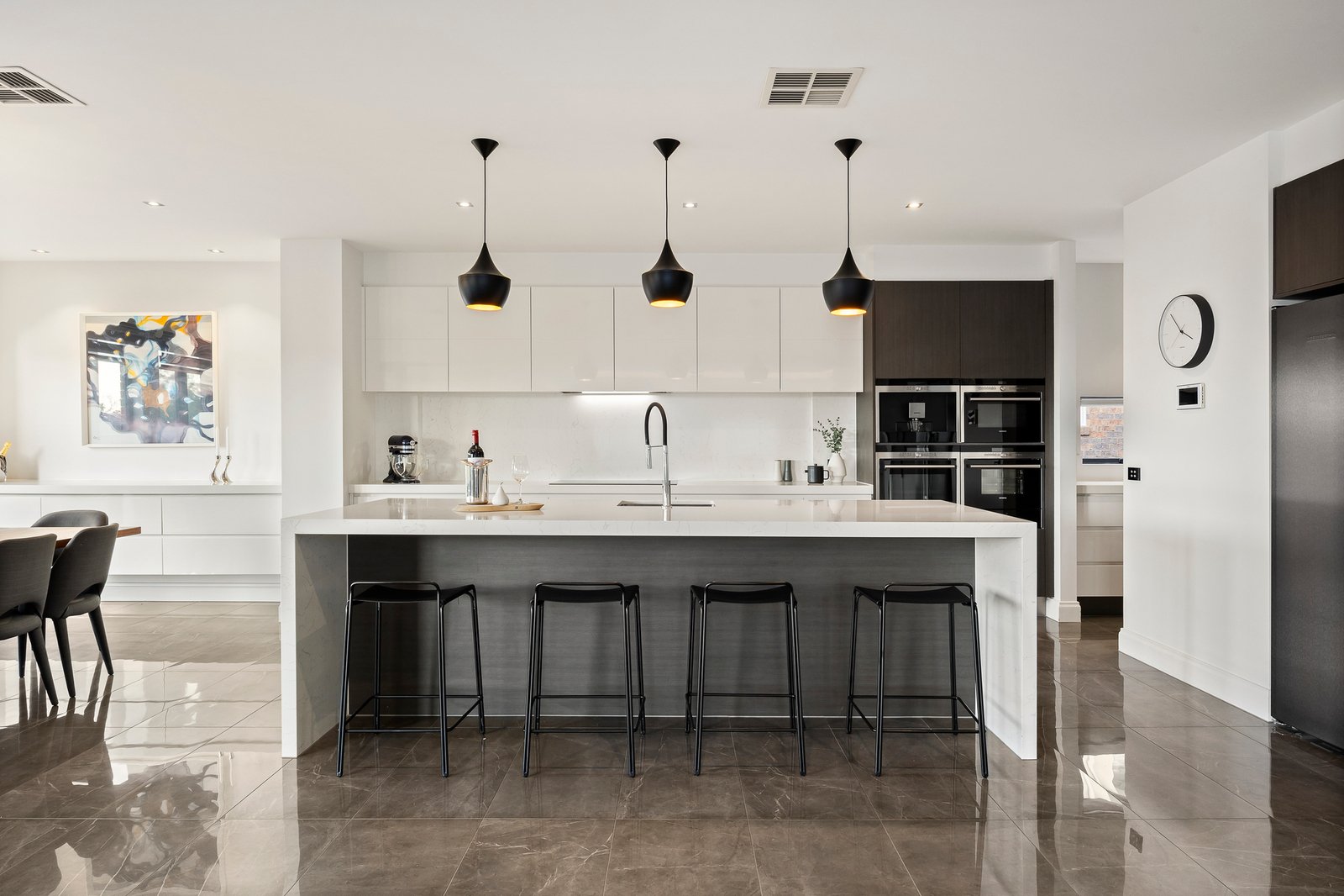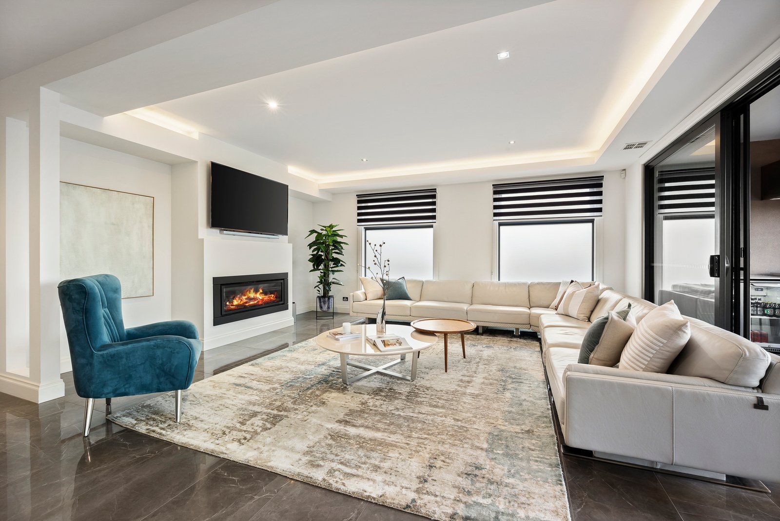 The meticulously crafted floorplan begins with an elegant tiled hallway enhanced by recessed LED lighting. A formal lounge or cinema room sits quietly opposite the spectacular staircase, complete with custom wine cellar storage cleverly tucked underneath, and an adjacent dedicated study nook provides an ideal home office setup. The heart of the home is an expansive open-plan living and dining area, where a gas fireplace and towering windows capture leafy Warrandyte views. The show-stopping epicurean kitchen is a culinary masterpiece, boasting a Quantum Quartz waterfall island and matching splashback, alongside premium Siemens appliances including an integrated coffee machine, steam oven, standard oven, and a 900mm induction stovetop. A fully equipped butler's pantry with dark contrasting cabinetry and a stainless steel dishwasher flows seamlessly into a well-appointed laundry room.