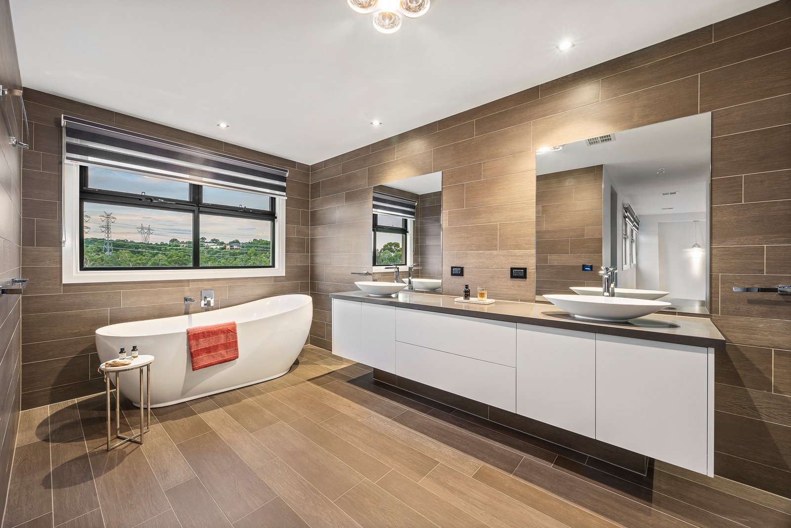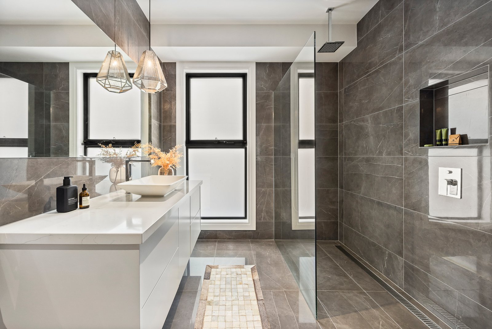 Accommodation is luxuriously proportioned, featuring a ground-floor guest bedroom with plantation shutters, built-in robes, and access to a designer bathroom with floor-to-ceiling tiles and a rainfall showerhead. Upstairs, a quiet retreat space with a second study nook accompanies four magnificent bedrooms. The palatial master suite captures sweeping views and features his-and-her sensor-lit walk-in robes, plus a glamorous ensuite with a freestanding bath, double vanity, and glass-enclosed shower. An additional bedroom enjoys a private ensuite, while two remaining bedrooms share a pristine bathroom with double vanities and frosted glass enclosures.