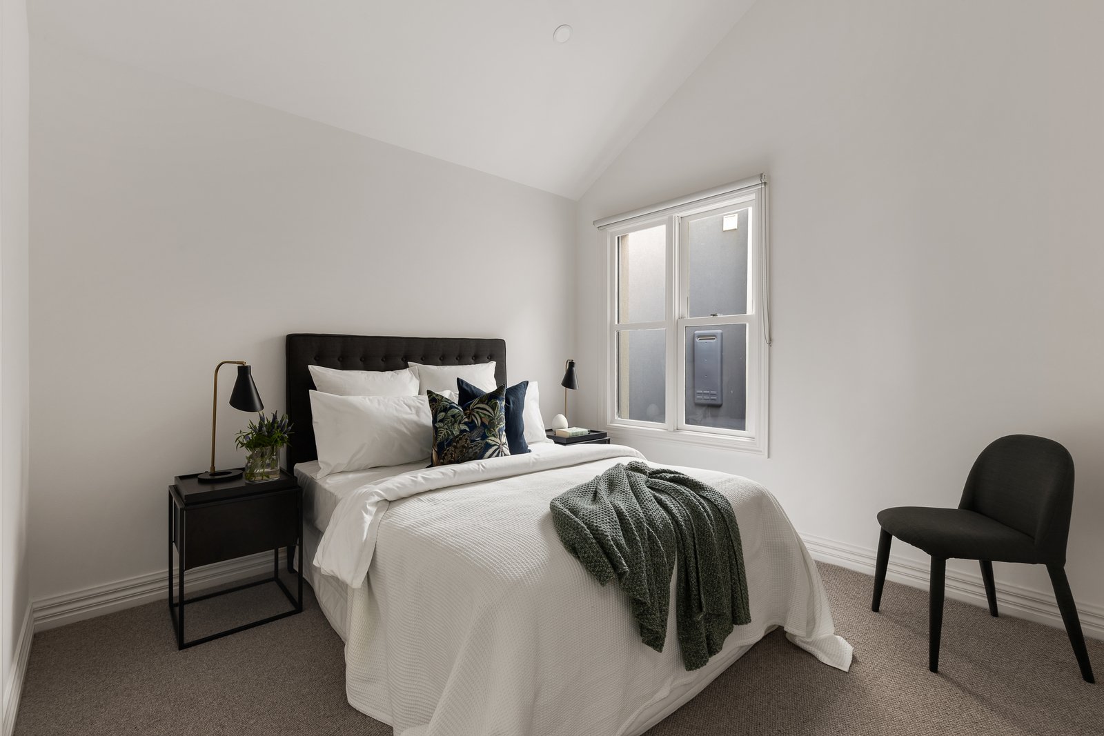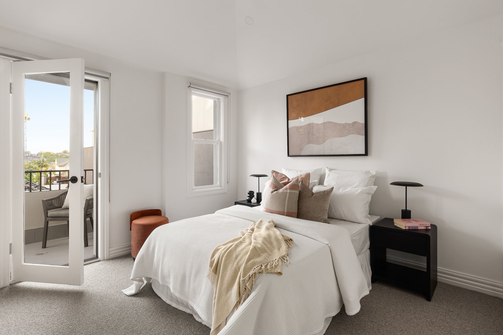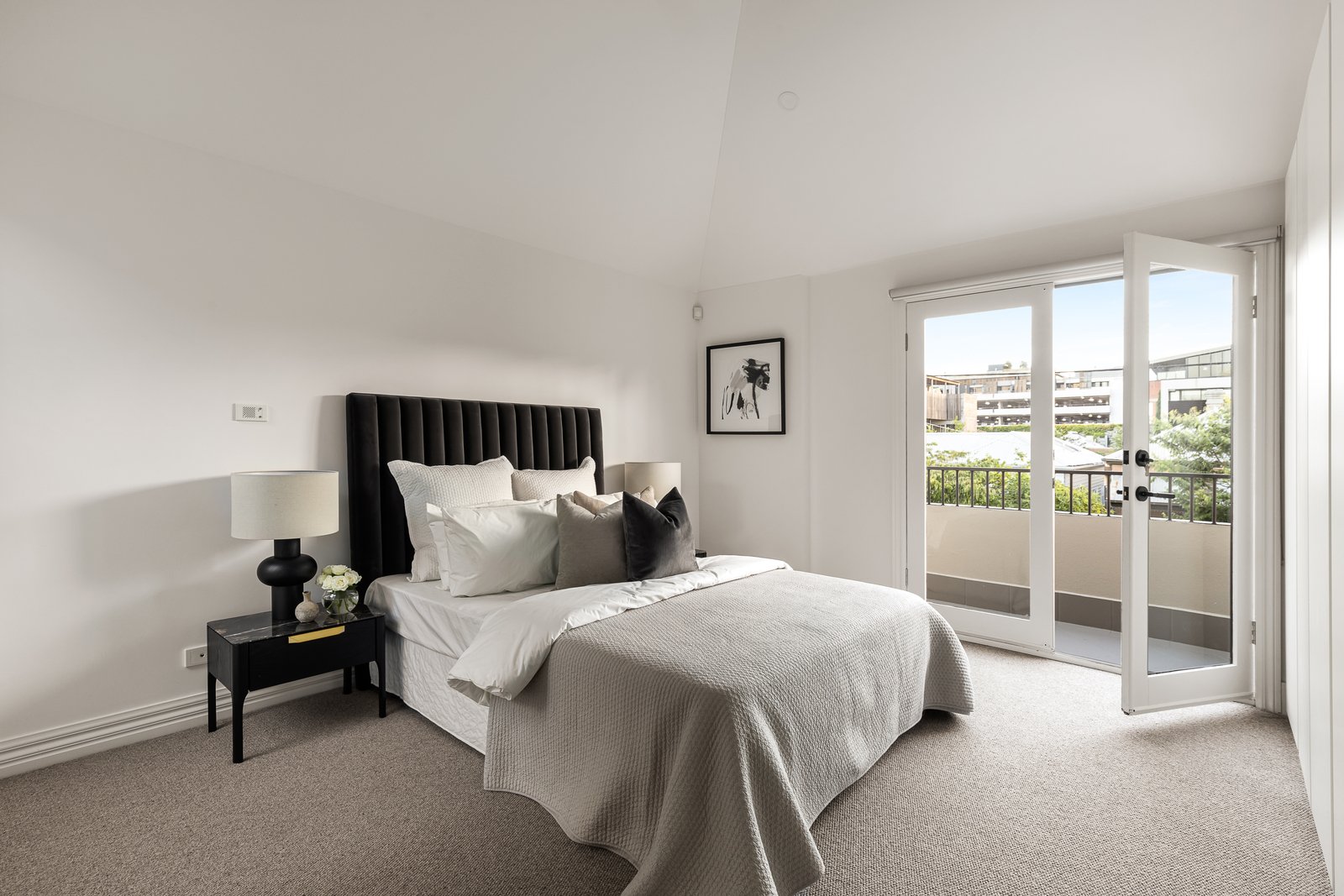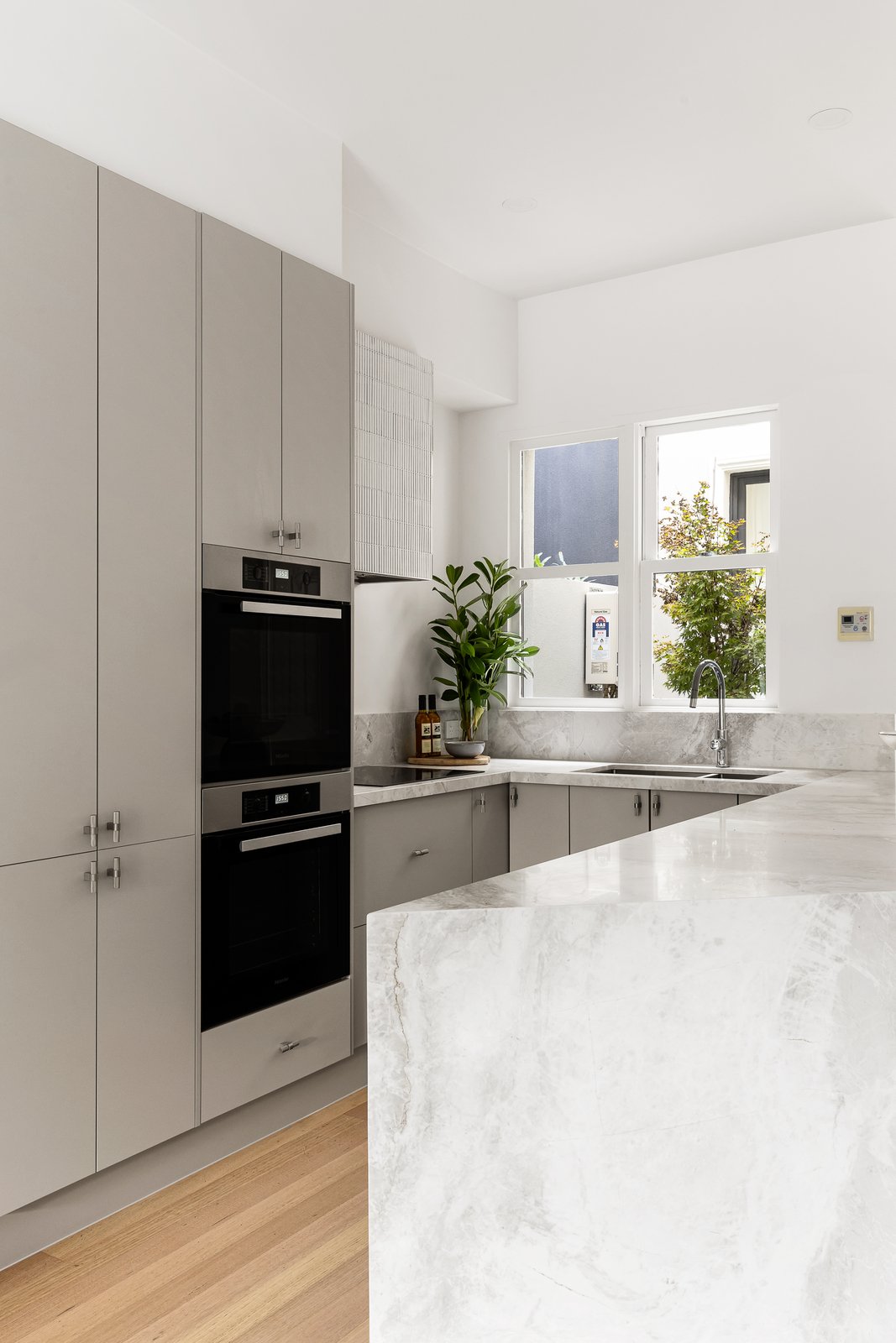 Defined by contemporary European refinement and a lovely connection with the outdoors throughout, the interior finishes feature a palette of pale timber floors, Lord white marble, linen curtains and 100% wool Victoria carpets. Natural light streams through the generous sitting room overlooking the leafy forecourt and an internal courtyard. The inviting open plan living and dining room with a deluxe gourmet kitchen appointed with Miele appliances including 2 ovens and waterfall marble benches opens through French doors to a gorgeous north-facing landscaped garden with Tundra marble paved terrace perfect for entertaining. At the rear there is a double garage accessed from a rear lane. The wonderful sense of light and space is accentuated upstairs by the soaring vaulted ceilings in the main bedroom with sunny balcony, designer marble en suite and built in robe, two additional double bedrooms with robes and a stylish bathroom with separate toilet.