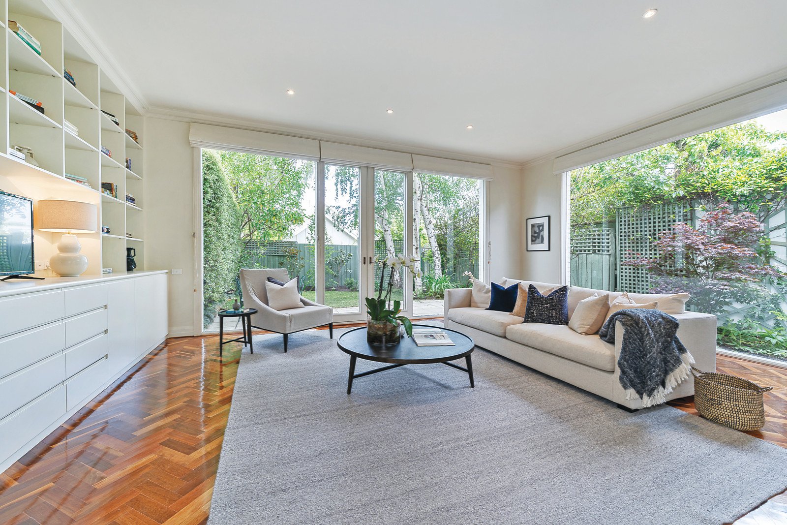 The ample reception hall featuring parquetry floors sets the tone for the gracious formal sitting and dining room appointed with an open fire and French doors to a leafy side garden. Parquetry floors continue through the gourmet stone kitchen and spacious, light-filled living and dining room opening to a picturesque private northeast garden shaded by a grove of Birch trees. Sky-lit stairs lead up to the gorgeous main bedroom with en-suite and walk in robe, three additional double bedrooms with built in robes and a bright bathroom.