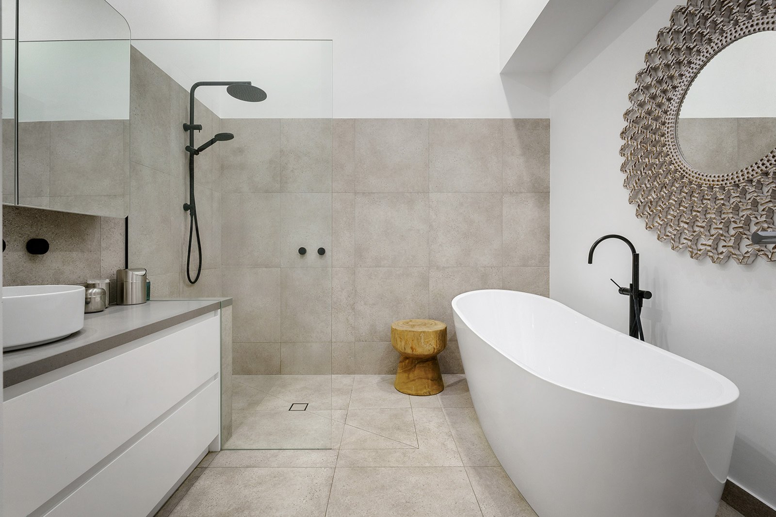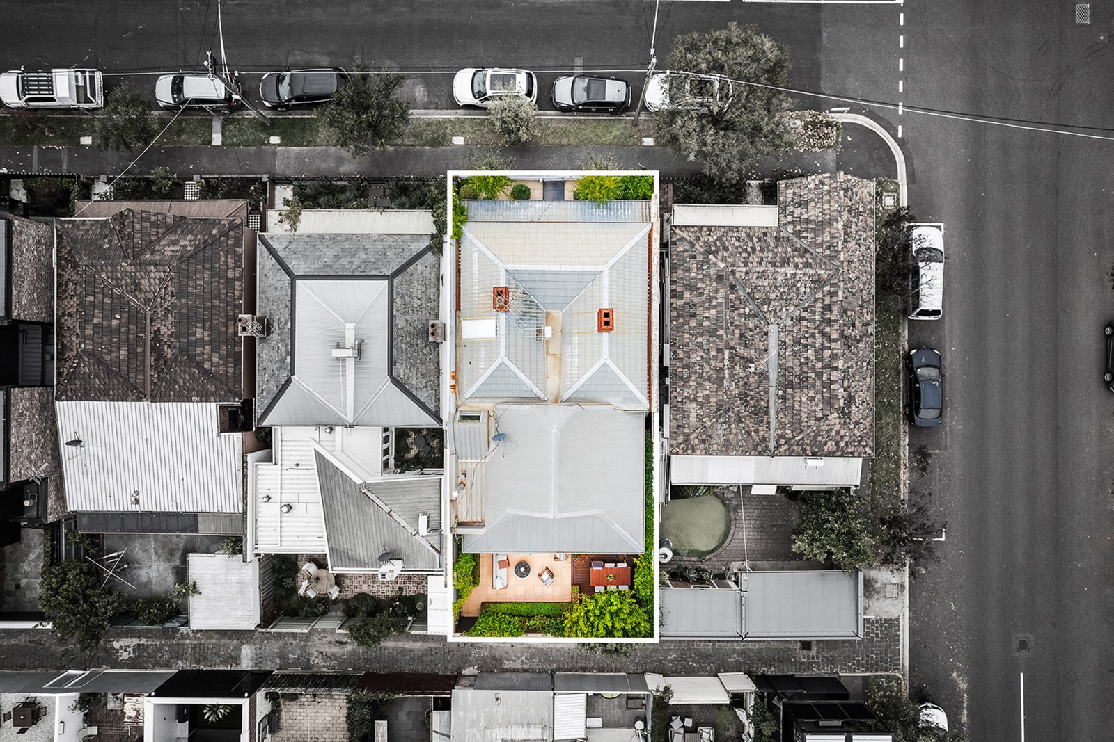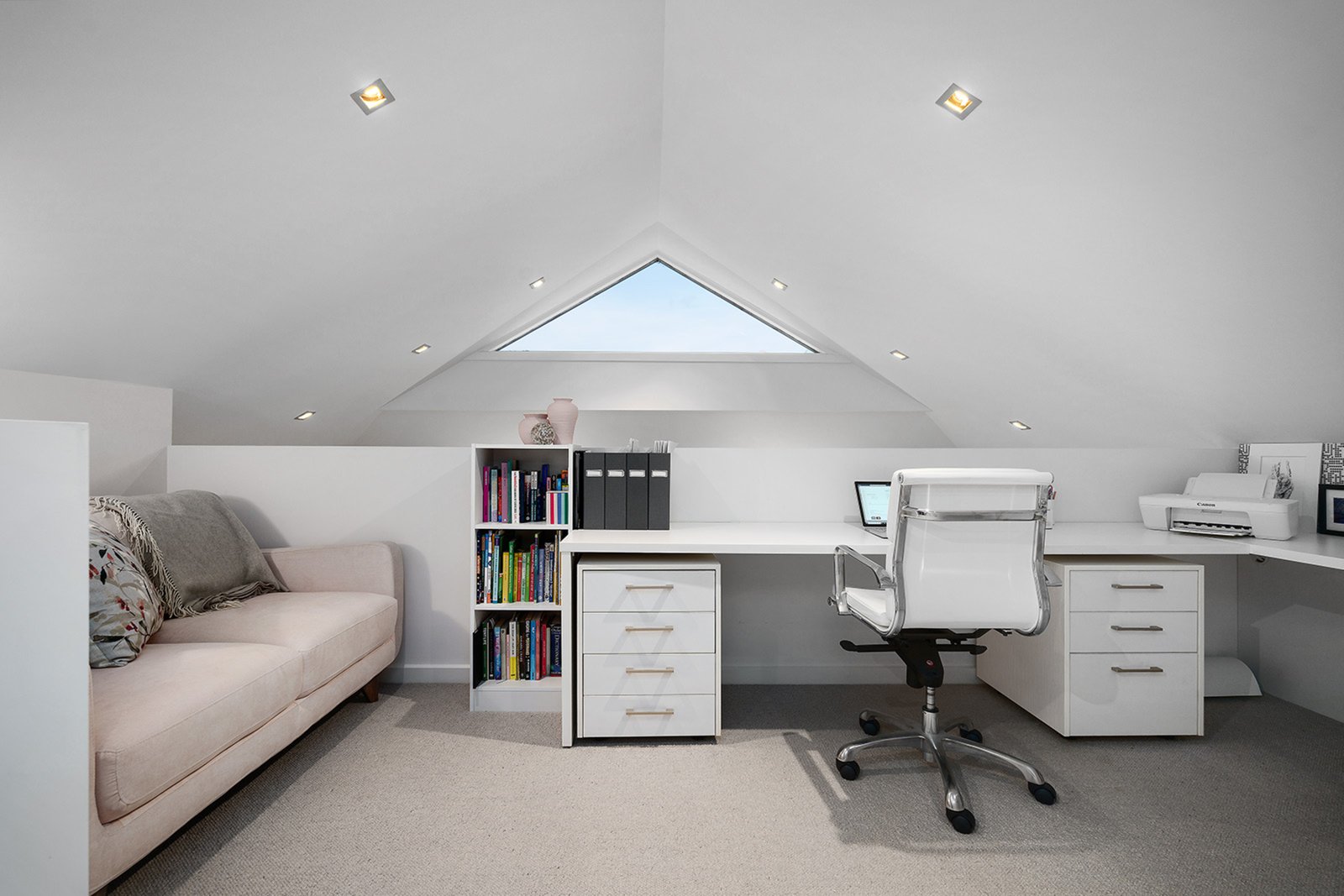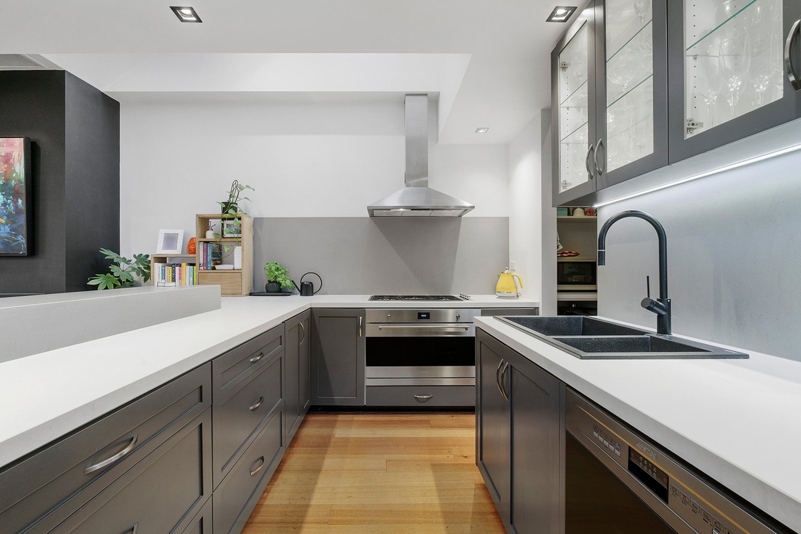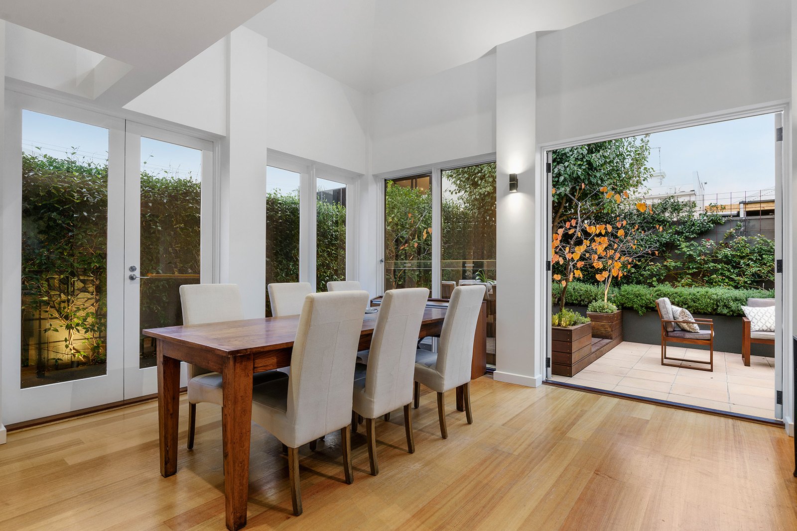 High raked ceilings and architectural skylights emphasise the scale and light through the open-plan living and dining domain, warmed by a gas fireplace and headlined by a gourmet Smeg kitchen with a walk-in pantry and sleek, stone benchtops. French doors extend the living and entertaining options to a large landscaped terrace garden, offering space to relax, unwind and host amongst walls of low-maintenance greenery and seasonal colour.