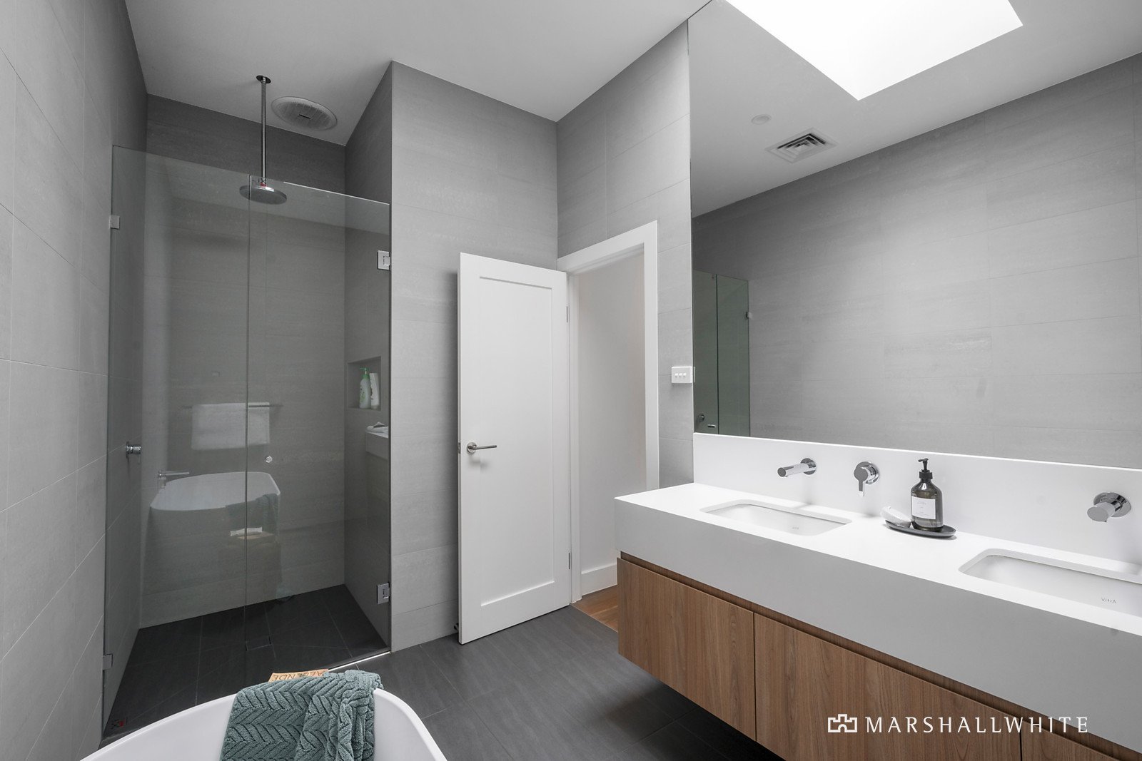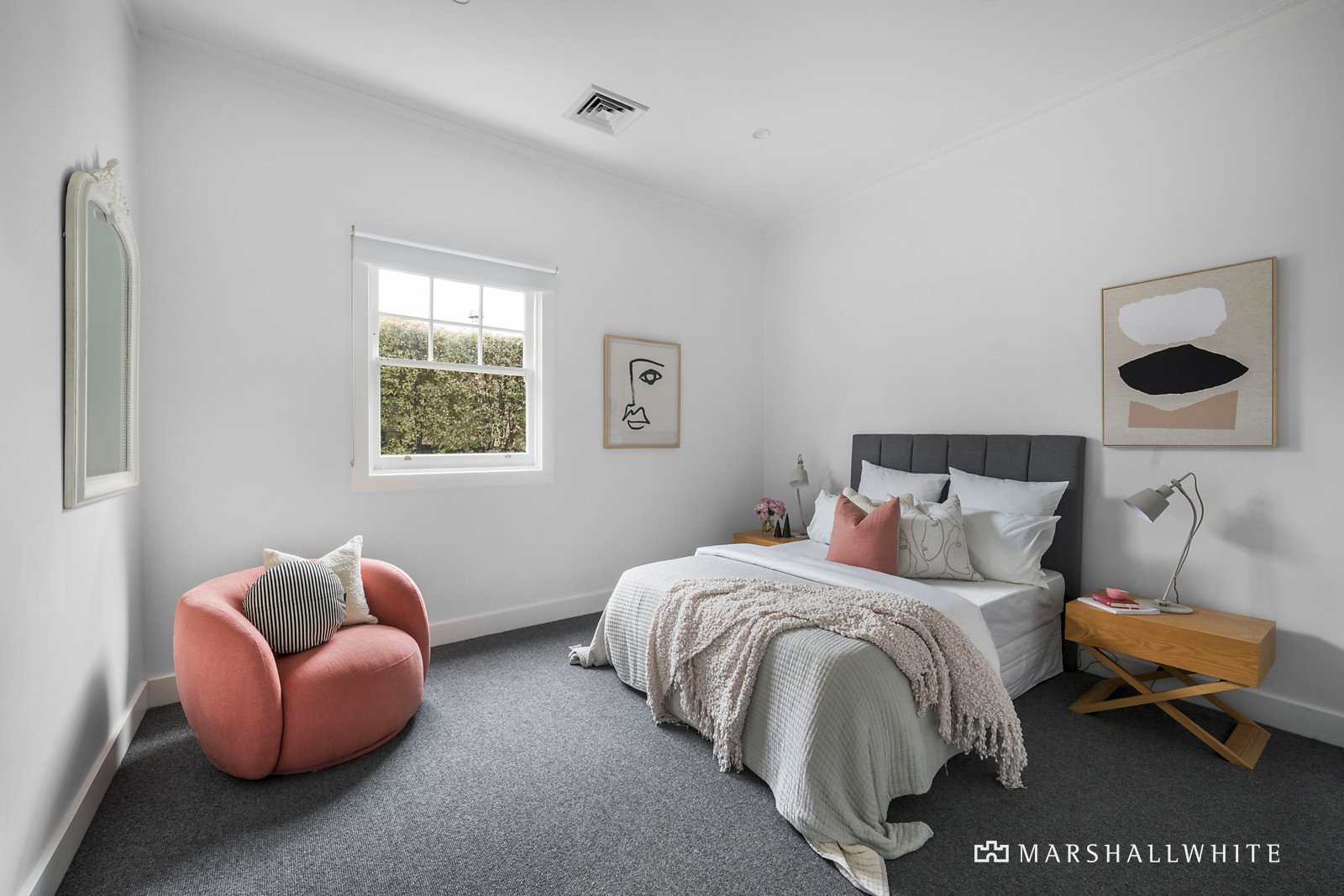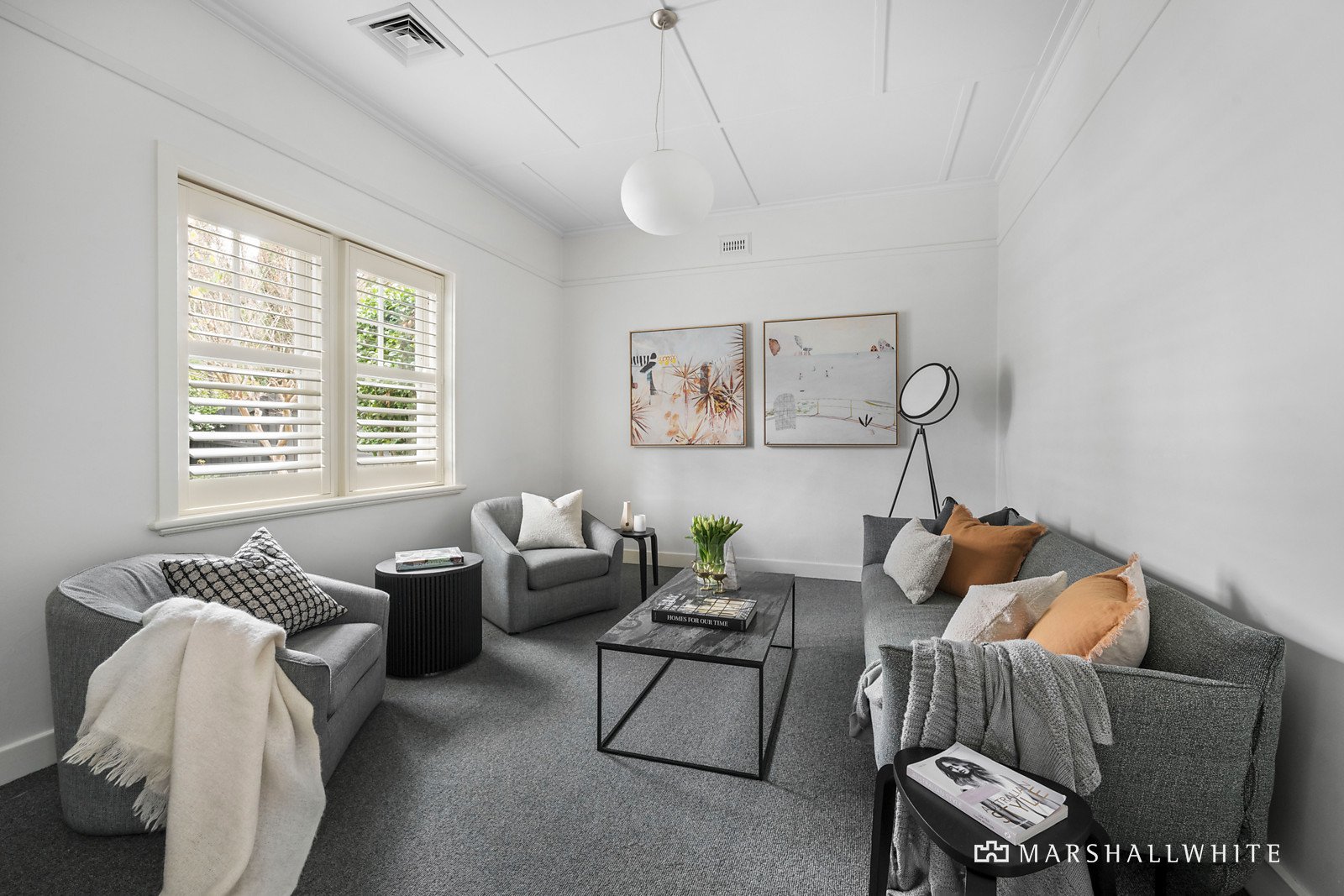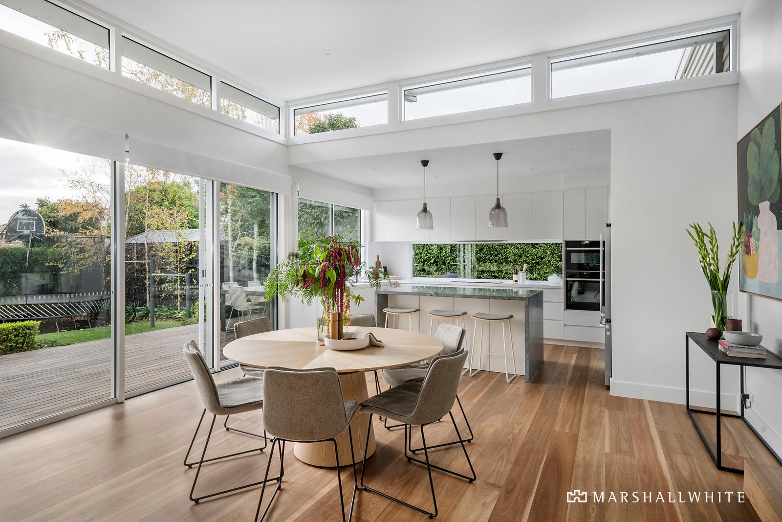 Matte finished Spotted Gum floors add contemporary refinement to the extra wide central hall featuring high original ceilings and decorative fretwork. From the hall, is an inviting sitting room with plantation shutters, the main bedroom with walk in robe and designer en suite, three additional bedrooms with built in robes, stylish bathroom with separate powder-room and a fitted home office. Ultra-high ceilings amplify the expansive scale of the open plan living and dining room with a gas log fire and sleek gourmet kitchen boasting Neff induction cooktop and double wall ovens, stone benches and walk in pantry. Stacking glass sliders extend the living area out to a large deck and the entirely private west-facing garden all surrounded by hedges.