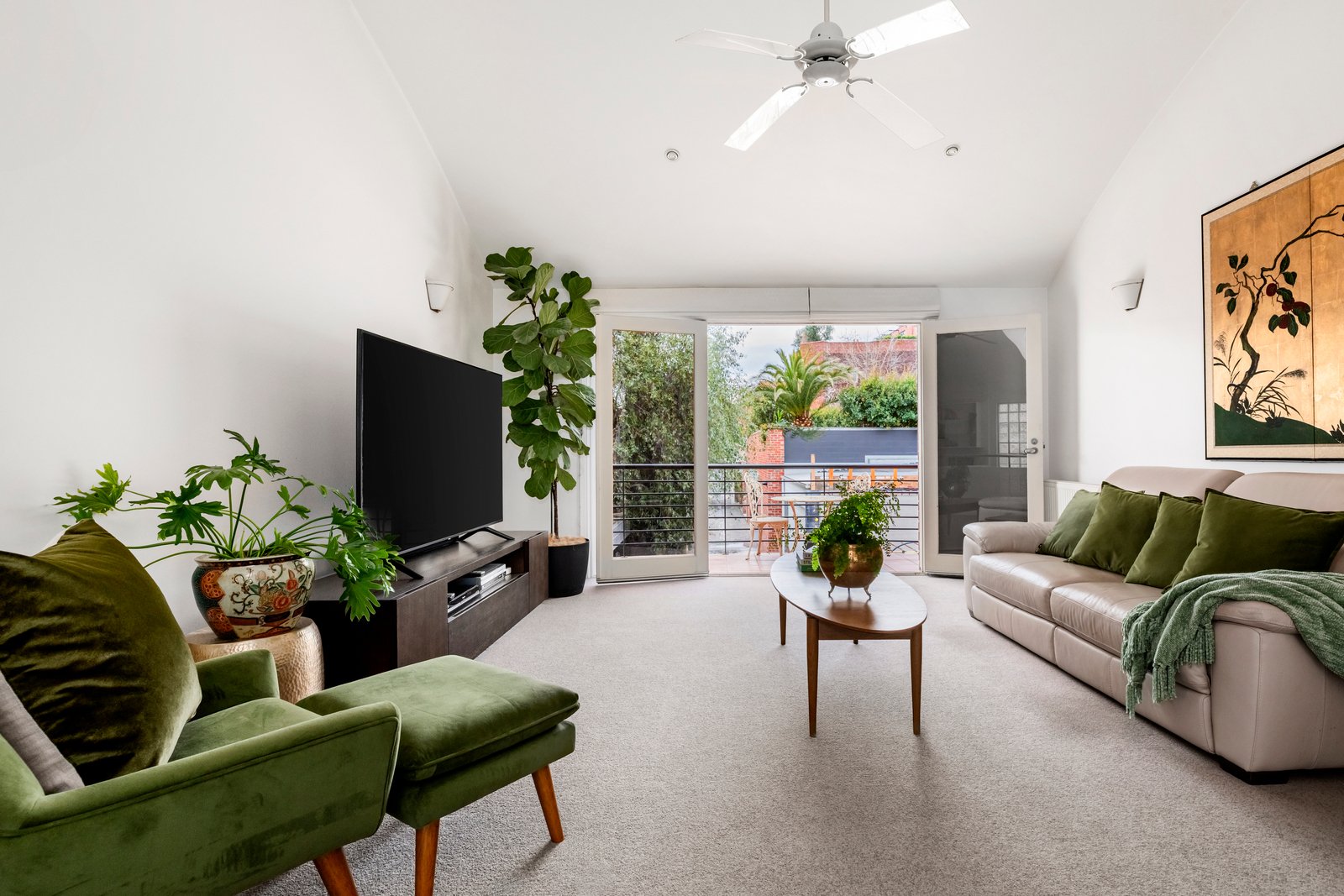Bathed in northern light and featuring timber floors underfoot, the generously proportioned living room with a gas log fire and inviting dining space surround a sublime gourmet kitchen appointed with white stone benches, 90cm Ilve oven and integrated fridge/freezer. Living extends out to a glorious north-facing paved courtyard, a private sun-drenched oasis perfect for al fresco dining. Also opening to the courtyard, the captivating main bedroom features a lavish ensuite and walk in robes. Beneath soaring ceilings, upstairs accommodation comprises two additional robed bedrooms, a designer bathroom with bath and separate powder-room and a spacious 2nd living room with fitted study area opening to a wide north-facing balcony.