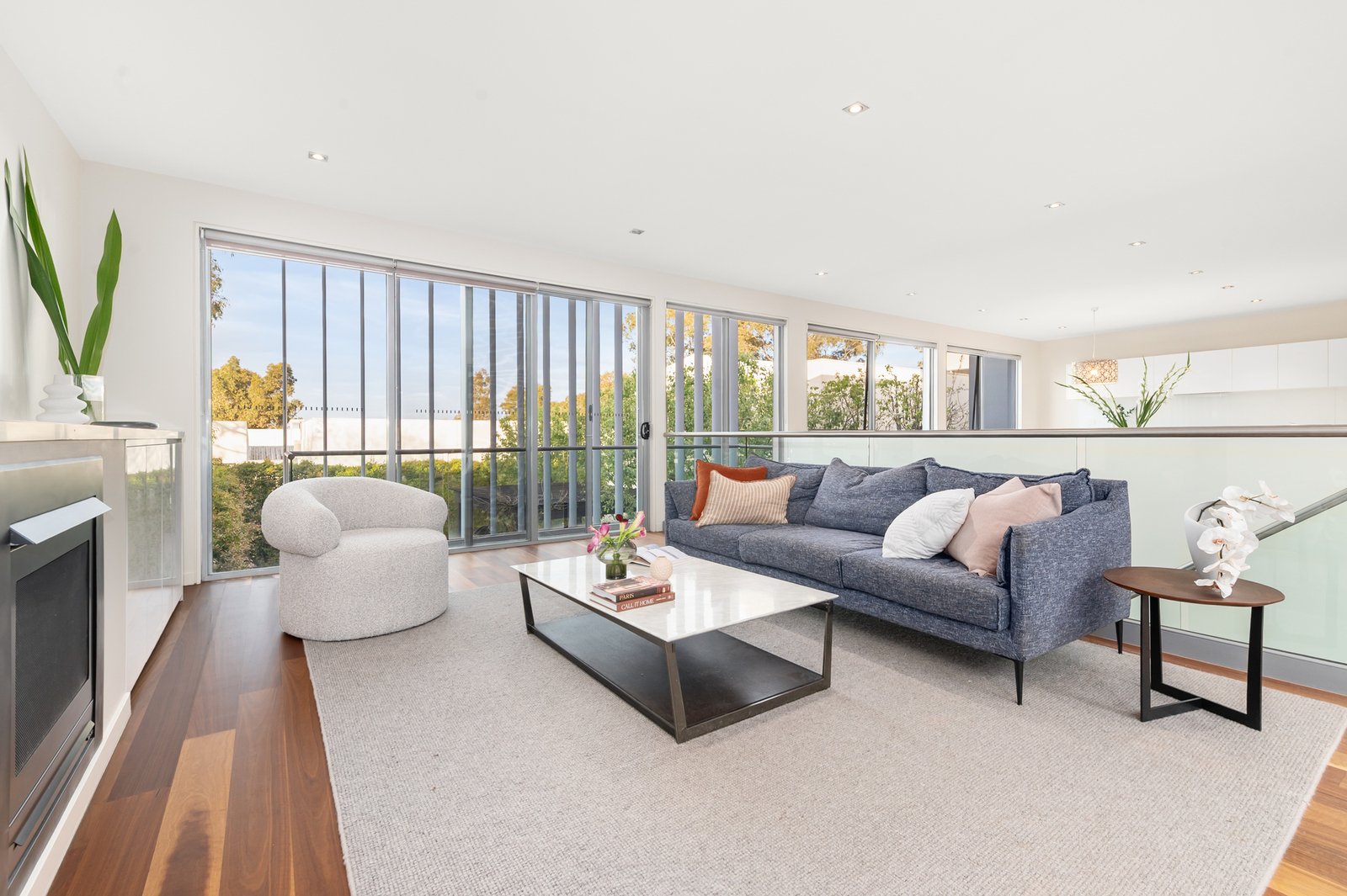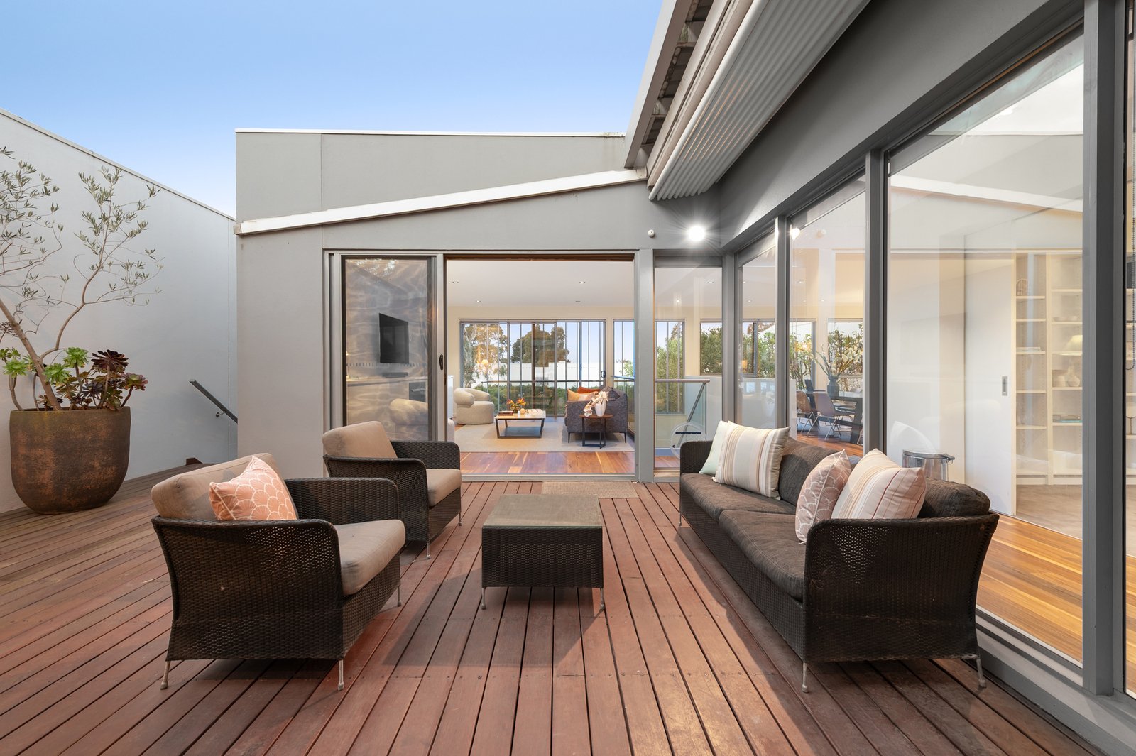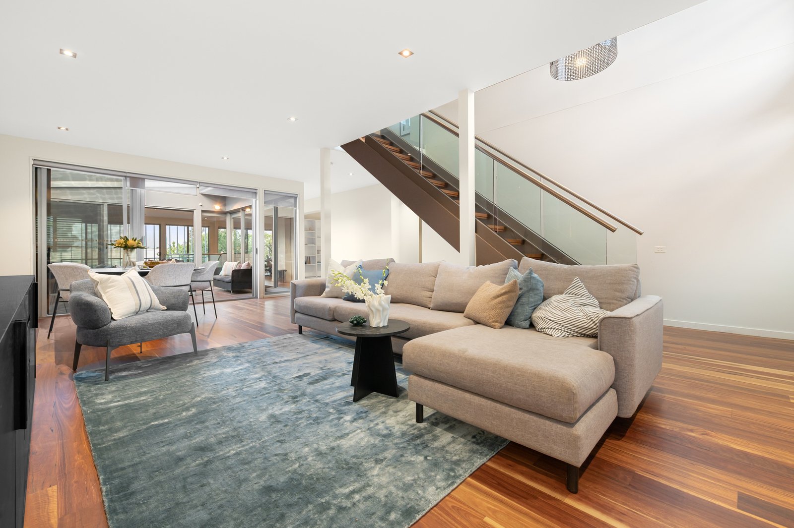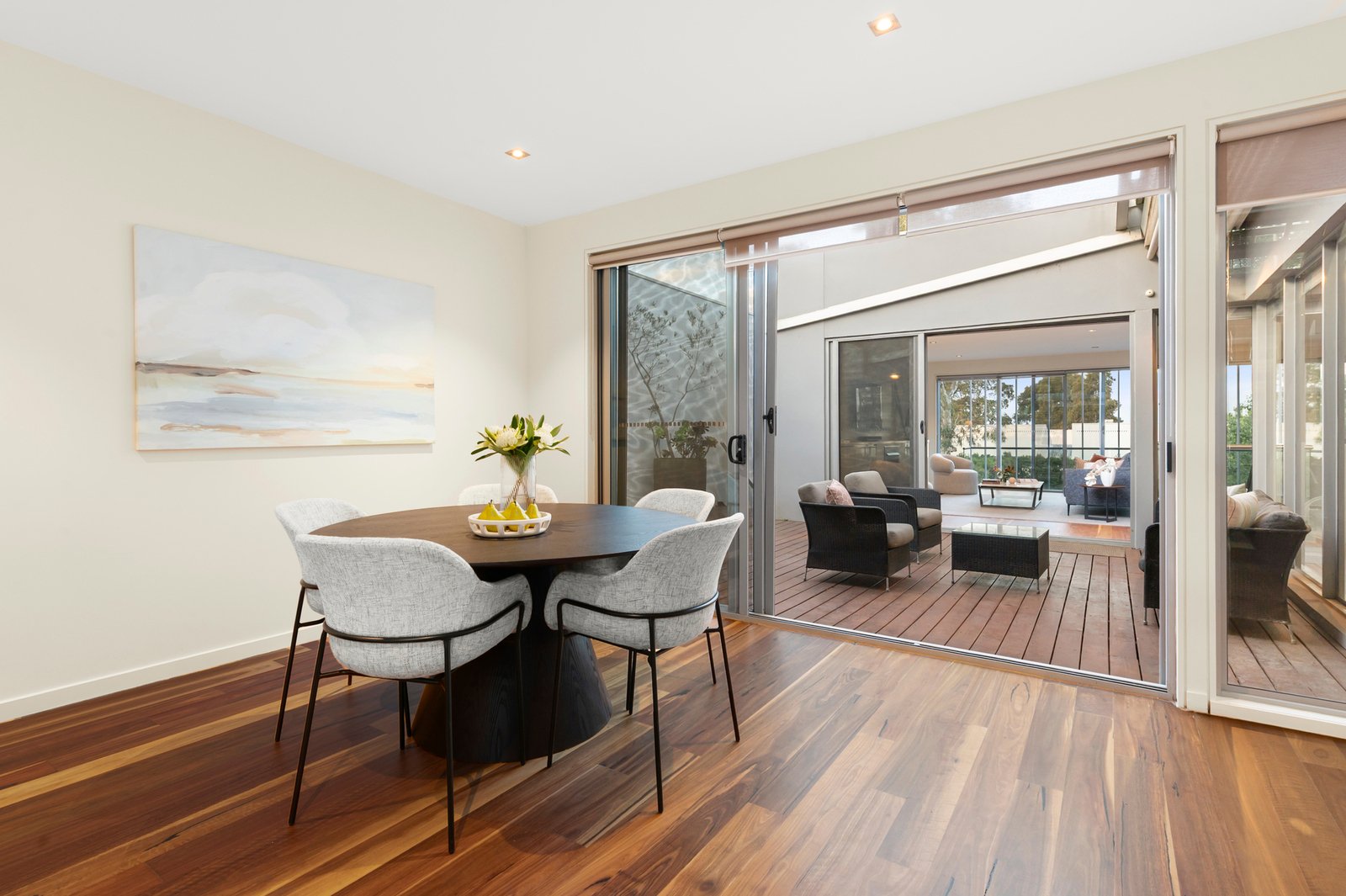 The interior over three levels offers a striking combination of space and light delivering a relaxed low maintenance lifestyle with its flowing living and entertaining areas featuring warm spotted gum polished floors and a soaring second level ceiling over the staircase; with large strategically positioned windows and full-height glass walls in the living areas filling the home with an abundance of natural light. Level one opens to a sitting and dining room, a northern central deck with a remote awning, laundry, powder room and spacious home office or fourth bedroom. Through to an expansive full-width informal living and dining room incorporating a superbly appointed kitchen with stone bench-tops, long island bench and a full suite of prestige Miele appliances and integrated fridge/freezer overlooking the rear garden - creating ideal indoor/outdoor dining and entertaining options. A sumptuous upper-level main bedroom has a parents’ retreat, WIRs, a dual shower ensuite and a front balcony. A further two double bedrooms with built-in robes, a study alcove, retreat and a family bathroom are located on the lower level. Opening to an ornamental tree-lined rear garden complete with a vine-clad pergola and a solar heated pool providing a wonderful haven for alfresco entertaining and family enjoyment. Other features include video intercom entry, ducted heating and cooling, Heat ‘n Glo fireplace (family living), extensive storage including a storeroom and potential cellar, rainwater tank, and remote double garage with direct internal access.