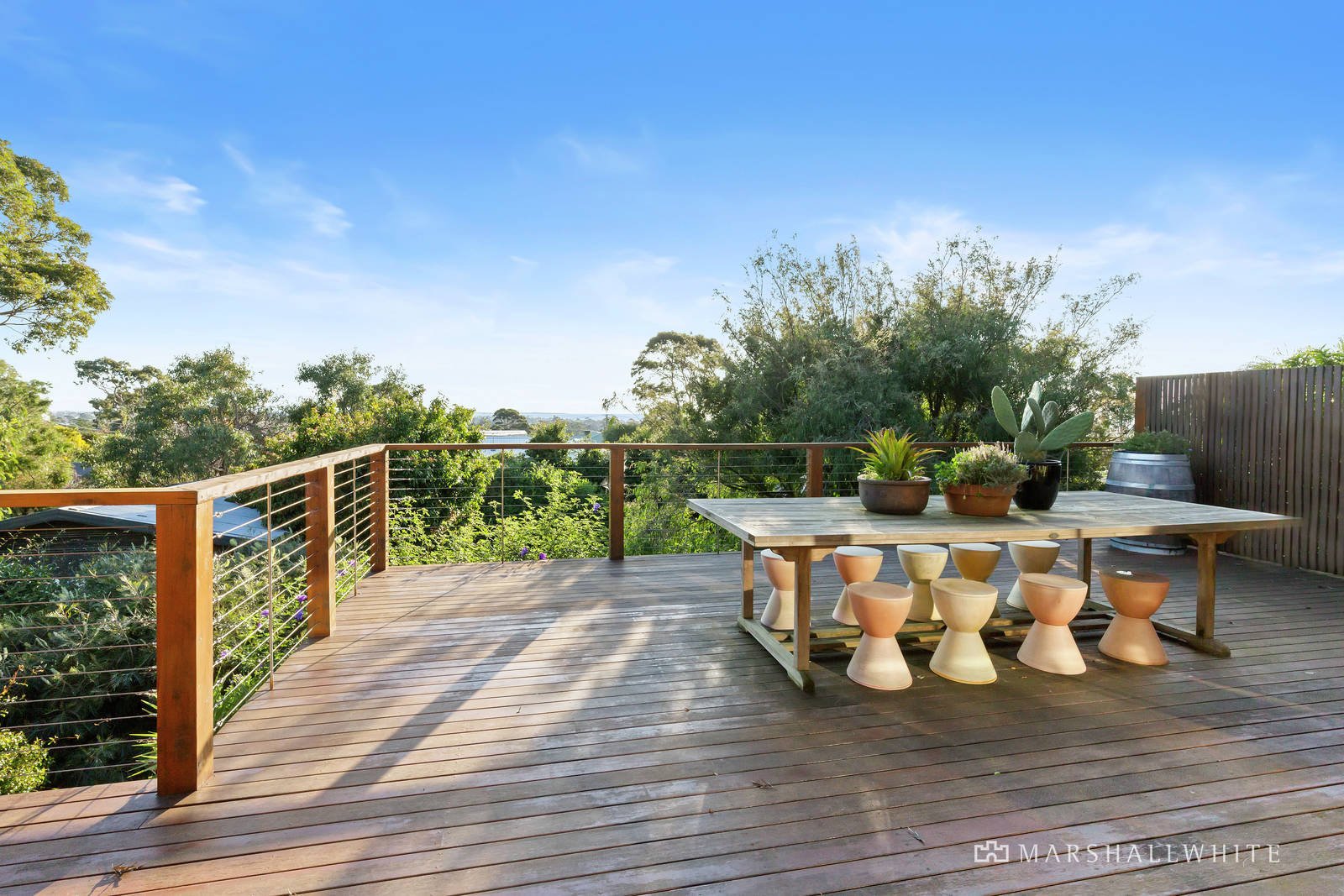 The enormous upstairs decked space must be mentioned first for the incredible lifestyle options it creates. The merbau construction wraps around all sides and features trellising and a verandah with sun blinds, allowing both sunny and shady spots to be enjoyed all day. Elevated yet extremely private with timber screening and established hedging, this space will play host to large and intimate gatherings with bay views as your backdrop.