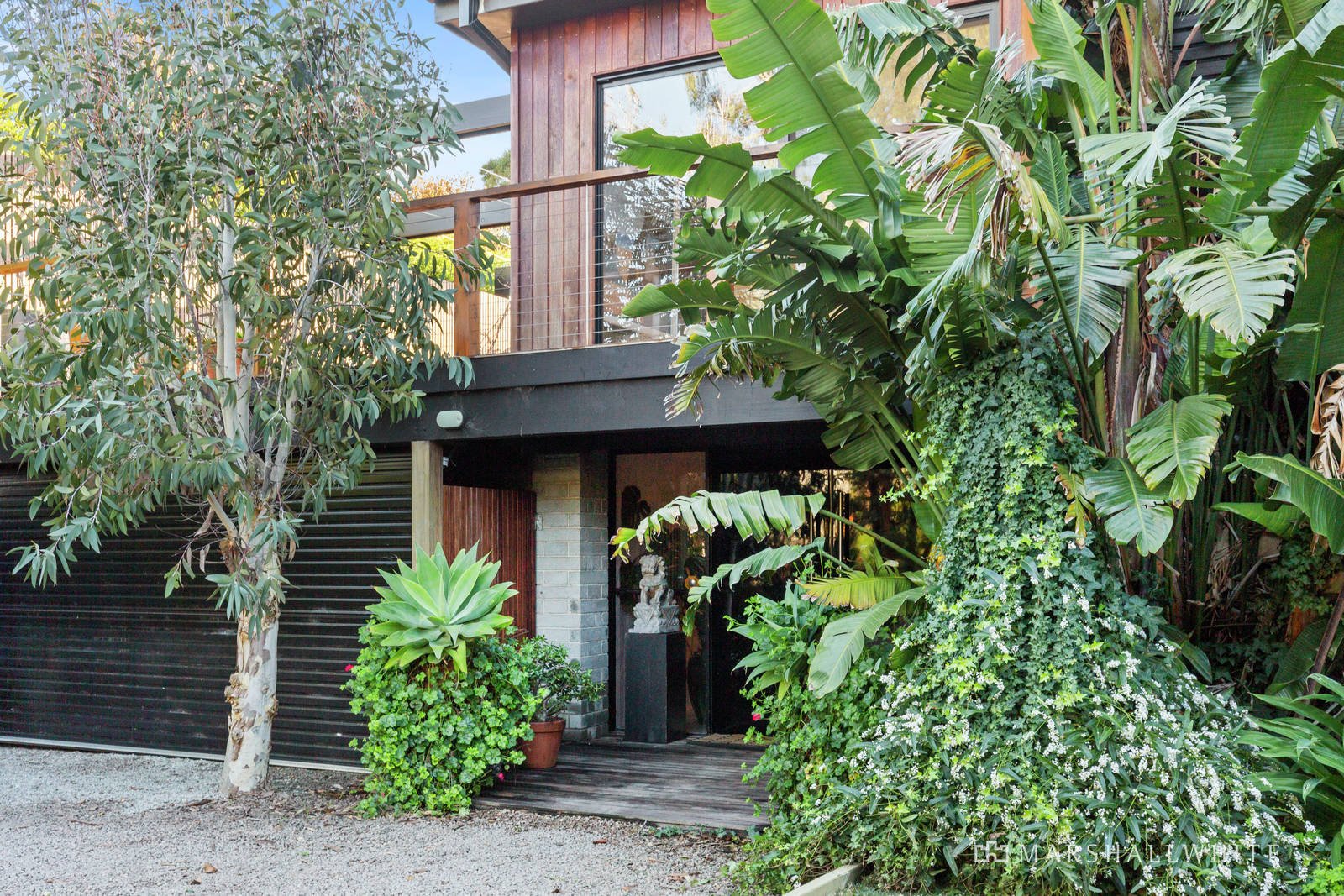 Established exotics set the scene for this calming oasis that celebrates seamless inside/outside living on both levels.
