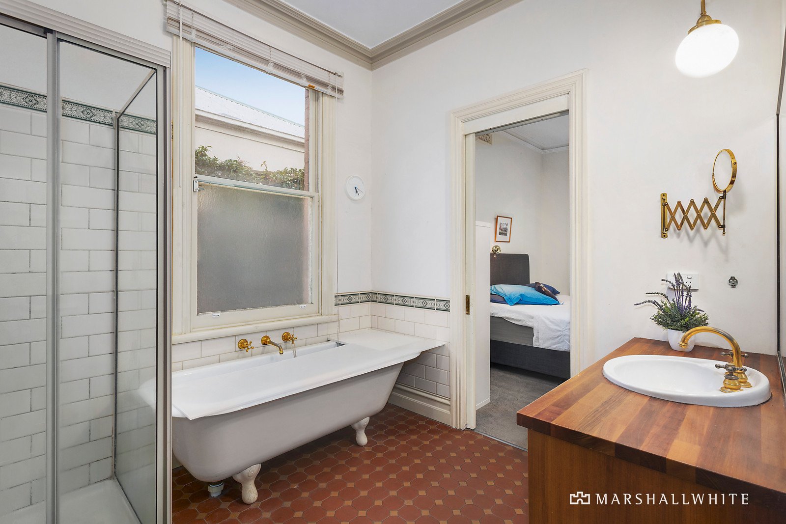 Built in the 1880s, the interiors are resplendent with period features including intricate plasterwork and ornate fireplaces. The generously proportioned dimensions include soaring ceilings, and a wide central hallway leading from a formal entry hall. Currently configured as three bedrooms, including a front bedroom with ensuite, and a rear master suite with study and sitting area, and bathroom access. There is a formal lounge and adjacent sitting room with French doors opening to a private courtyard. The casual open-plan family area, with classic cork-tiled flooring, includes a conservatory-style dining area overlooking the pool and decked alfresco area, while the modern central kitchen is fitted with stainless steel Westinghouse appliances including a gas cooktop, wall oven and separate grill. There is an angular timber island bench/breakfast bar while an adjacent laundry/utility room could easily serve as a butler's pantry.