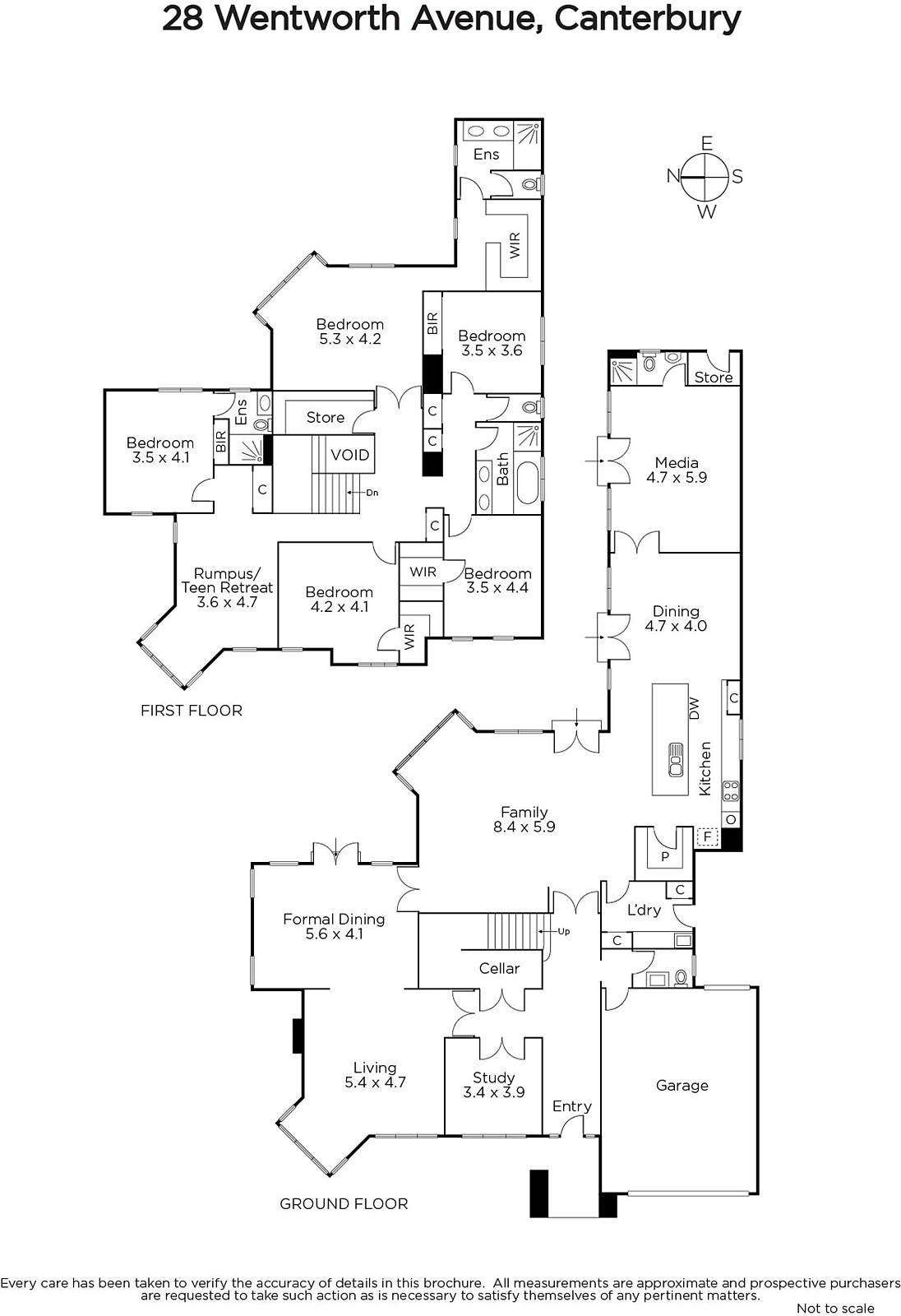 A wide frontage and leafy landscaping creates an ideal introduction to an immaculate interior of grand proportions; featuring a wide hallway with polished timber floors flowing past a study, powder room, formal sitting room (gasFP) & adjoining dining room to a north-east facing expansive family living domain with stylish CaesarStone/Euro appointed kitchen, WIP, large island bench and adjacent laundry plus media room, downstairs bathroom all overlooking paved alfresco areas, pool and a private garden. Whilst upstairs features a retreat/study area, five bedrooms, main with WIR & fully-tiled ensuite, guest with ensuite, linen press/storage and a family bathroom. Other features include intercom, alarm, ducted vacuum, heating, evaporative & R/C cooling, cellar, 9,500ltr water tank, remote gates & double garage with direct internal access, off-street parking or turning area.