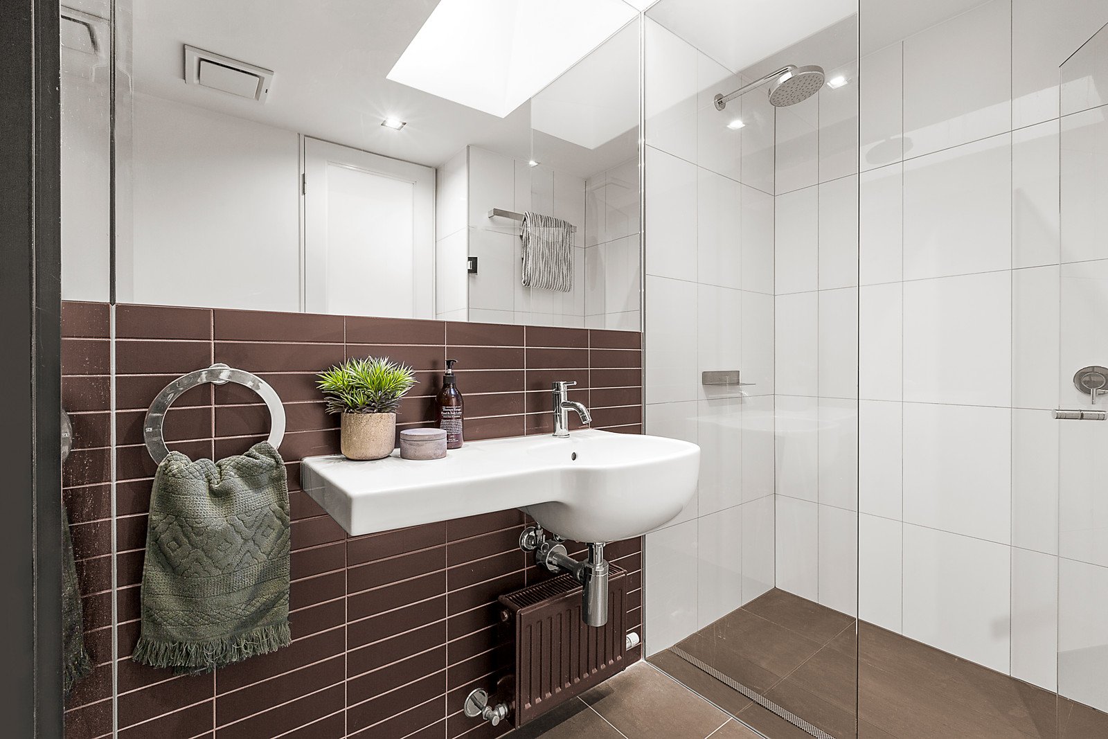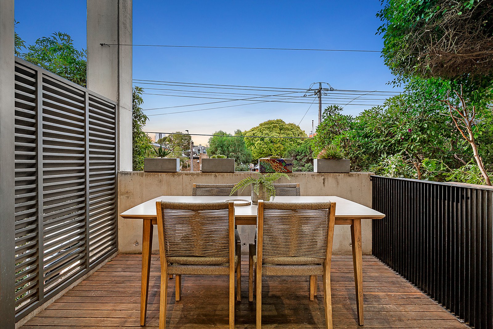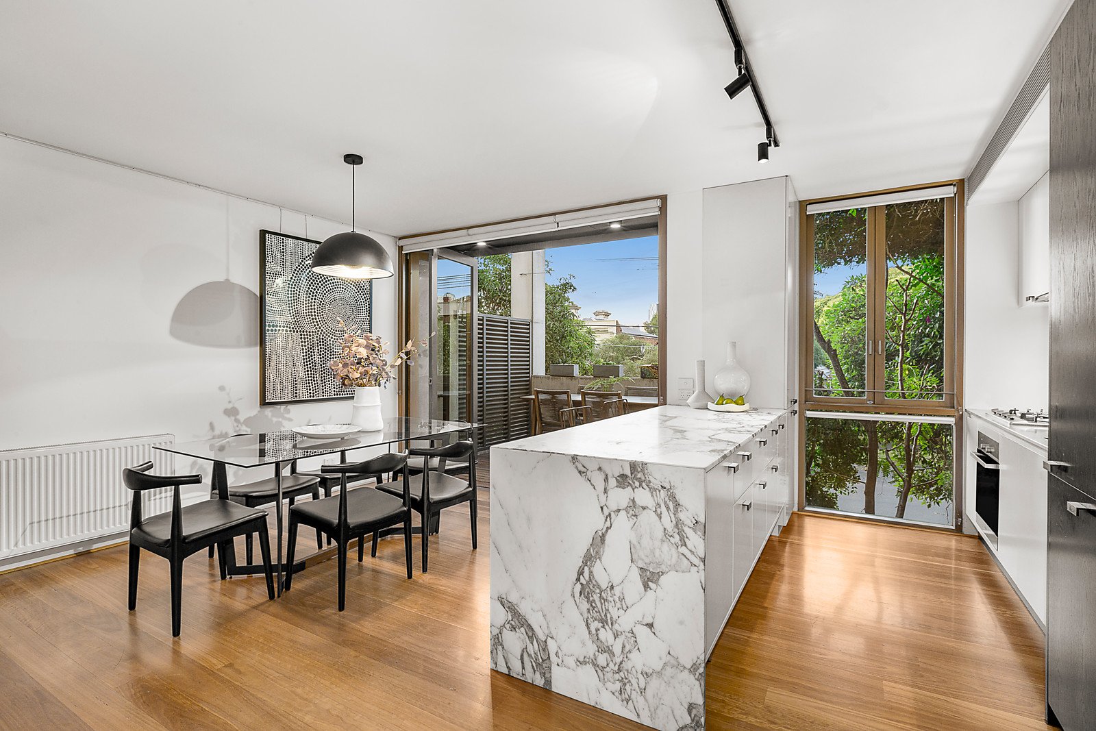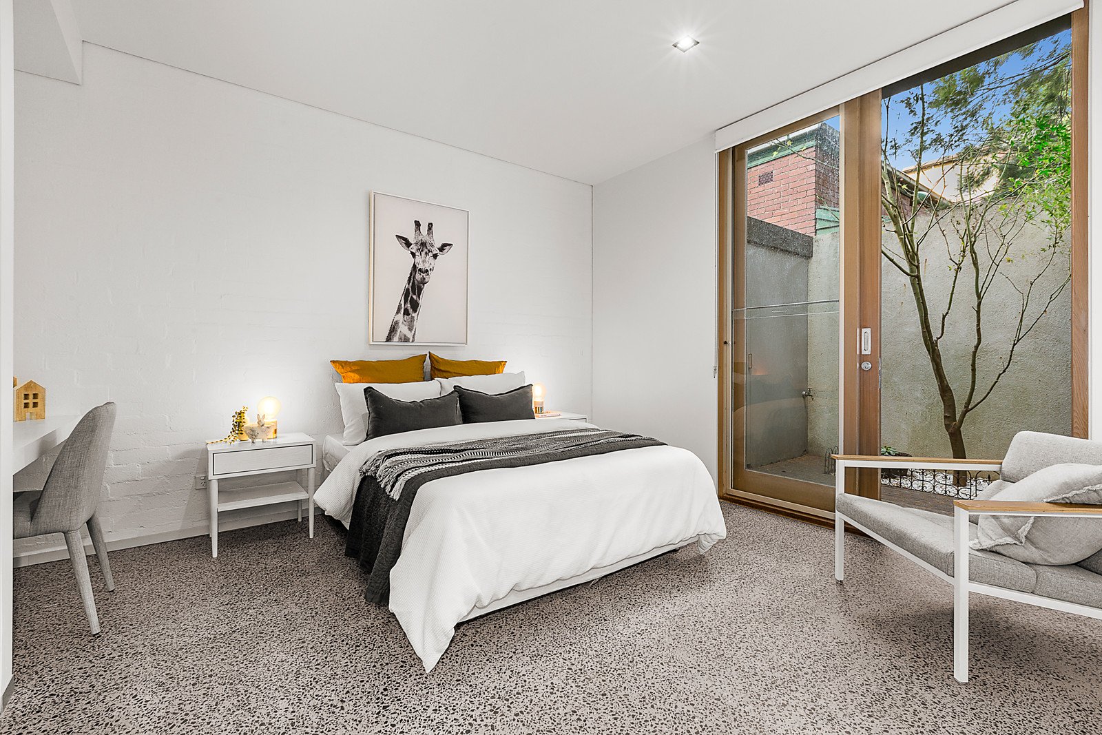 Behind a dramatic exterior, polished concrete floors with a terrazzo finish flow through the entrance hall to two double bedrooms opening to front and rear courtyards and a stylish bathroom. Timber stairs lead up to a fitted study nook and the generous open plan living and dining room with an open fire and sleek gourmet kitchen appointed with marble and stainless steel benches. Bi-fold doors open out to a private north-facing deck ideal for al fresco dining. The spacious main bedroom with built in robe and chic en suite enjoys its own level above opening to a large north-facing terrace offering wonderful city views.