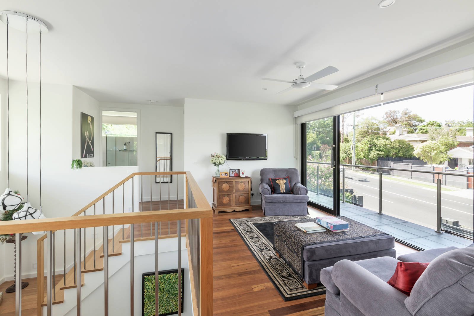 Upstairs offers another separate living zone, an open sitting room with double doors opening out to a full-length balcony with city views, and 2 well-proportioned bedrooms (with BIRs) looking out onto the balcony. A large north-facing terrace offers yet another area to relax. Large main bathroom with bath, shower, and in-floor heating. This home has been well designed with 6 Star energy rating, double glazed windows throughout, solar hot water, reverse cycle air conditioning, gas log fire, and ducted vacuum system, with a double garage and additional off-street parking.