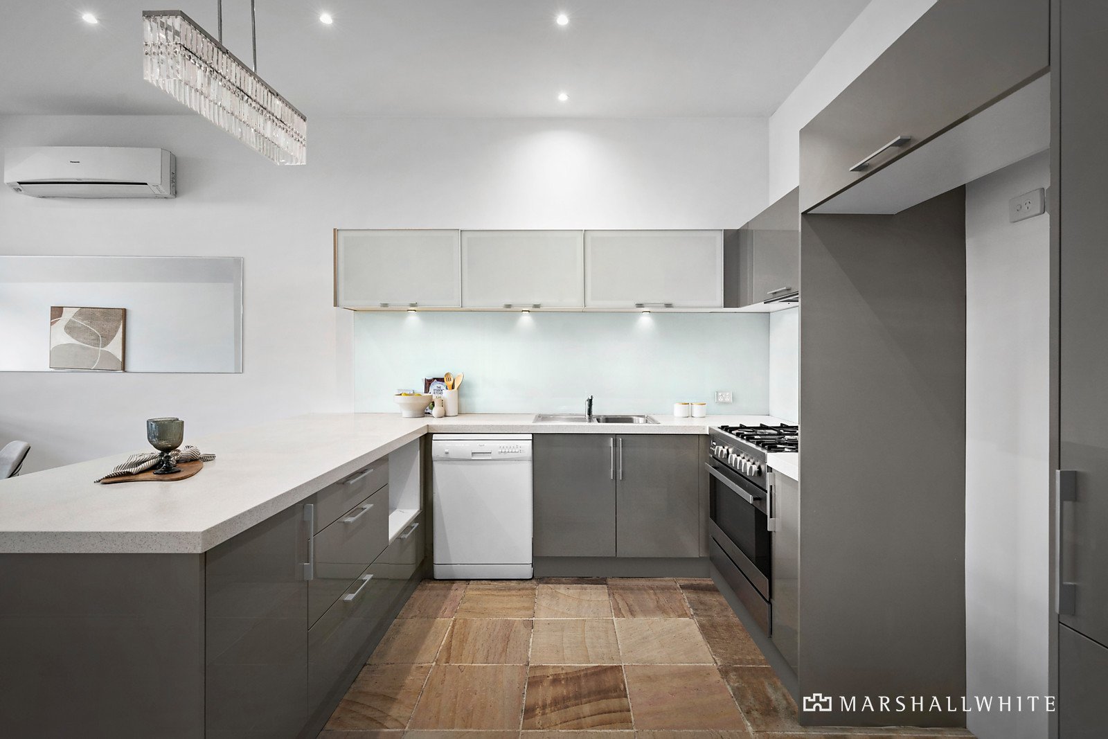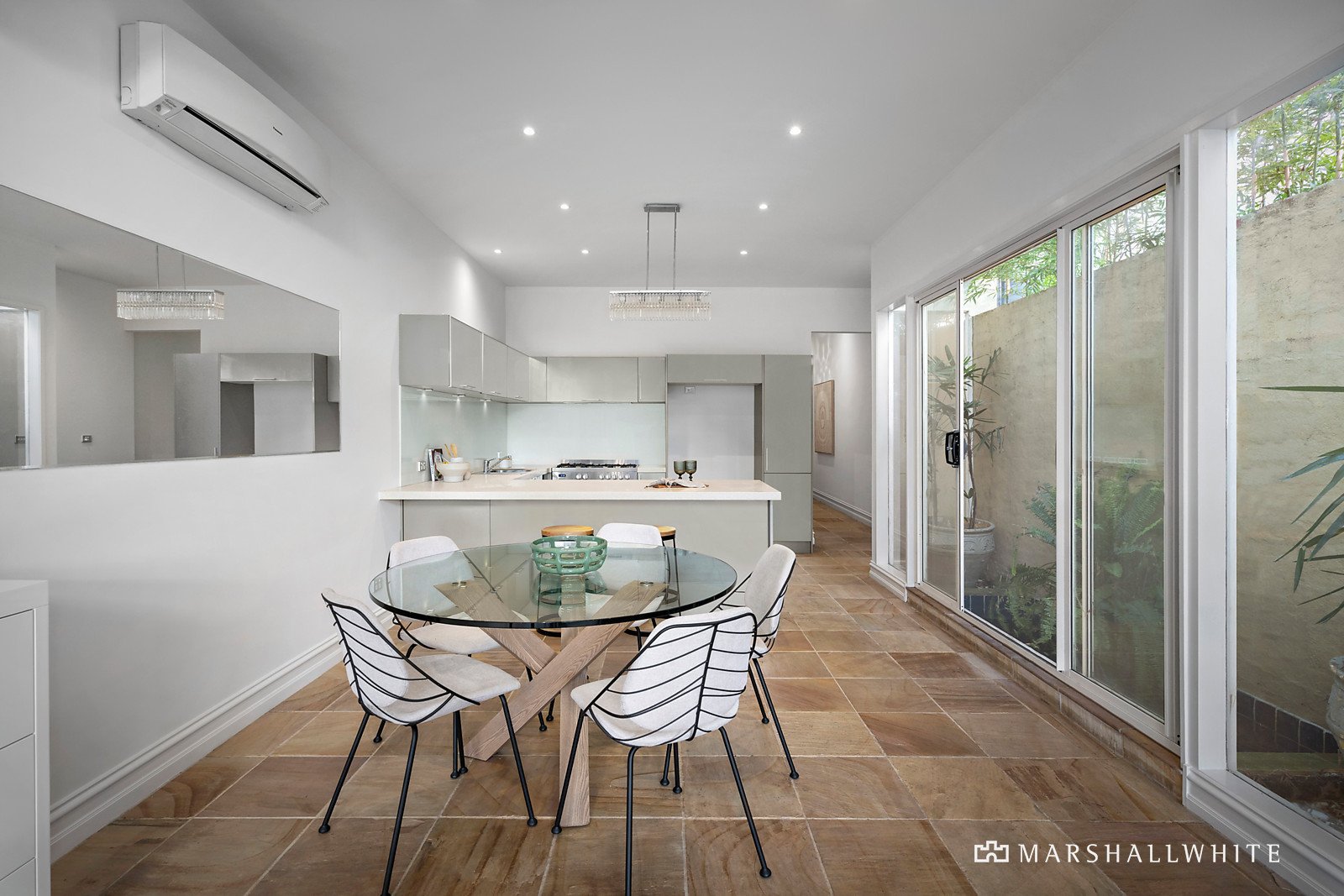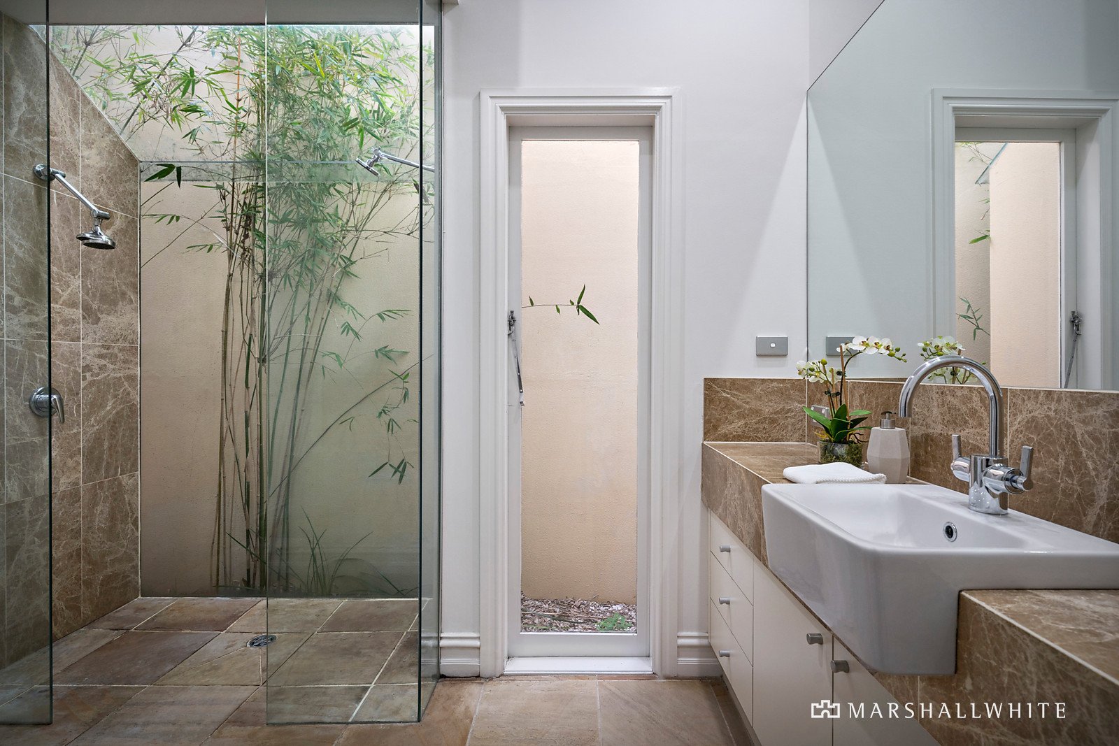Natural sandstone floors and walls of glass enrich the light-filled layout, introducing three bedrooms, all with built-in robes and a tranquil central bathroom overlooking the bamboo courtyard. Stainless steel appliances feature within a stone-topped kitchen with abundant storage, benefitting from an adjacent light-well courtyard and the glow of a gas fireplace in the living room.