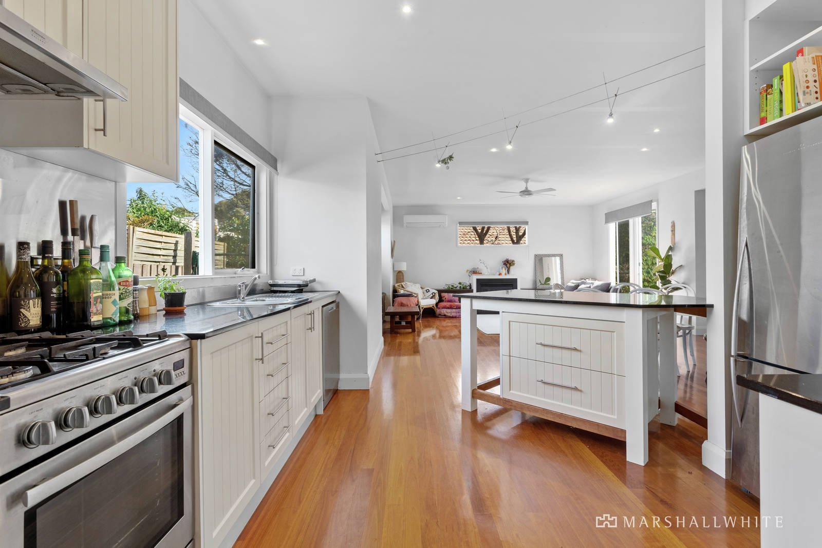 The home's charming beach-house exterior style is matched indoors with polished hardwood timber floors, lofty ceilings and a gas log fire in the open plan living/dining area, which has glass sliding doors opening out to the north-facing alfresco deck with built-in seating and an awning.