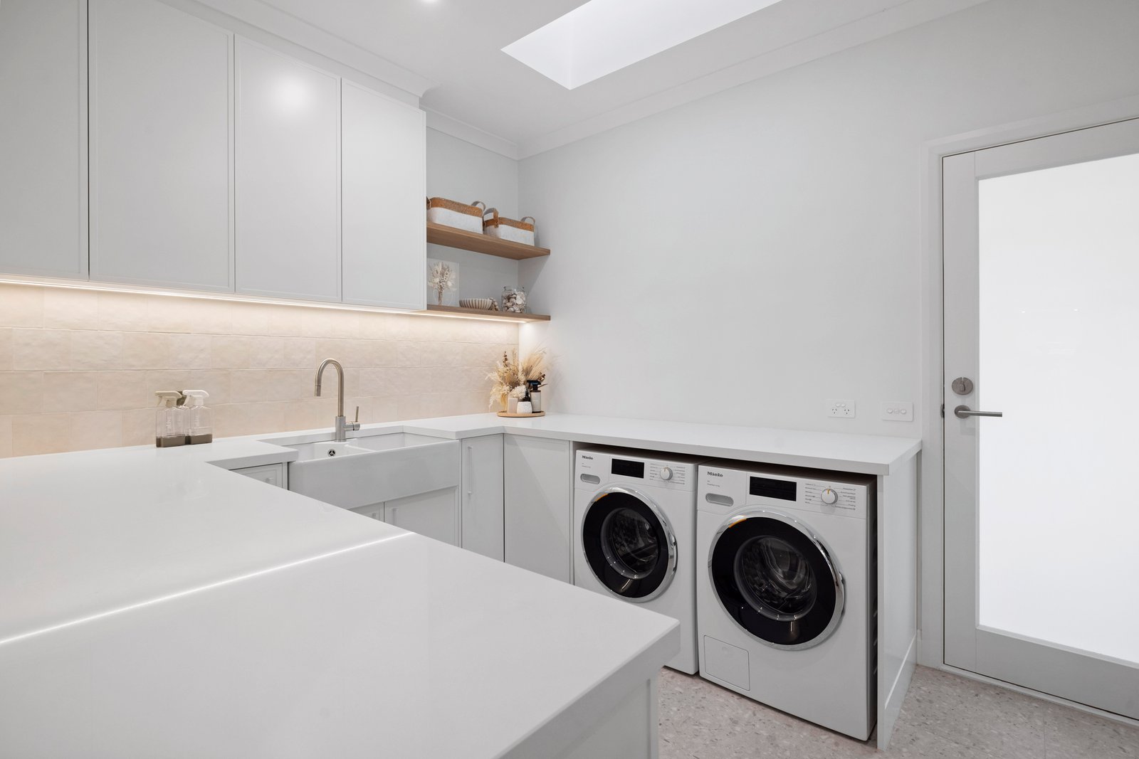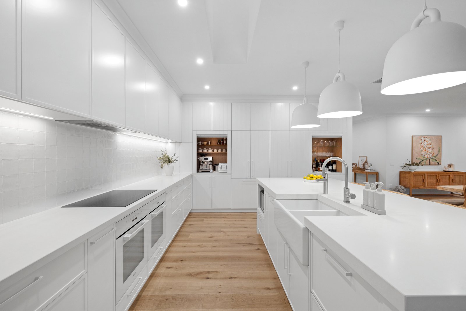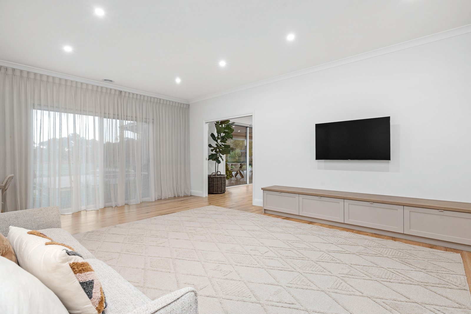 Wonderfully zoned, the accommodation wing spans five ensuite bedrooms, including four kids' bedrooms with built-in robes and two Jack and Jill bathrooms. The main suite is a stylish sanctuary with a fitted walk-in robe and a deluxe ensuite with a freestanding bath and fluted glass features. Two additional living areas enhance the home's spacious layout, including a formal lounge with a gas fireplace and a kid-friendly rumpus room featuring wall-to-wall storage.