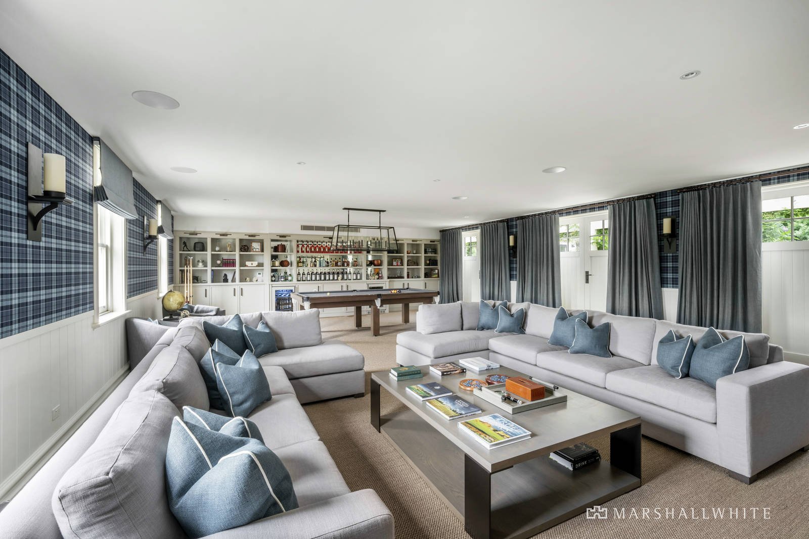 Moody and sophisticated, a seductive ambience spills across converted stables, where hues of navy engulf a recreational zone complete with pool table and bespoke bar, and original stable doors open to expand entertaining prospects, whilst plentiful loft accommodation can be found above. Supplementary stables ground secondary loft-style accommodation, concealing a recently finished steam room, dedicated golf simulator, and complementary health retreat.