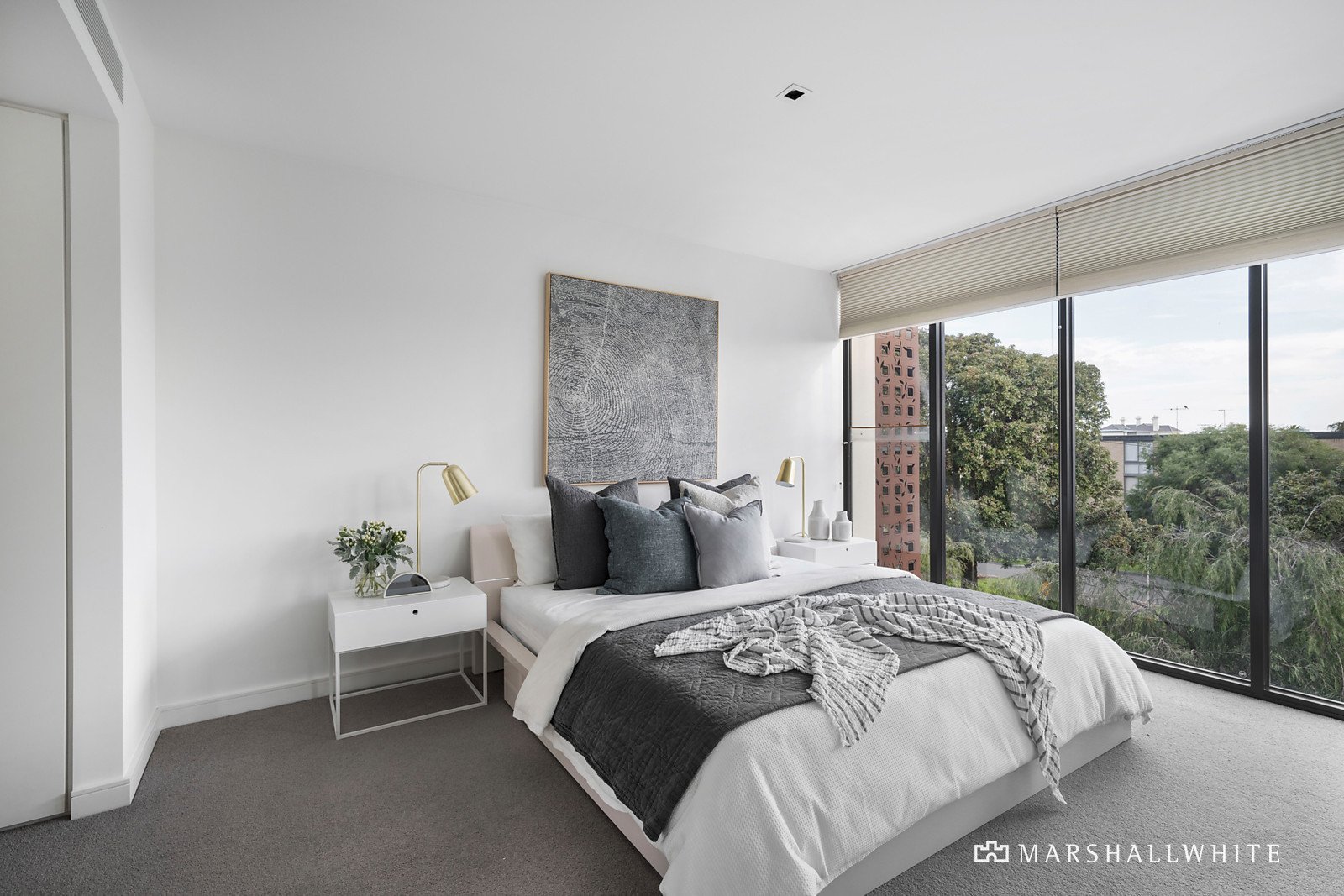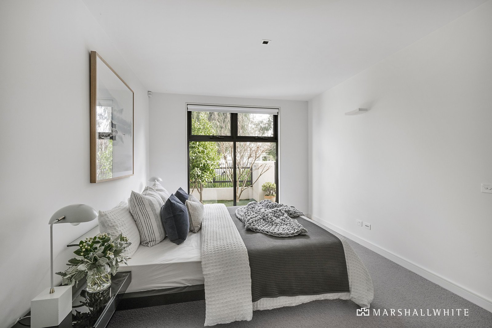 The home office/lounge upstairs enjoys the extent of the bay views and offers lifestyle flexibility as an additional bedroom if required. Other appointments include a directly accessed double remote garage with internal access, powder room, a full laundry, video intercom, alarm, reverse-cycle and ducted heating/cooling and abundant storage on each level. With the privacy of a tree-lined street and low-maintenance front gardens, the home's privileged location shines, just steps from Gasworks Park, Albert Park College, Victoria Street's cafes and restaurants and city-bound trams.