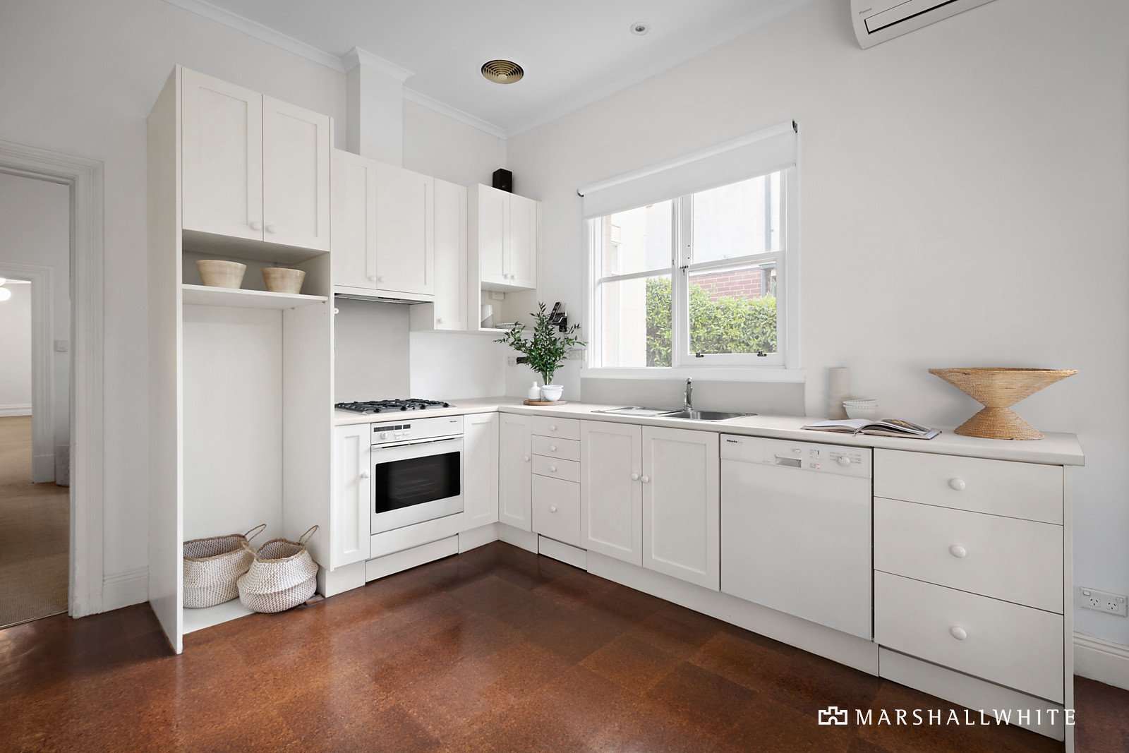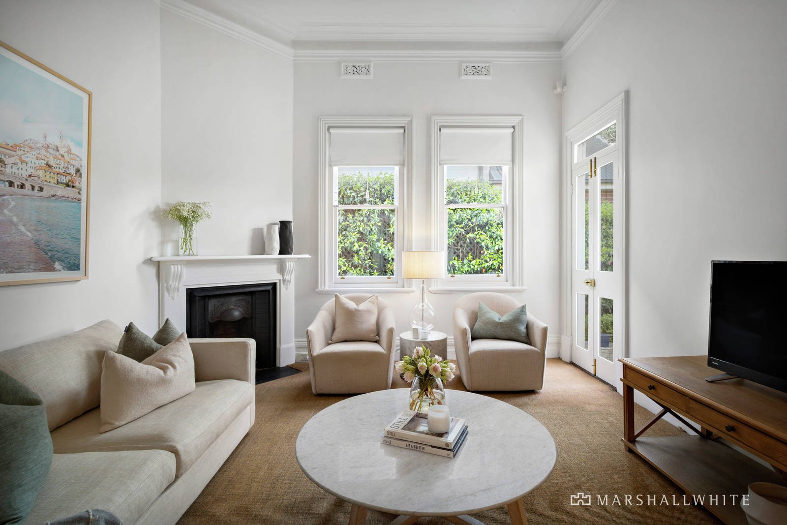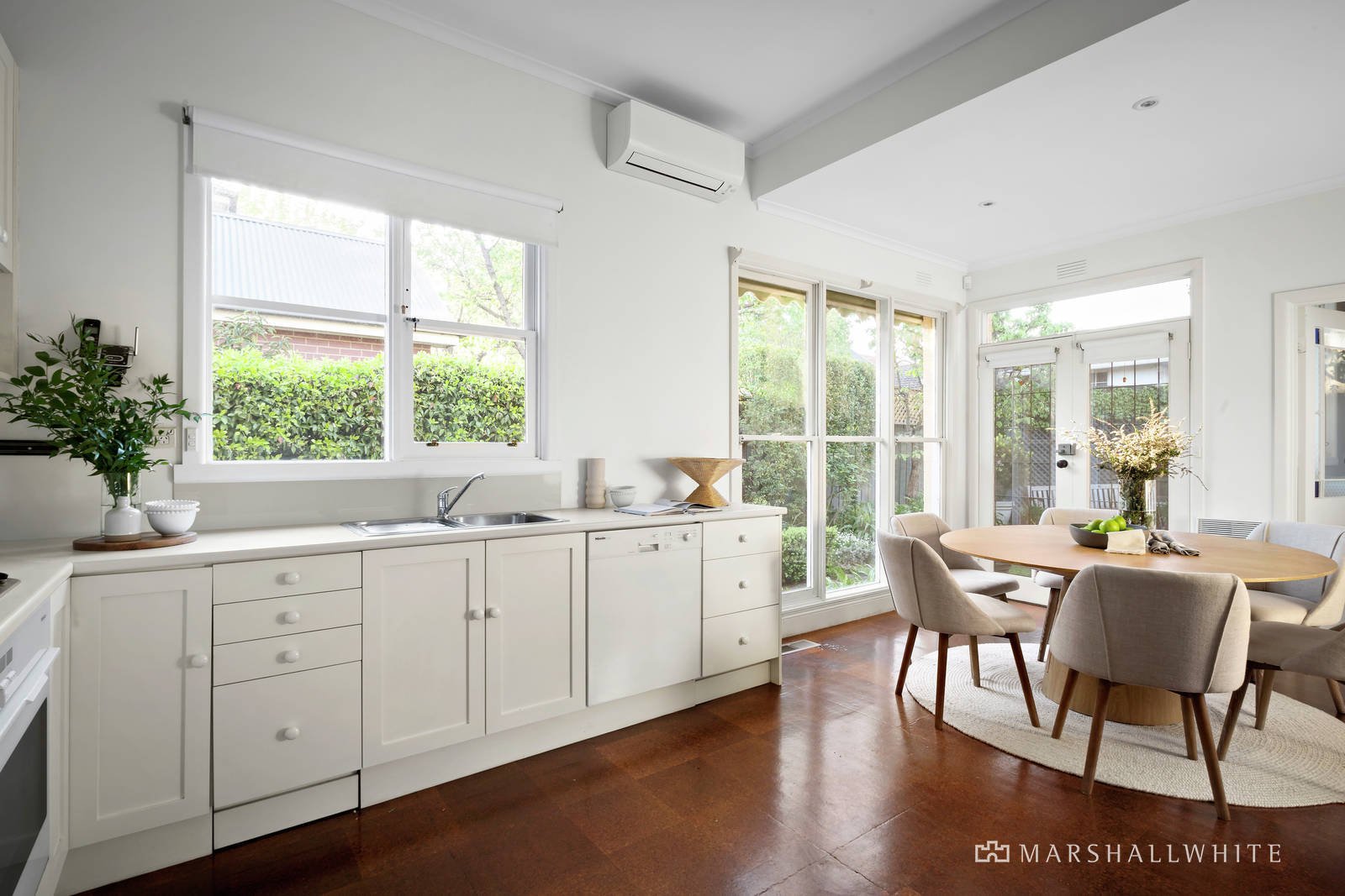 Its appealing street presence is enhanced by an elevated facade featuring a return verandah with tessellated tiles, established gardens and leadlight entry. Defined by soaring ceilings, pretty period features and wonderful natural light, its interiors include an inviting entrance hallway, and a sun-filled central living room with gas fireplace and French doors to a private established garden. The well-appointed kitchen boasts a Miele oven and dishwasher and is accompanied by a sun-lit dining space with a further set of French doors accessing the leafy gardens.