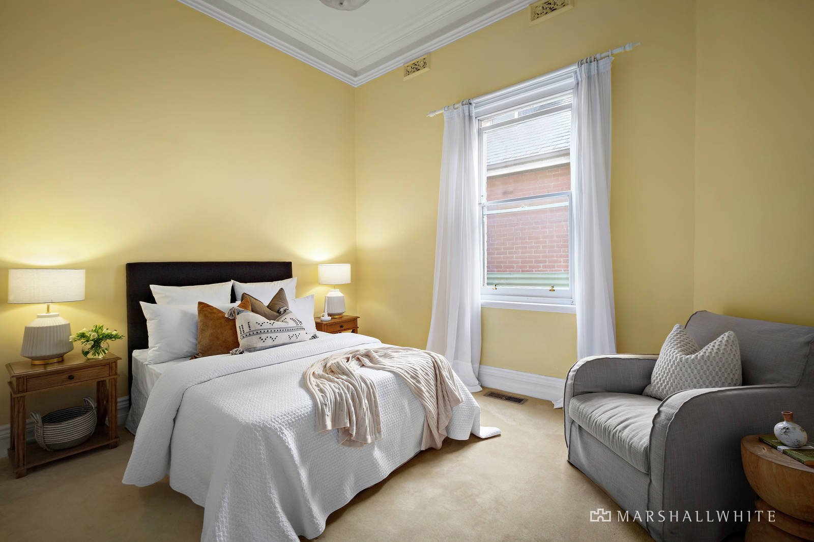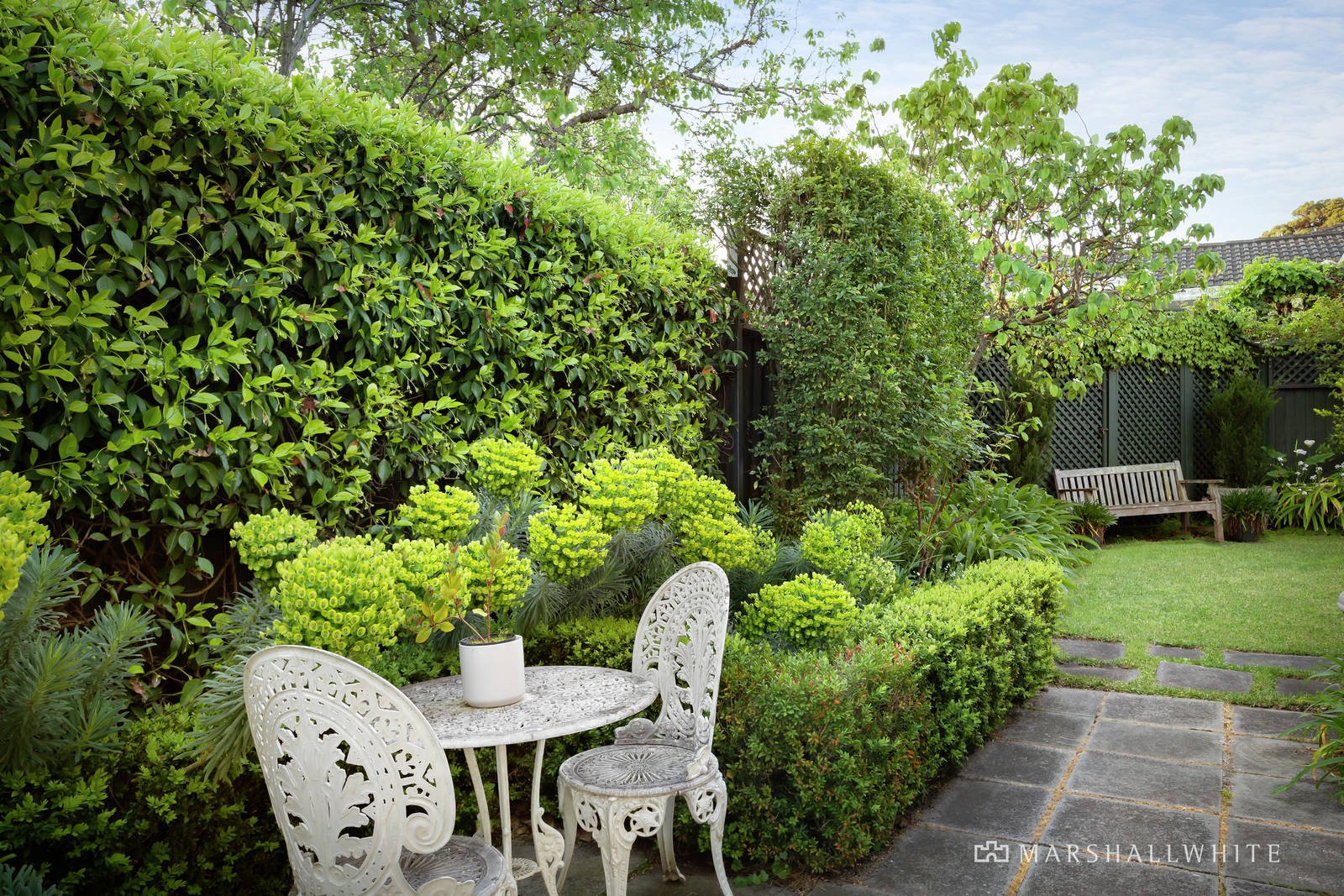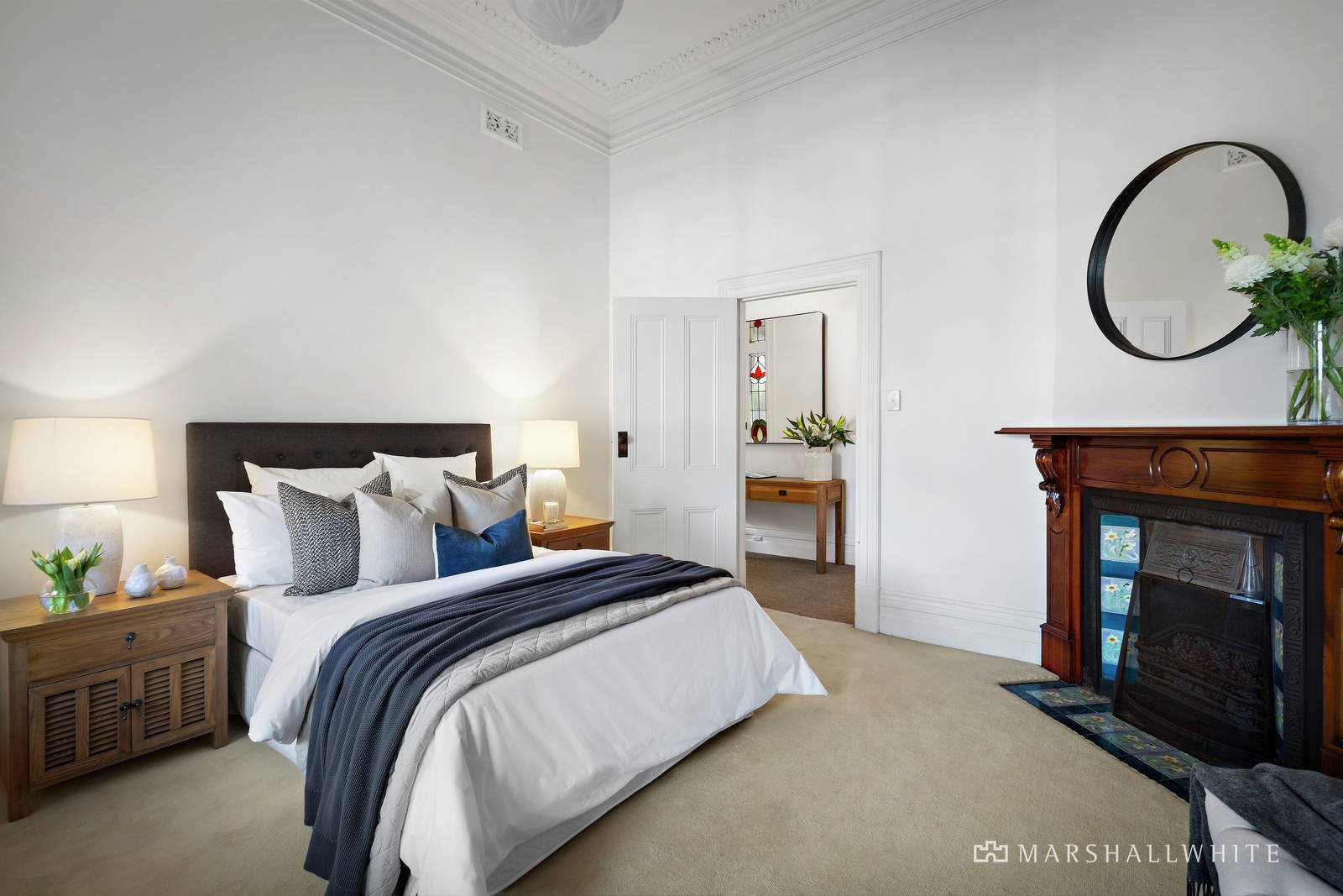 Its appealing street presence is enhanced by an elevated facade featuring a return verandah with tessellated tiles, established gardens and leadlight entry. Defined by soaring ceilings, pretty period features and wonderful natural light, its interiors include an inviting entrance hallway, and a sun-filled central living room with gas fireplace and French doors to a private established garden. The well-appointed kitchen boasts a Miele oven and dishwasher and is accompanied by a sun-lit dining space with a further set of French doors accessing the leafy gardens.