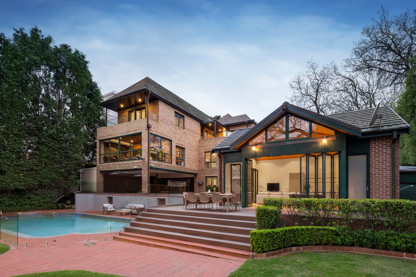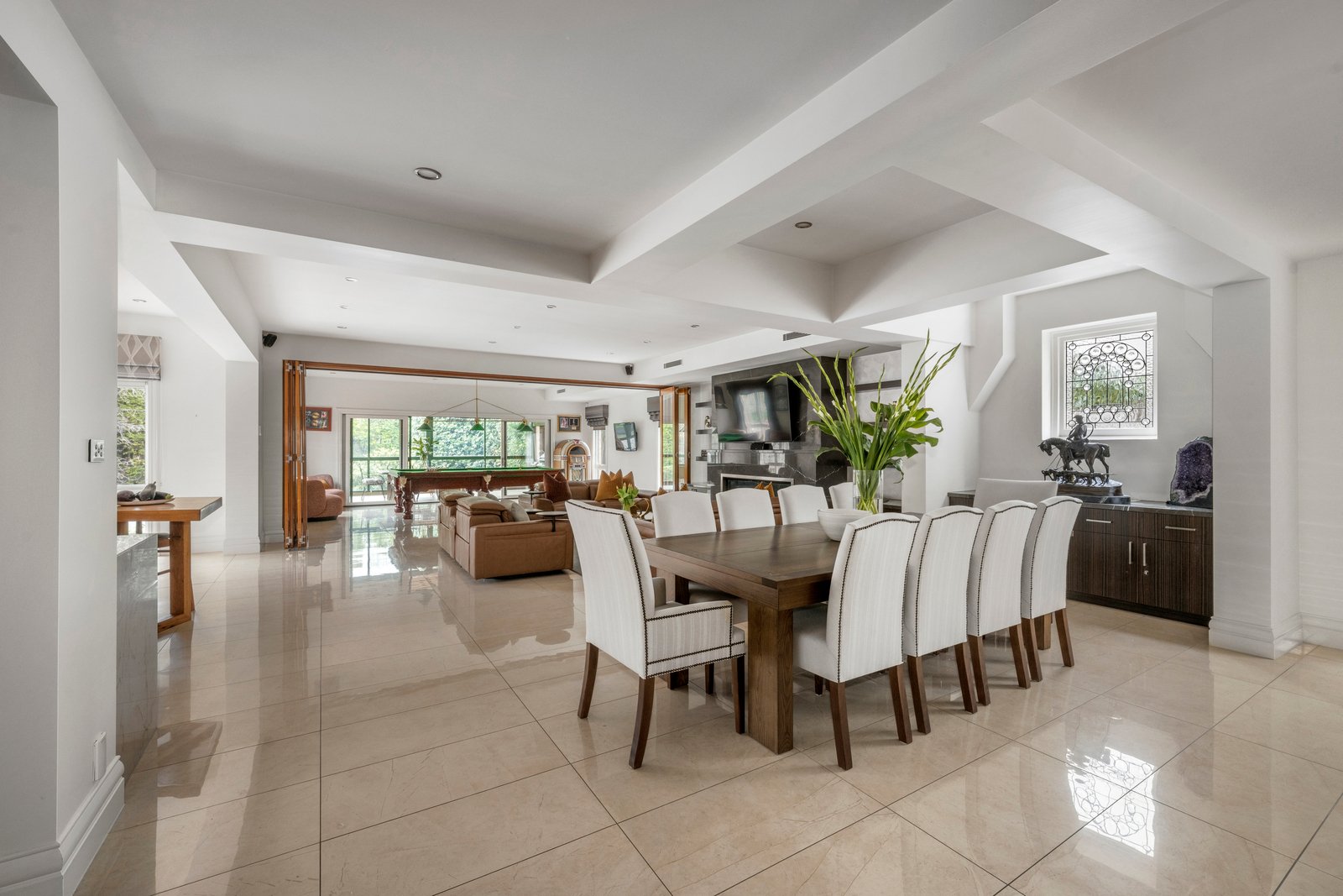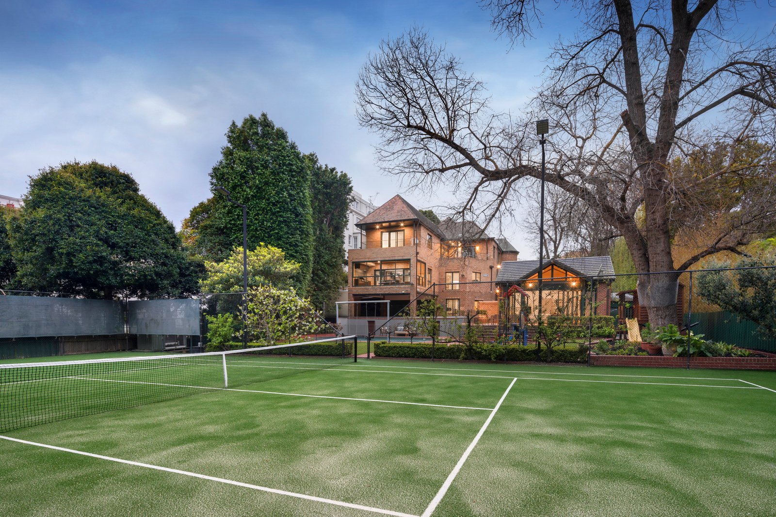 Transformed for contemporary living and large-scale entertaining, the informal living and dining domain extends to a chef-inspired kitchen appointed with a Wolf cooktop and ovens, induction cooking, and integrated refrigeration. A bespoke hardwood table inset within the quartzite island, complements the hosting appeal, with bi-fold doors connecting the family areas to the elevated game rooms and indoor-outdoor dining room, set above the pool and tennis court. Beyond, manicured gardens with brick pathways lead to a self-contained guest house, playground and relaxed outdoor zones, all privately enclosed by mature greenery.