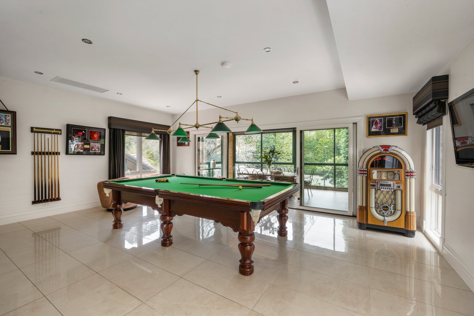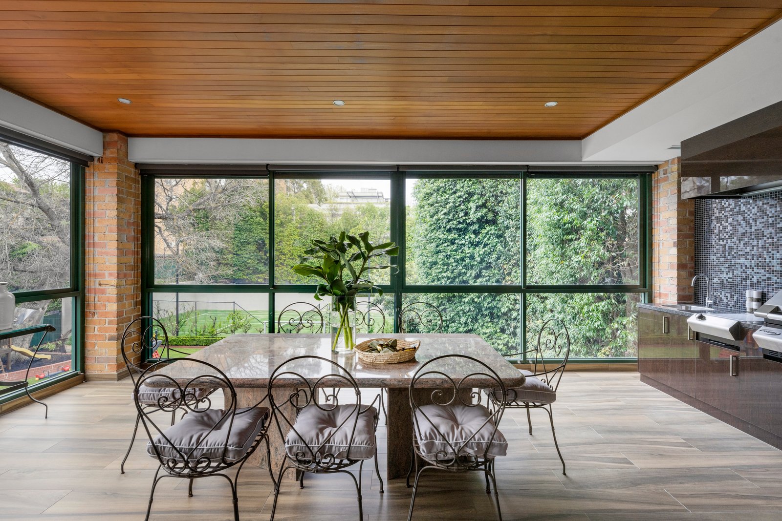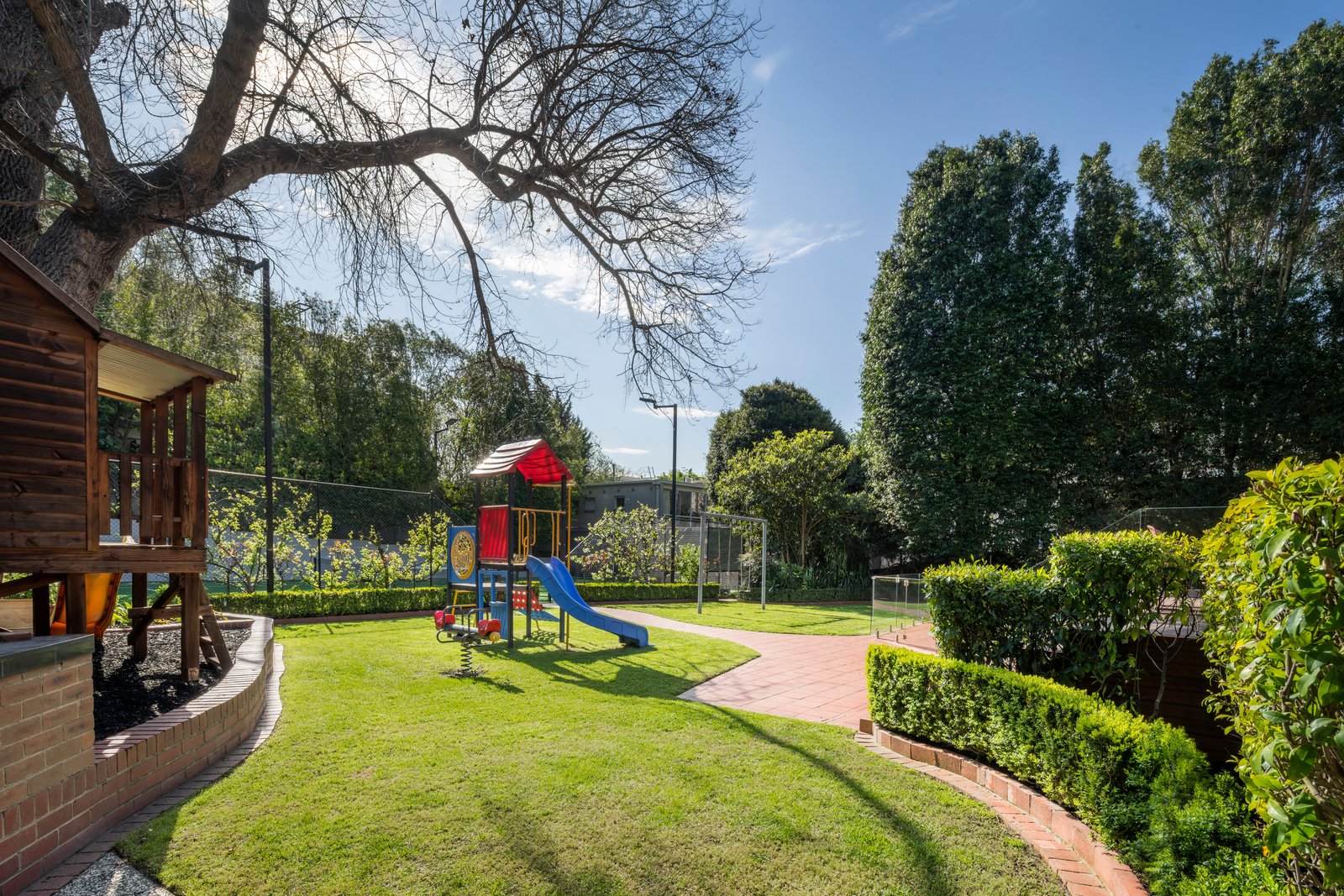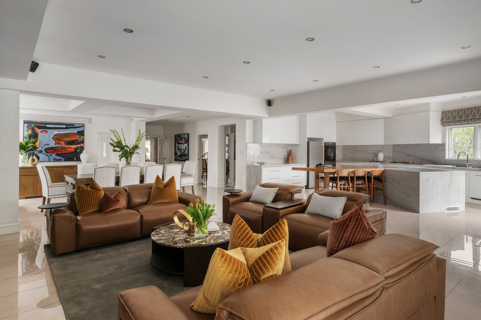 Transformed for contemporary living and large-scale entertaining, the informal living and dining domain extends to a chef-inspired kitchen appointed with a Wolf cooktop and ovens, induction cooking, and integrated refrigeration. A bespoke hardwood table inset within the quartzite island, complements the hosting appeal, with bi-fold doors connecting the family areas to the elevated game rooms and indoor-outdoor dining room, set above the pool and tennis court. Beyond, manicured gardens with brick pathways lead to a self-contained guest house, playground and relaxed outdoor zones, all privately enclosed by mature greenery.
