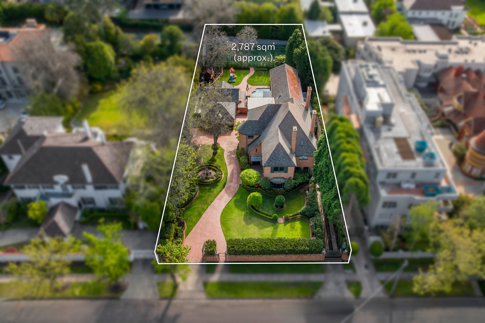 Commanding a rare landholding of 2,787sqm (approx) among Toorak’s most prestigious addresses, this magnificent 1928 English Revival residence unites distinctive period architecture with expansive family amenity, surrounded by park-like gardens, a pool and a north-south tennis court. Distinguished by its steep gables, red-brick driveway entry, and solid brick façade, the imposing foyer, rich in era-defining detail, leads into a sequence of elegant formal rooms, including dining, living, and a refined study, each enjoying verdant views and exceptional proportions.