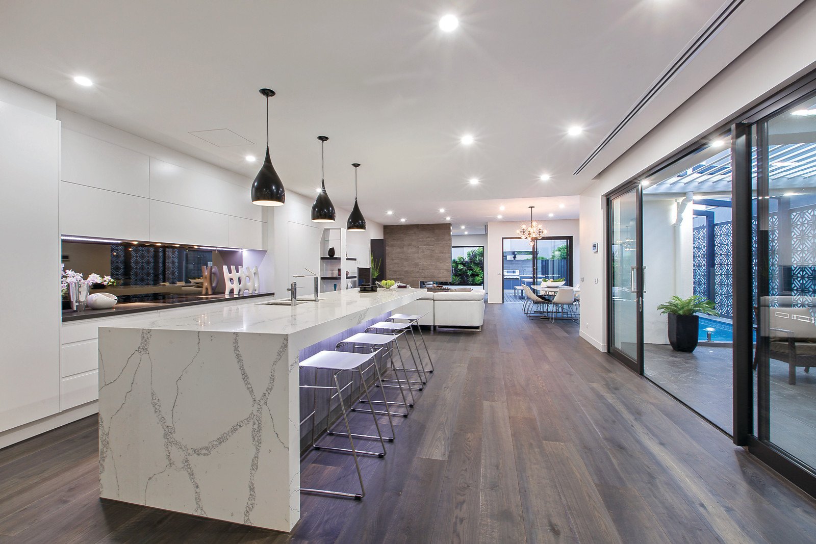 A striking monochrome exterior sets the tone for this boutique four-bedroom town-residence complete with innovative features, dedicated attention to detail and an outstanding level of luxury appointments and automation. Clean lines, natural materials, European oak floors and grand dimensions create flow between 400sqm of deluxe living spaces comprising three family living zones: formal living, open-plan living and entertaining (kitchen, sitting and dining) and a relaxed sitting room. A quite magnificent cook's kitchen features butler's pantry, soft-close cabinetry, SERVO-DRIVE opening, stylish stone benchtops and Calacutta island bench to complement a range of Miele appliances, Zip hydro tap and Villeroy & Boch detailing. Dramatic patio doors and walls of glass create a connection with a wraparound resort-style alfresco living area comprising vertical garden, well-equipped outdoor kitchen, saltwater solar-heated pool and an alfresco dining area complete with pergola and motorised blinds - the perfect setting for private relaxed entertaining. Three spectacular bathrooms feature imported European tiles, Gessi tap fitments, rain showers and the main bathroom features a freestanding natural stone bath. Three first-floor bedrooms share a light-filled rumpus room and study nook. A family-oriented location moments from Bay Street and the Beach enhances this easily-maintained home complete with a 200sqm basement housing garaging for four cars including a car turntable, gym, communications room, storage and a superb home-theatre room. Additional features include concealed automatic blinds, Daikin heating and cooling, ducted vacuum, 3000 litre underground water tank, video intercom, security system, CCTV and smartphone integration.