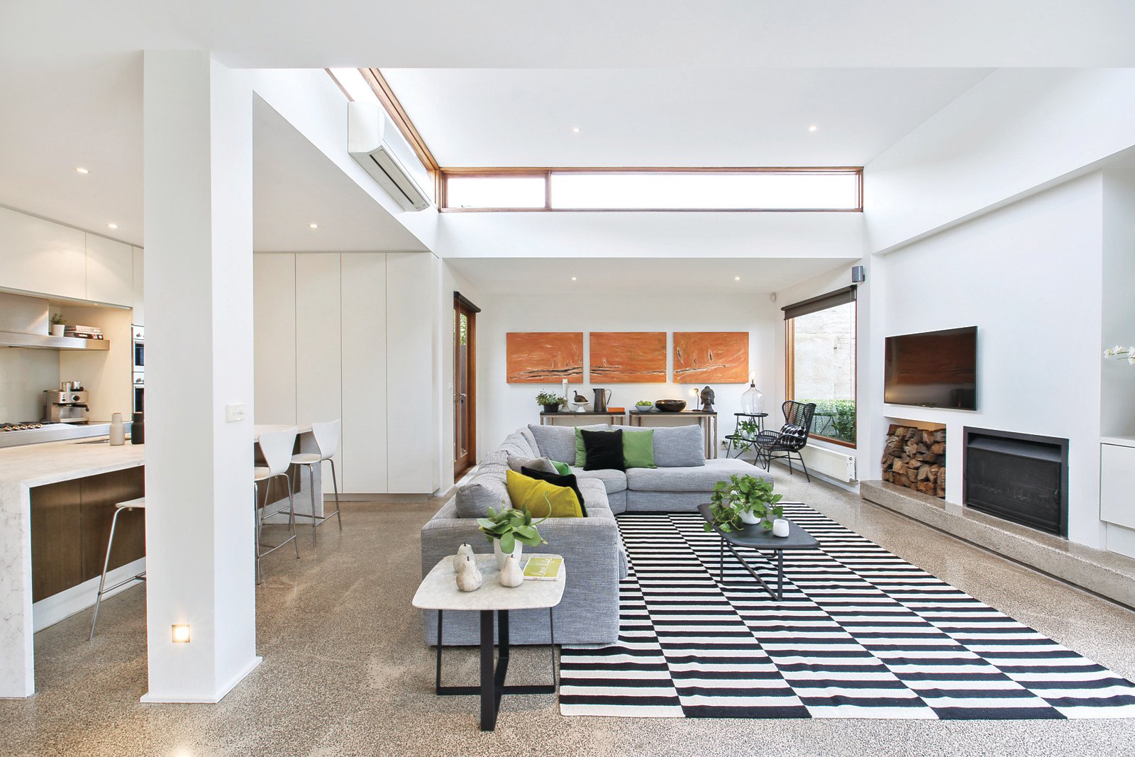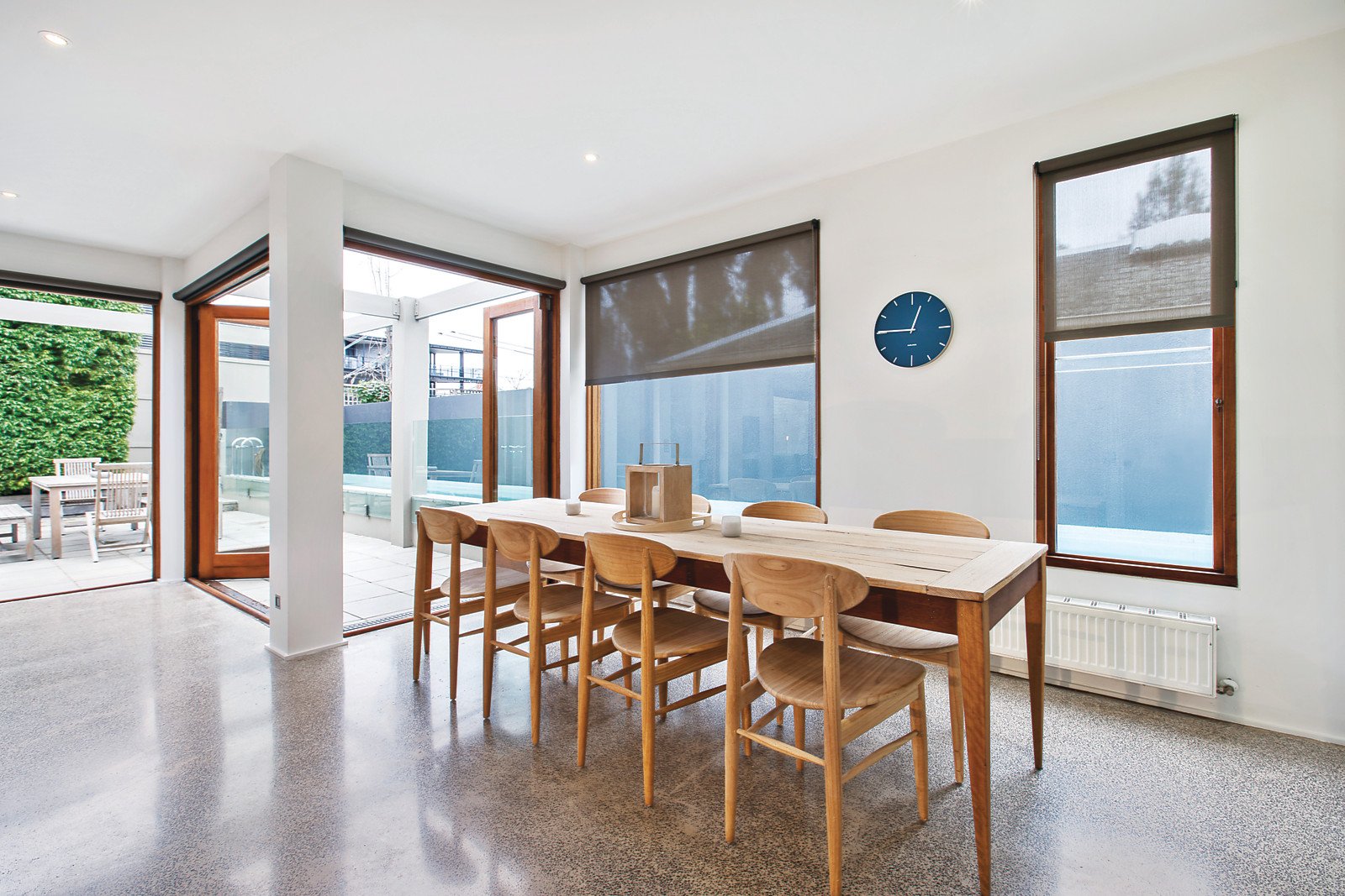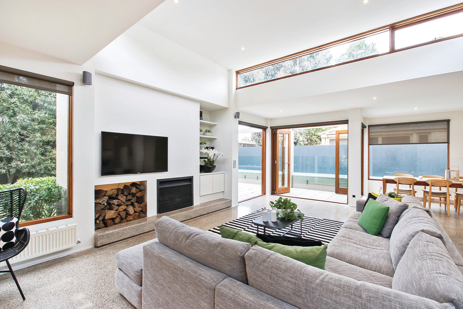 The spacious open-plan living and dining areas are flooded with an abundance of northern light, high ceilings, polished concrete terrazzo floors, an open fireplace and cosy study/reading nook - all stunningly overlooking the pool. The gourmet kitchen boasts marble bench tops, Miele appliances and clever storage solutions. Bi-fold doors seamlessly open the living areas out to a private northwest landscaped garden with heated lap pool, making this the perfect entertainer.
