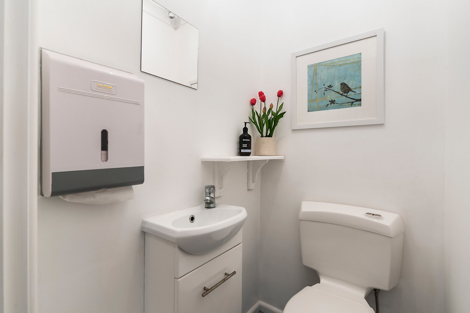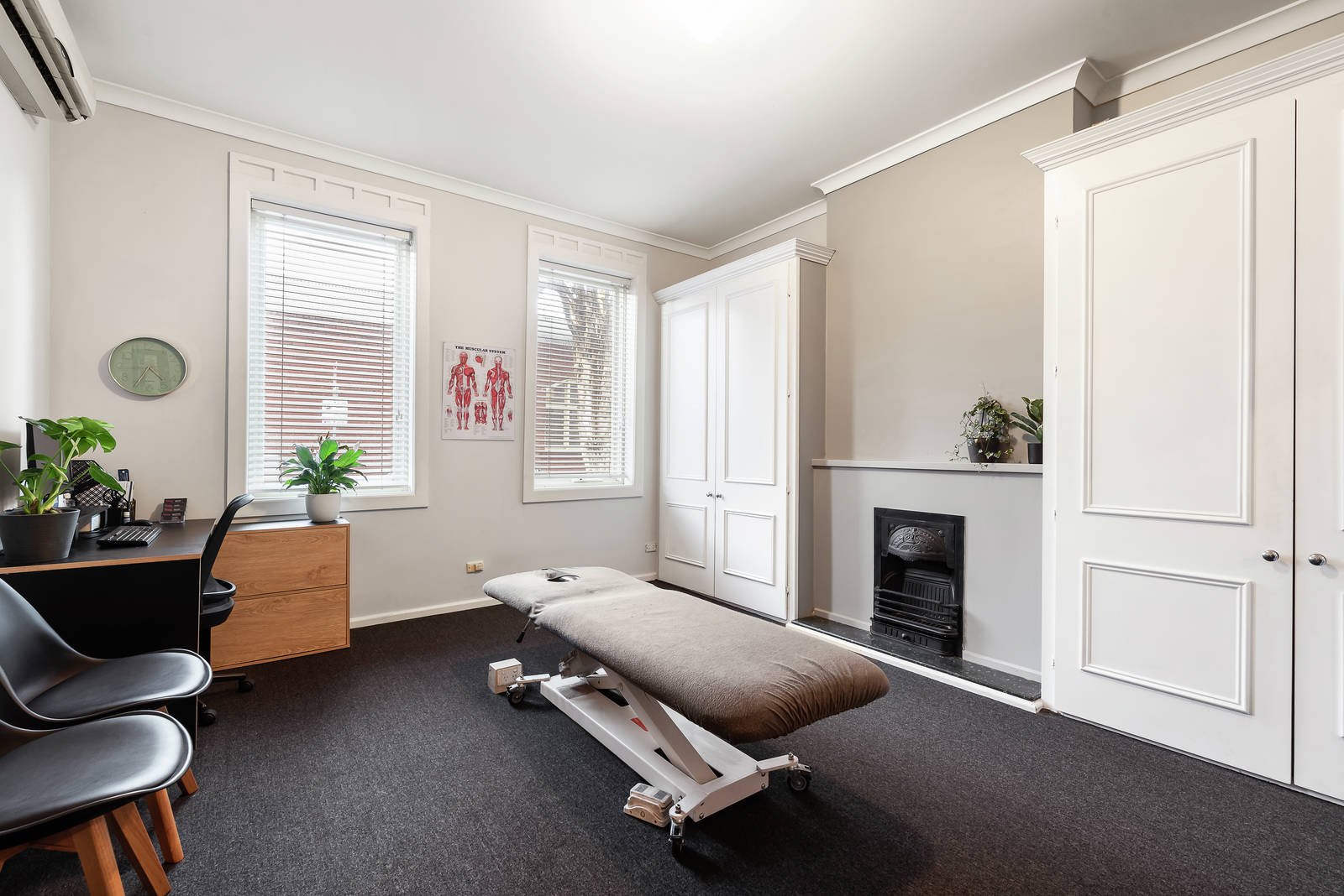 Period features including Baltic pine floors and high ceilings define the central entrance hall which flows through to three generous consulting rooms or bedrooms, a powder room, and a bathroom with Euro-laundry. The reception or living/dining room and fitted office are adjacent to a well-appointed modern kitchen opening to an outdoor area offering secure parking for 2 cars (STCA).