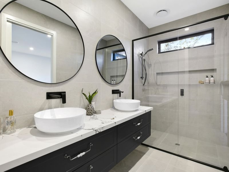 A ground-floor master suite boasts a large walk-in robe and luxe ensuite adorned with stone-topped double vanities and floor-to-ceiling tiling. Secondary accommodation upstairs is served by a family bathroom featuring a freestanding tub and separate WC.