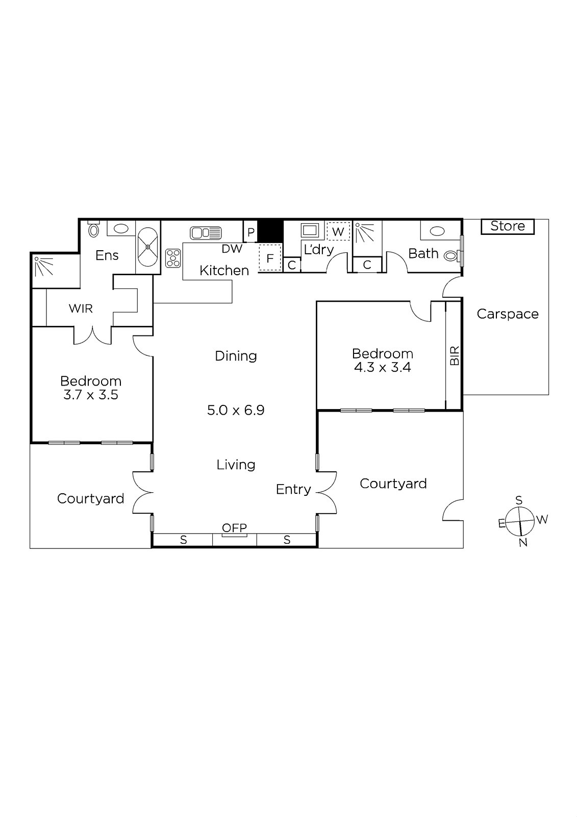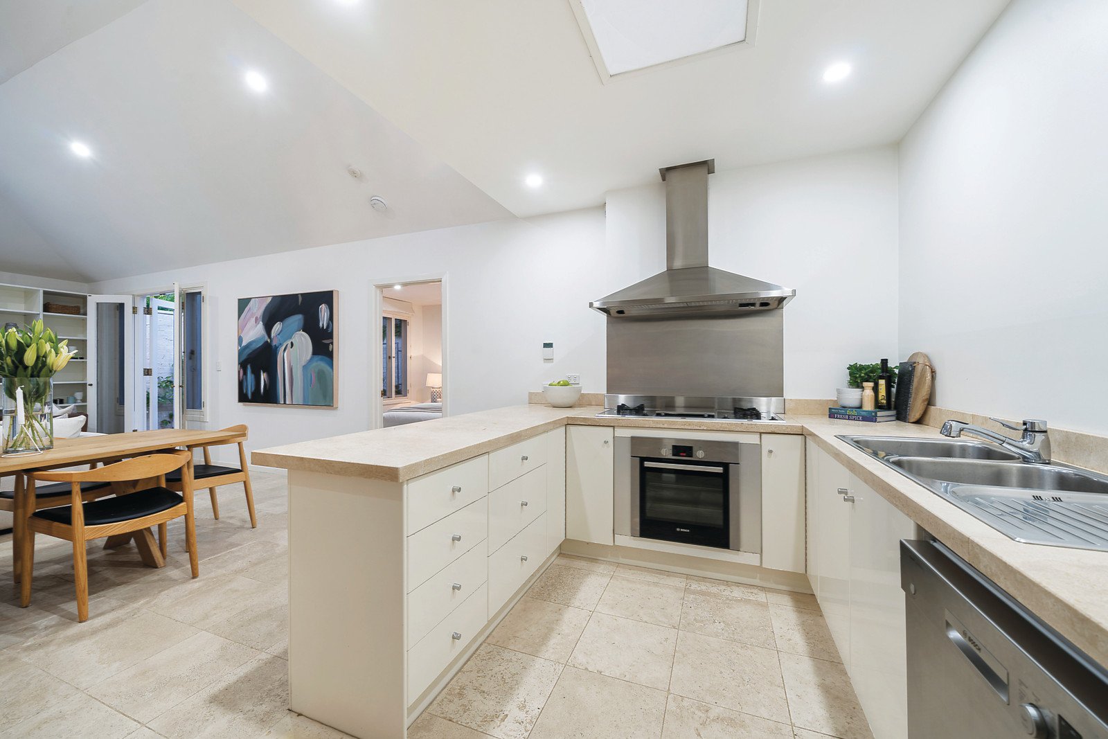 A large living/dining area featuring OFP is framed by both north-facing courtyards and includes an open-plan kitchen defined by stone benchtops and European appliances.