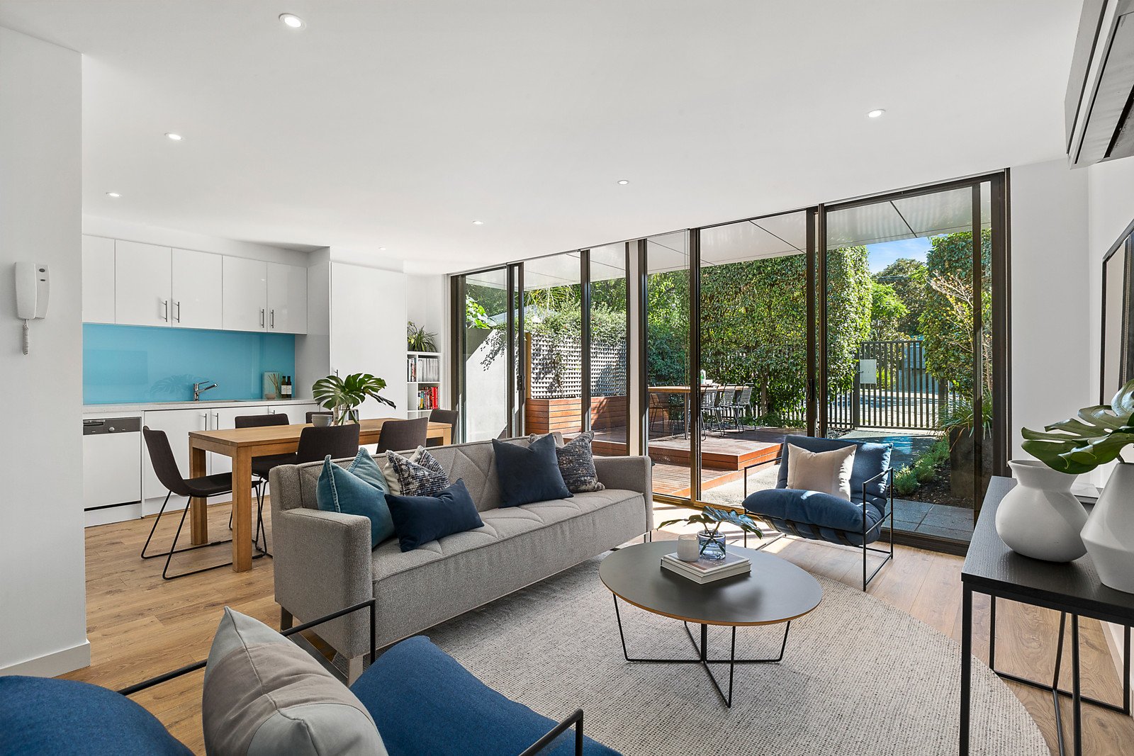 Miele appliances, stone bench tops and premium soft close cabinetry form an attractive combination in a kitchen that overlooks open-plan living where floor-to-ceiling glass sliding doors open easily to a large, tree-surrounded, courtyard with a deck on which the aspirations of al fresco diners are most stylishly met. Offering, also, the rare prize of two secure basement parking spaces, the home is fully secure with its own discrete entry and intercom entry as well as a pristine designer bathroom with European laundry, robes in each bedroom, a second courtyard off the master bedroom and split system heating and cooling.