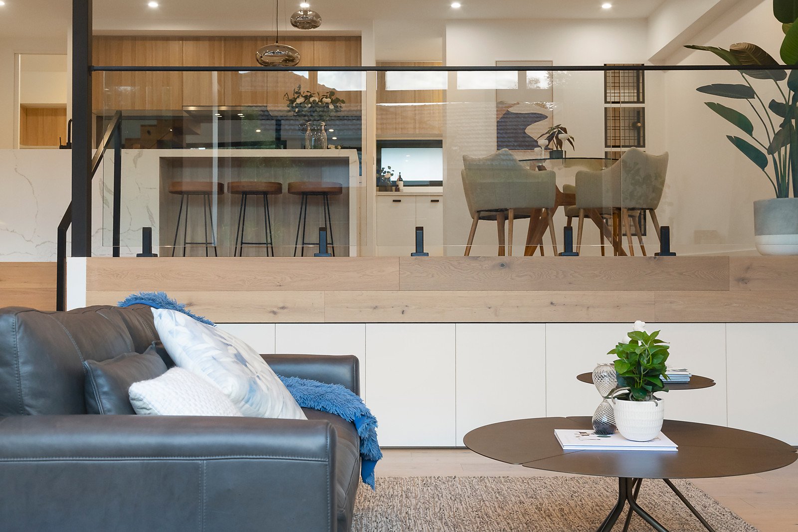 The spectacular scale of the split-level floorplan is enhanced by soaring ceilings and vast expanses of north-facing glass. Oak floors flow through from the entrance to a premium kitchen boasting stone benches, ample storage, Bosch appliances and gorgeous casual dining area looking out to a private north facing courtyard bathed in brilliant sunshine. A separate open plan living space is generously proportioned and light-filled to cater for a variety of needs.