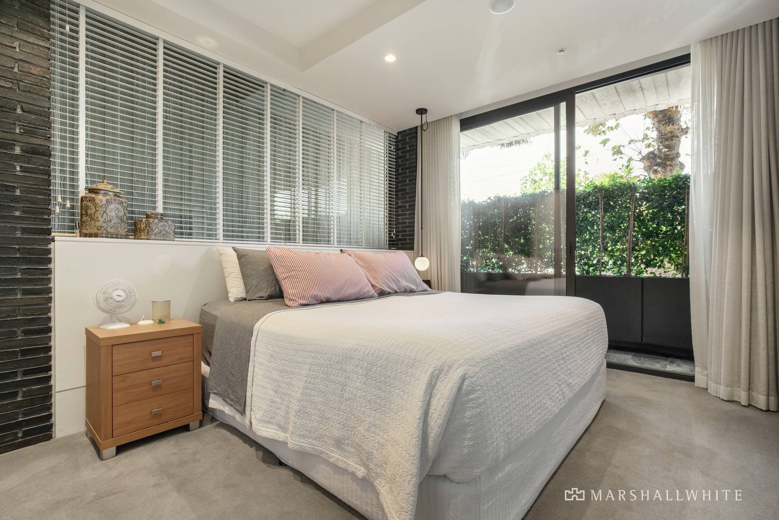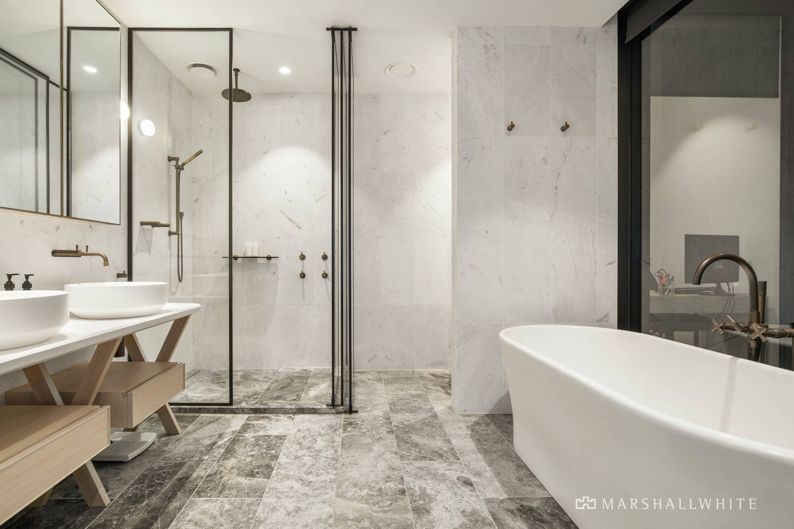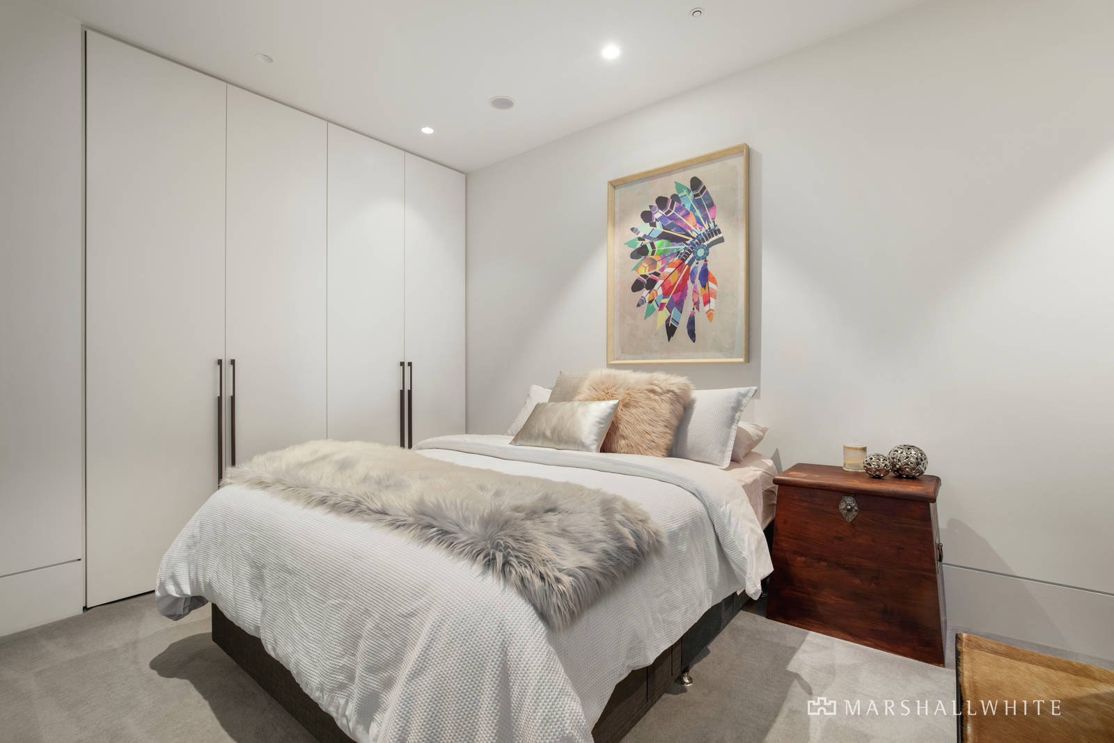 Beautifully appointed throughout, it features a lavish palette of honed Grey Aether marble, custom oak joinery and aged brass tapware. The welcoming entrance hall introduces an open plan living and dining room with a fitted cocktail cabinet and deluxe gourmet kitchen boasting Gaggenau appliances, opening to a covered alfresco with direct gated access to Pine Avenue. Both bedrooms offer ample robe space, ultra-stylish designer en-suite with a freestanding bath, a second double bedroom with access to the terrace.