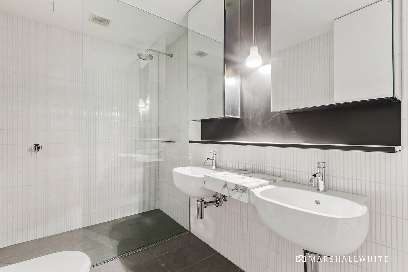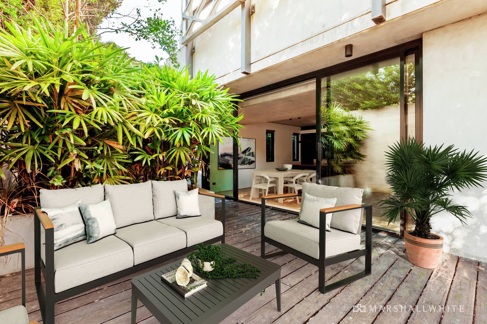 A gallery hallway with a clever built in study nook introduces the generous main bedroom with designer en suite and loads of built in robes, a second double bedroom with robes and a stylish bathroom. Both bedrooms access a private decked courtyard. Oak parquetry floors, bespoke timber joinery and sensational polished concrete ceilings are showcased in the expansive open plan living and dining room with a gourmet kitchen boasting Miele appliances and a timber and marble island bench. Glass sliders open the living to a glorious private northeast decked courtyard and lush garden bed all beneath a canopy of neighbouring trees. It's an entirely private leafy venue for al fresco dining and entertaining.